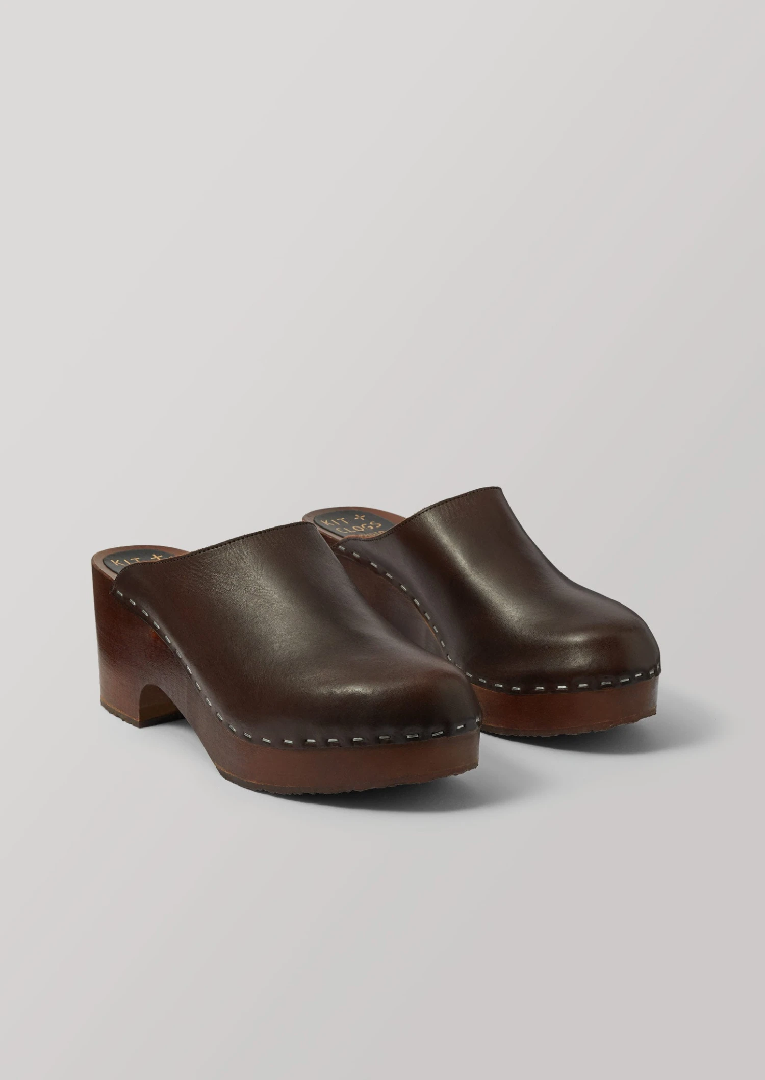 Platform mules handcrafted by Kit and Clogs Studio in a traditional clog factory in Sweden. Made from vegetable-tanned leather with a sturdy lime wood sole, then finished with a recycled rubber grip. Over time, the leather will gently soften and mould to the size of your feet. Being handmade, each will vary slightly.