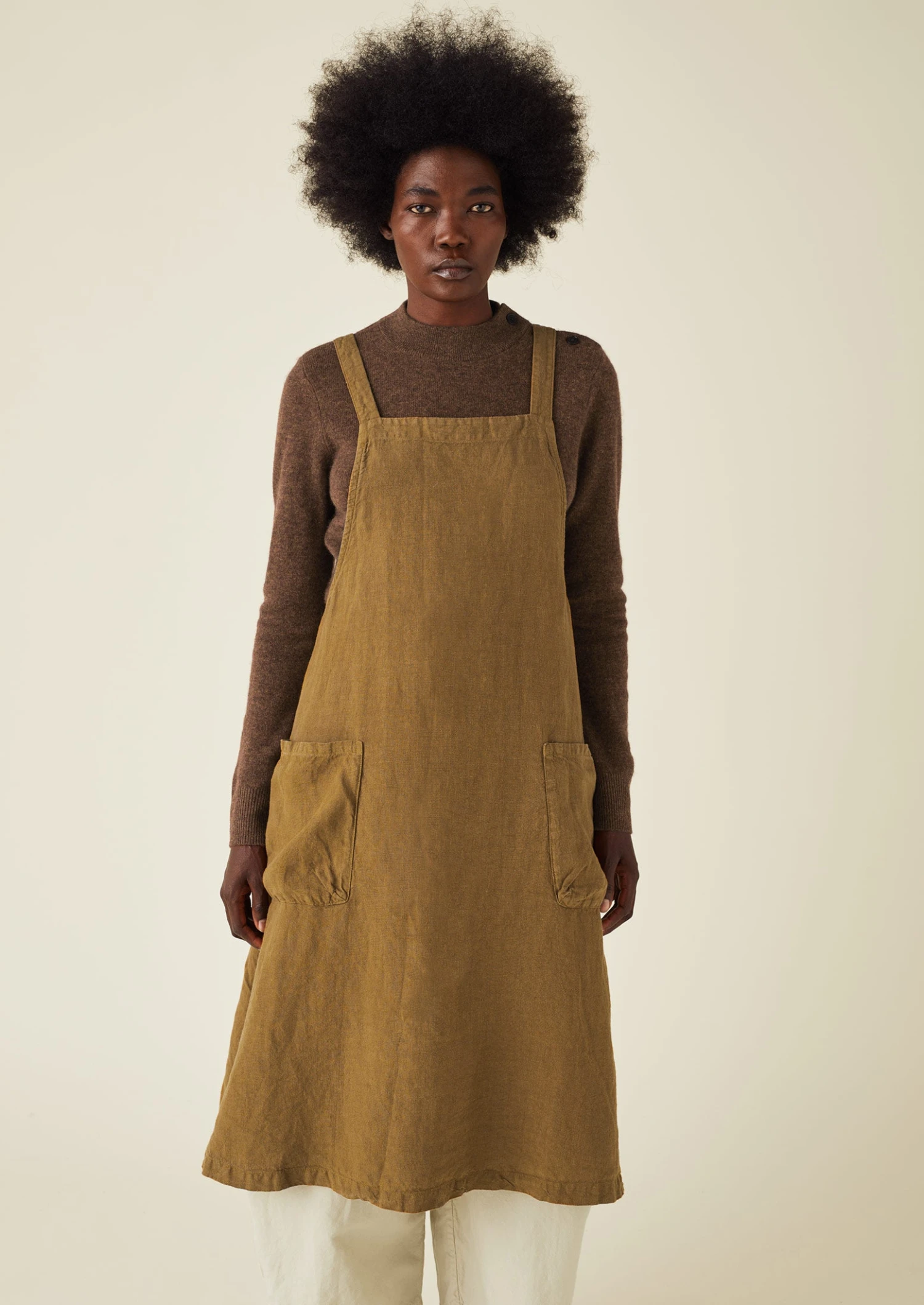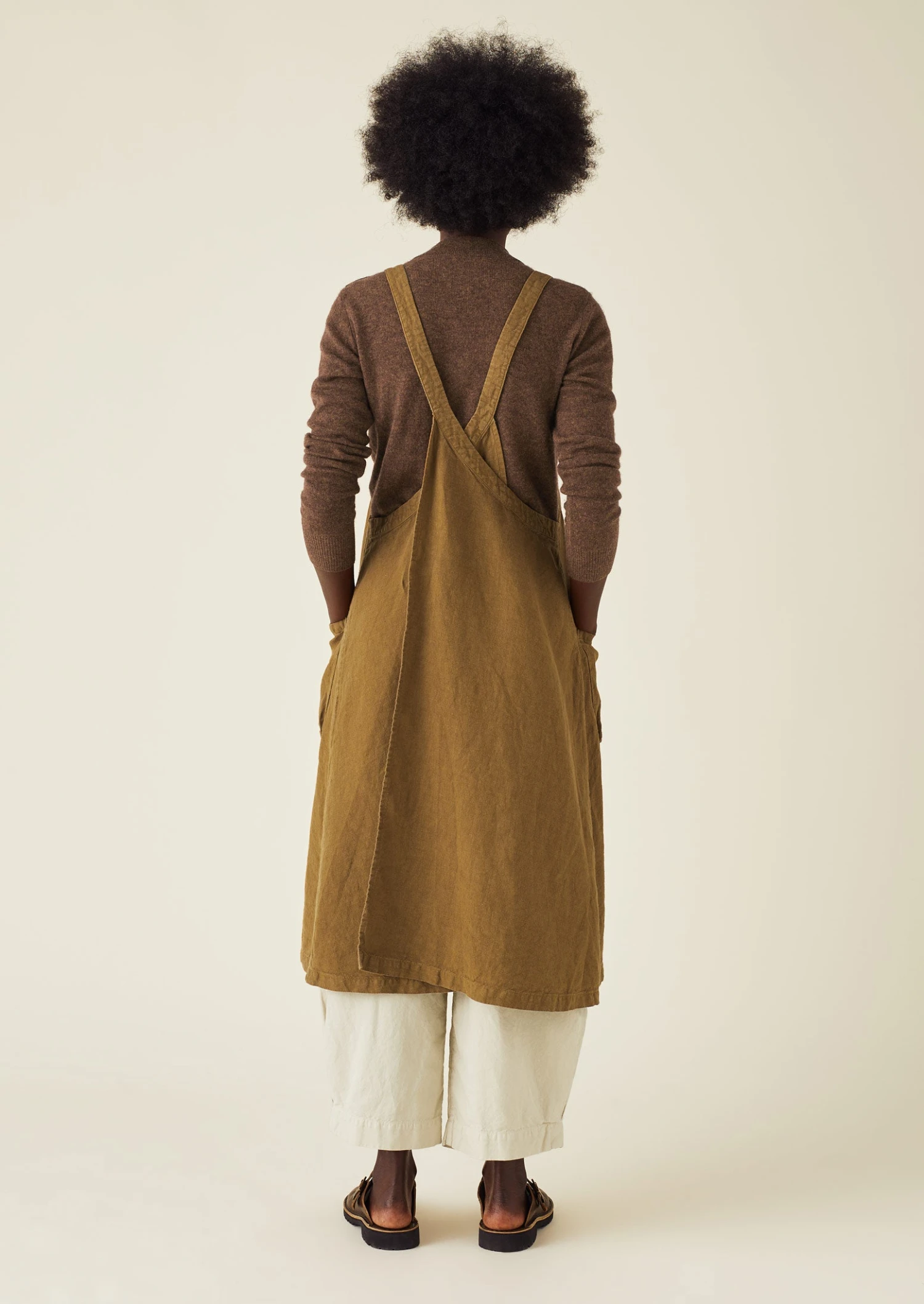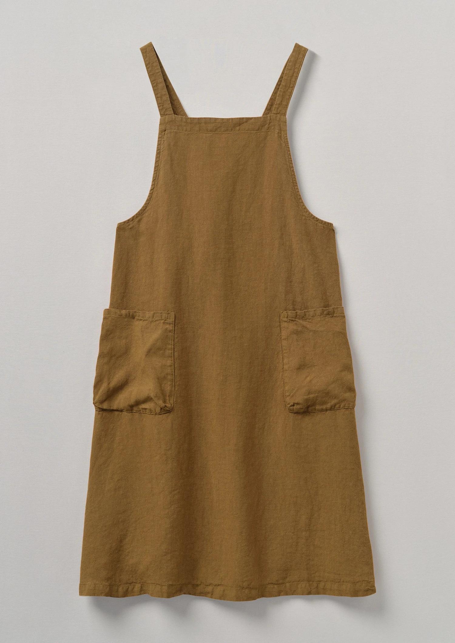 Pinafore apron crafted from hardwearing, slubby linen, then garment-dyed. Cut to a roomy shape with a square neck, turning to reveal crossover straps at the back, then finished with large patch pockets.