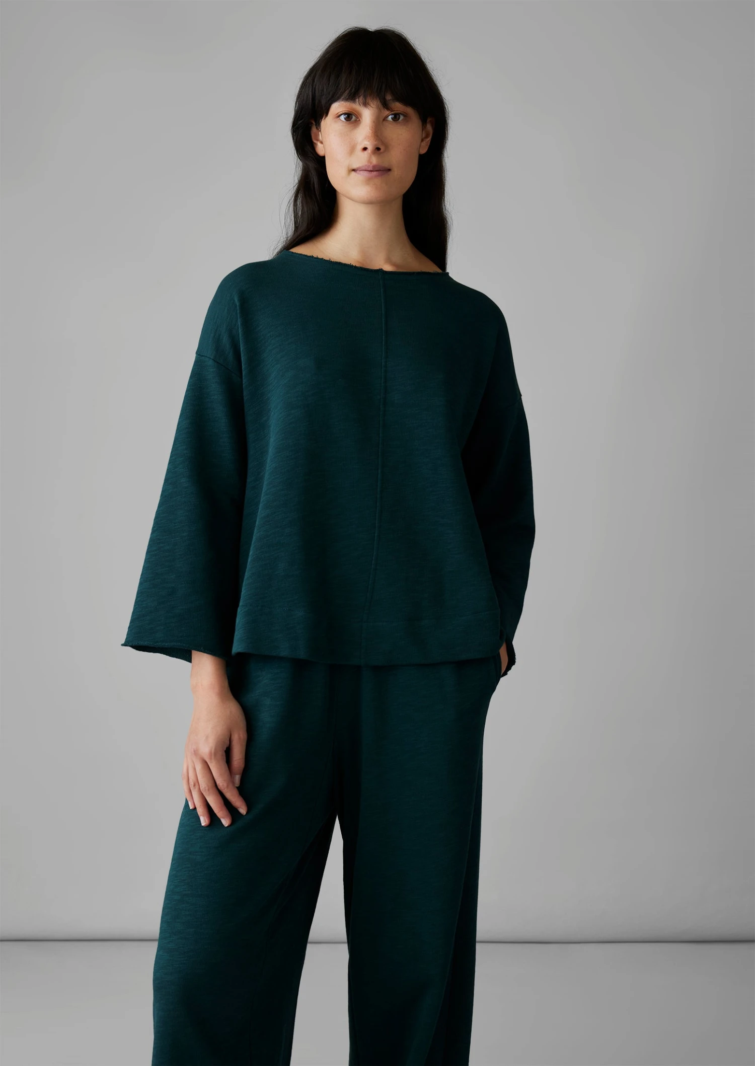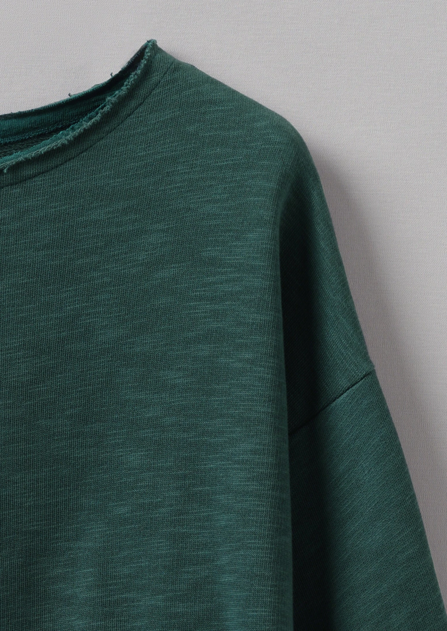 Loopback cotton jersey. Easy shape. Back cotton herringbone hanging loop. Dropped bracelet-length dolman sleeves. Raw-edged neck and cuffs. Front and back central seams. Low-hip length.