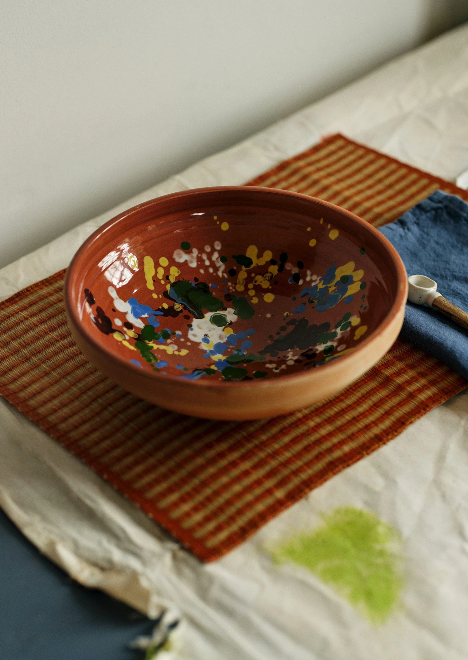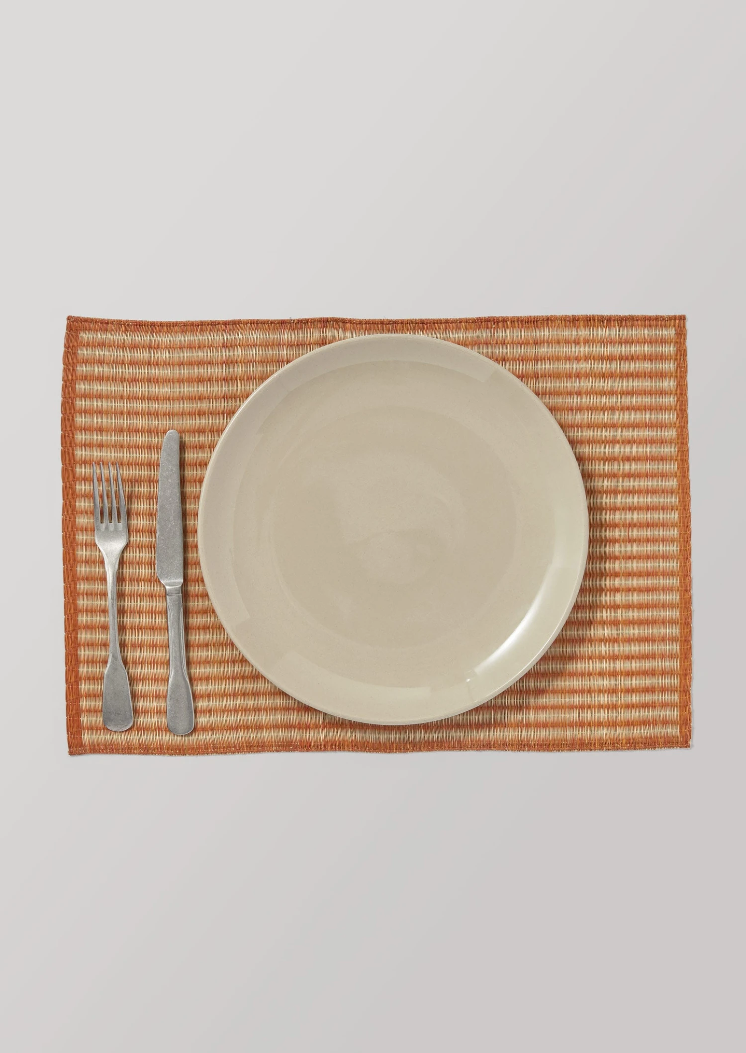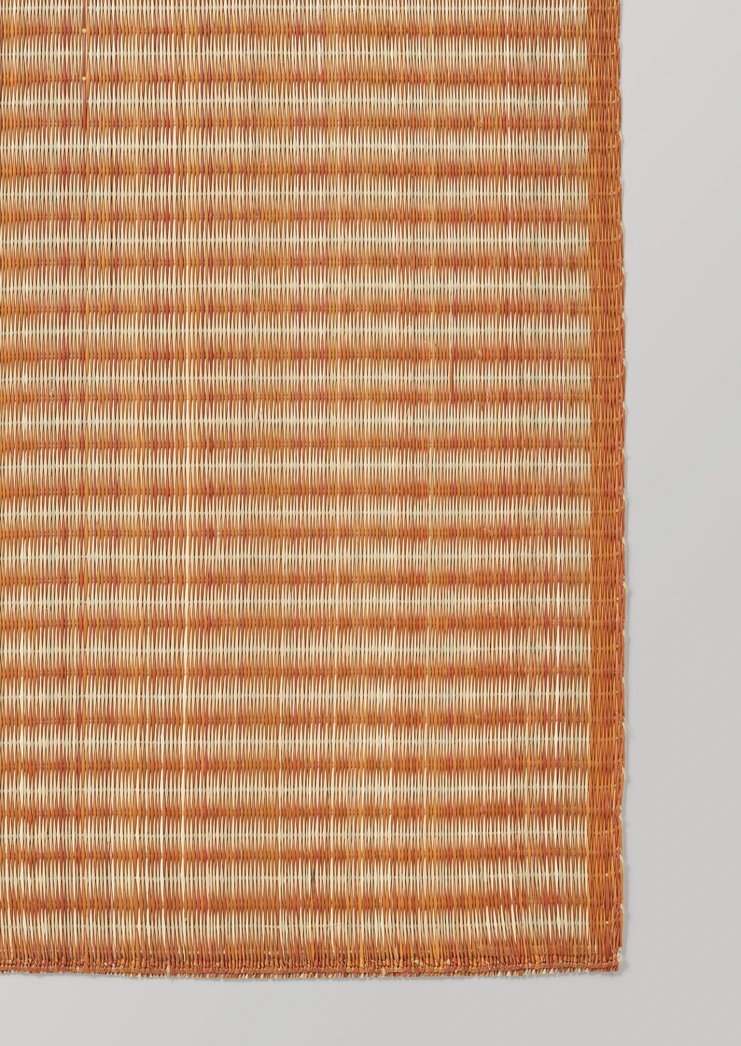 Madur grass placemat handwoven and hand-dyed by artisans in north-east India. Created in collaboration with a Fair Trade cooperative in Kolkata. With contrasting stripes and tactile knotted edges. The natural colourway is dyed with mud. With tonal variation, which naturally differs from piece to piece.