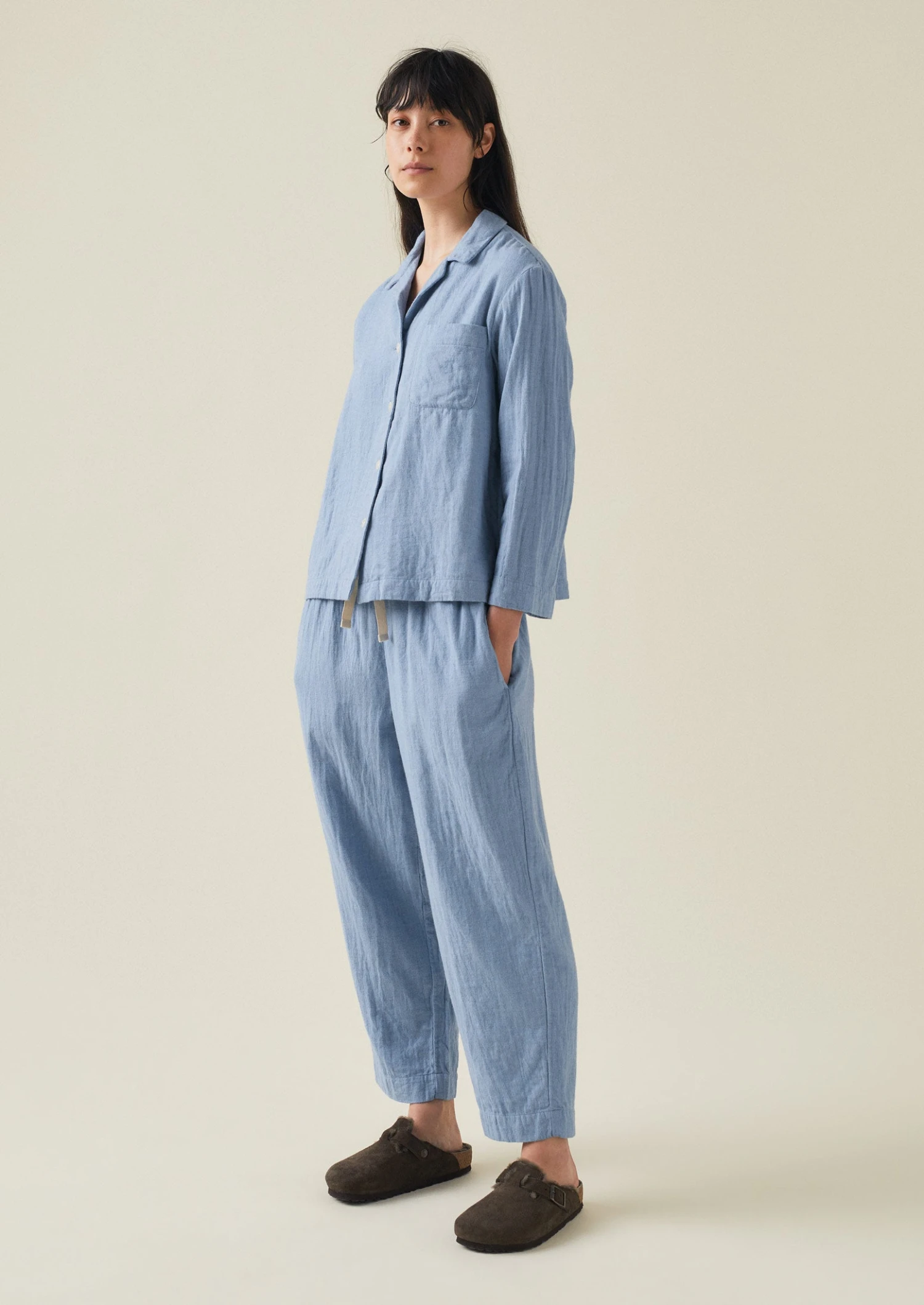 Our Mia pyjamas are crafted from double-faced cotton which is soft against the skin. The top has a back hanging loop and gathers, while the trousers have an elasticated drawstring waist and side pockets.