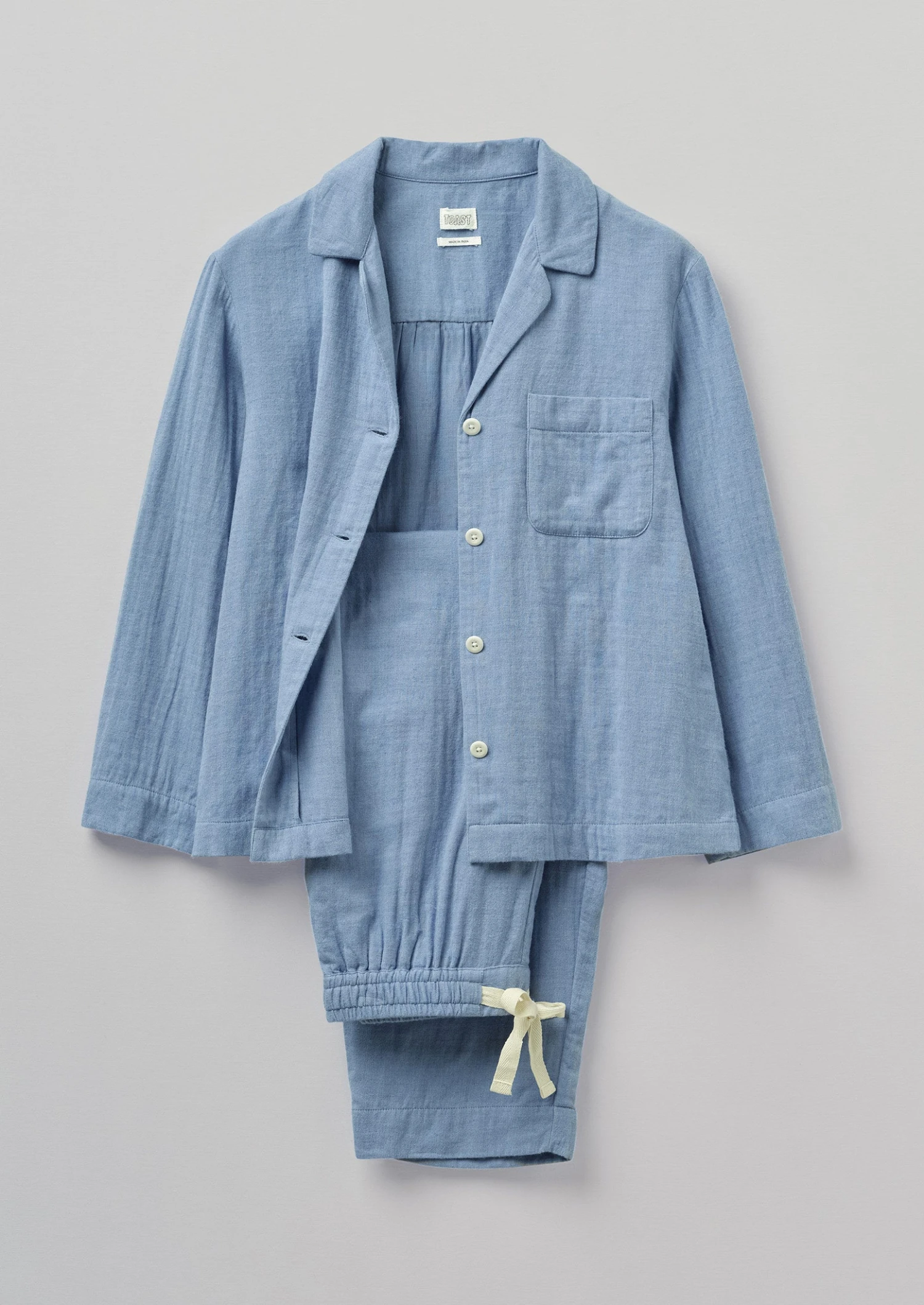 Soft double-faced cotton. Top: Back hanging loop. Back gathers. Chest patch pocket. Corozo buttons. Trousers: Elasticated drawstring waist. Side pockets.