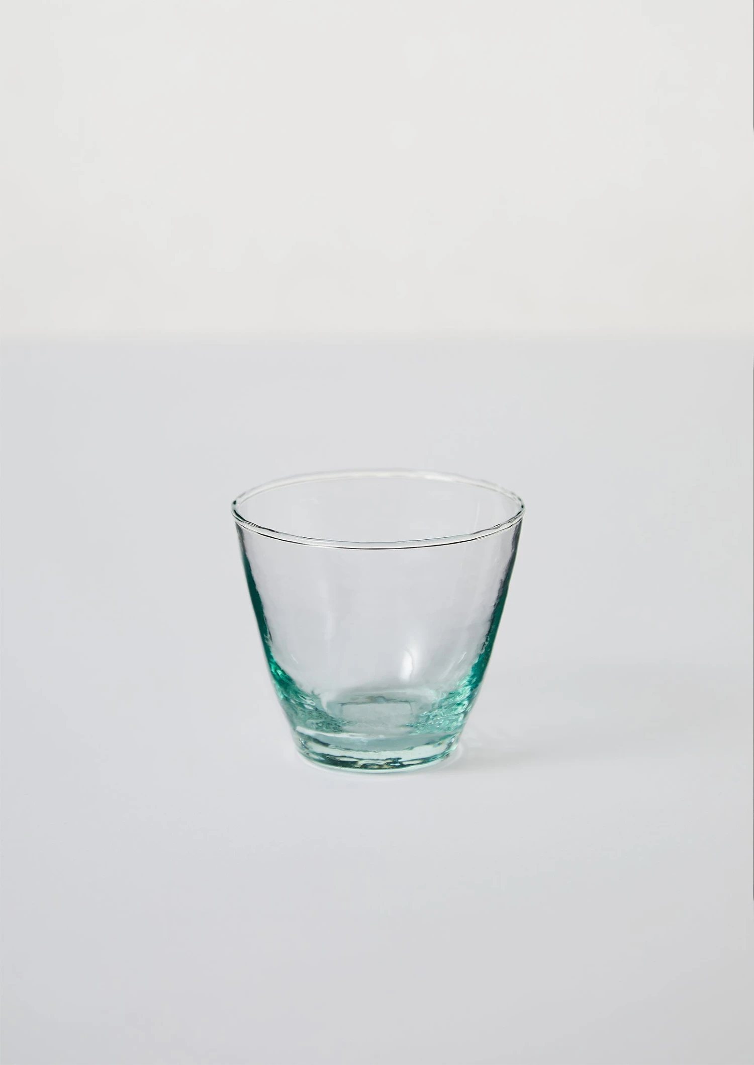 Set of six mini glasses hand-blown from recycled glass at the Beldi Country Club in Marrakesh. The group of 60 artisans are from the last glass factory in Morocco. They recycle two tons of glass a day, with any waste from the process melted down to be used again. Shaped to a small form with thick walls, slight warps, marks and air bubbles, which are traces of the artisanal process.