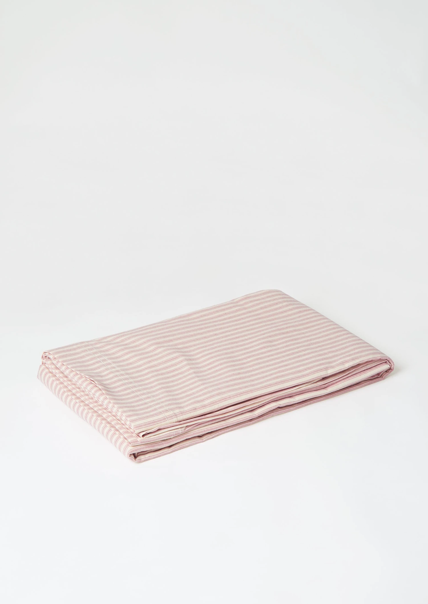 Traditional woven ticking stripe bed linen in soft, weighty, organic cotton. Two rows of satin stitch along the edge of the sheet.