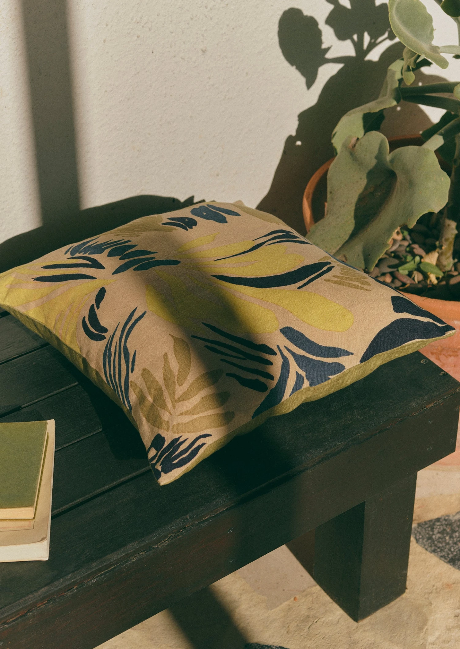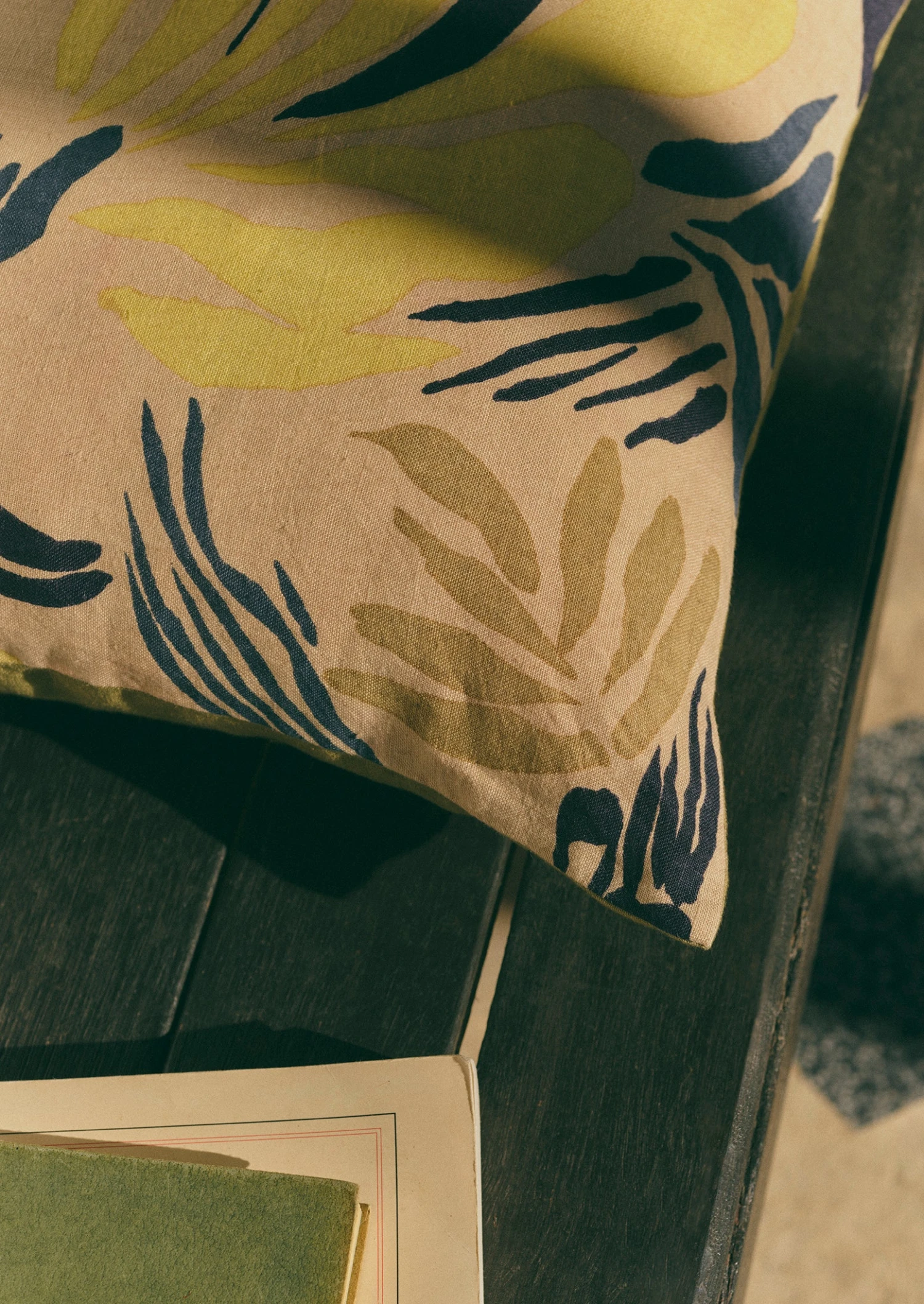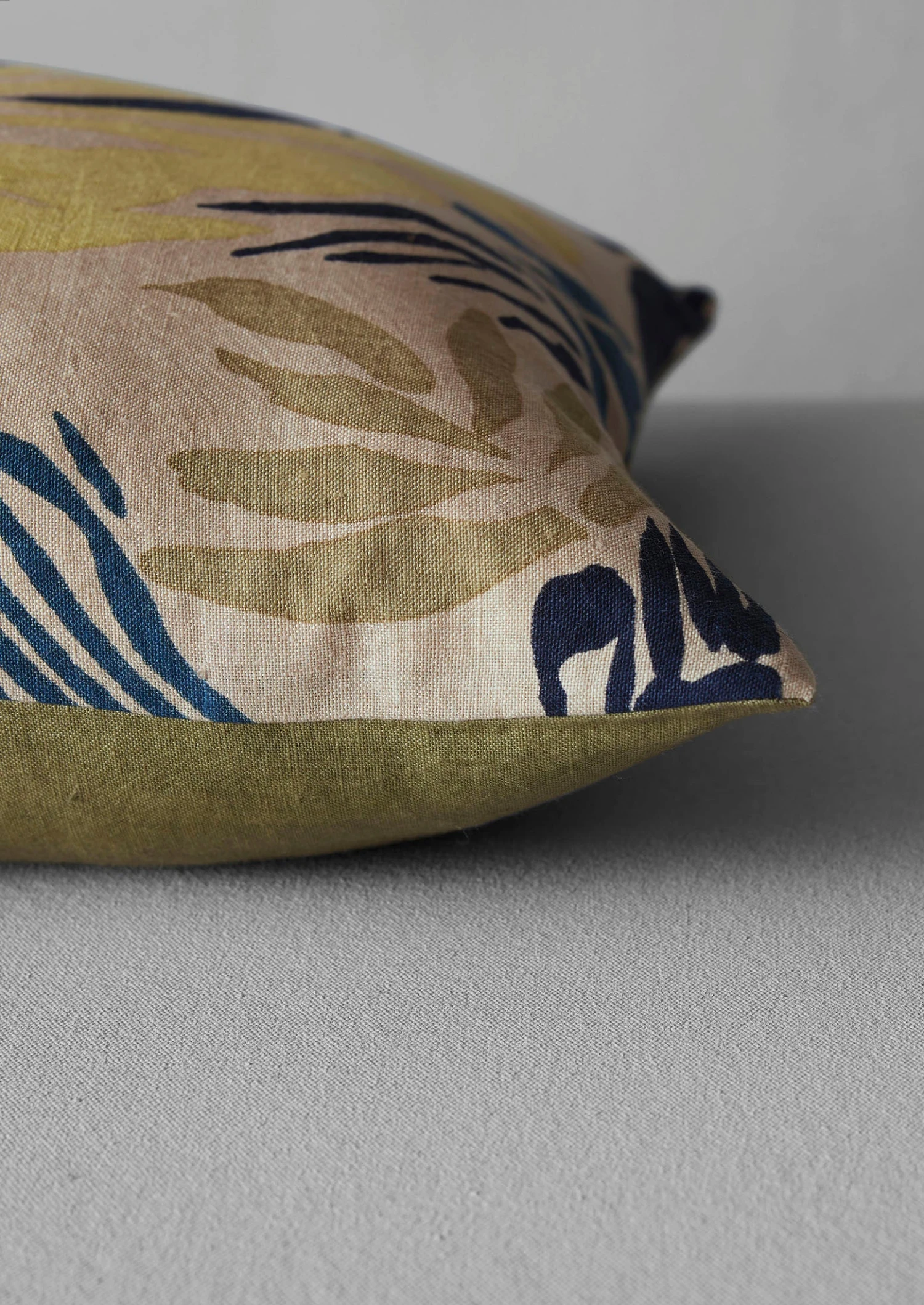 Linen cushion cover hand screen-printed in India with a painterly floral pattern. With a plain dyed linen reverse and neat concealed side-seam zip. To fit a size 46 x 46 cm Wool Cushion Pad.
