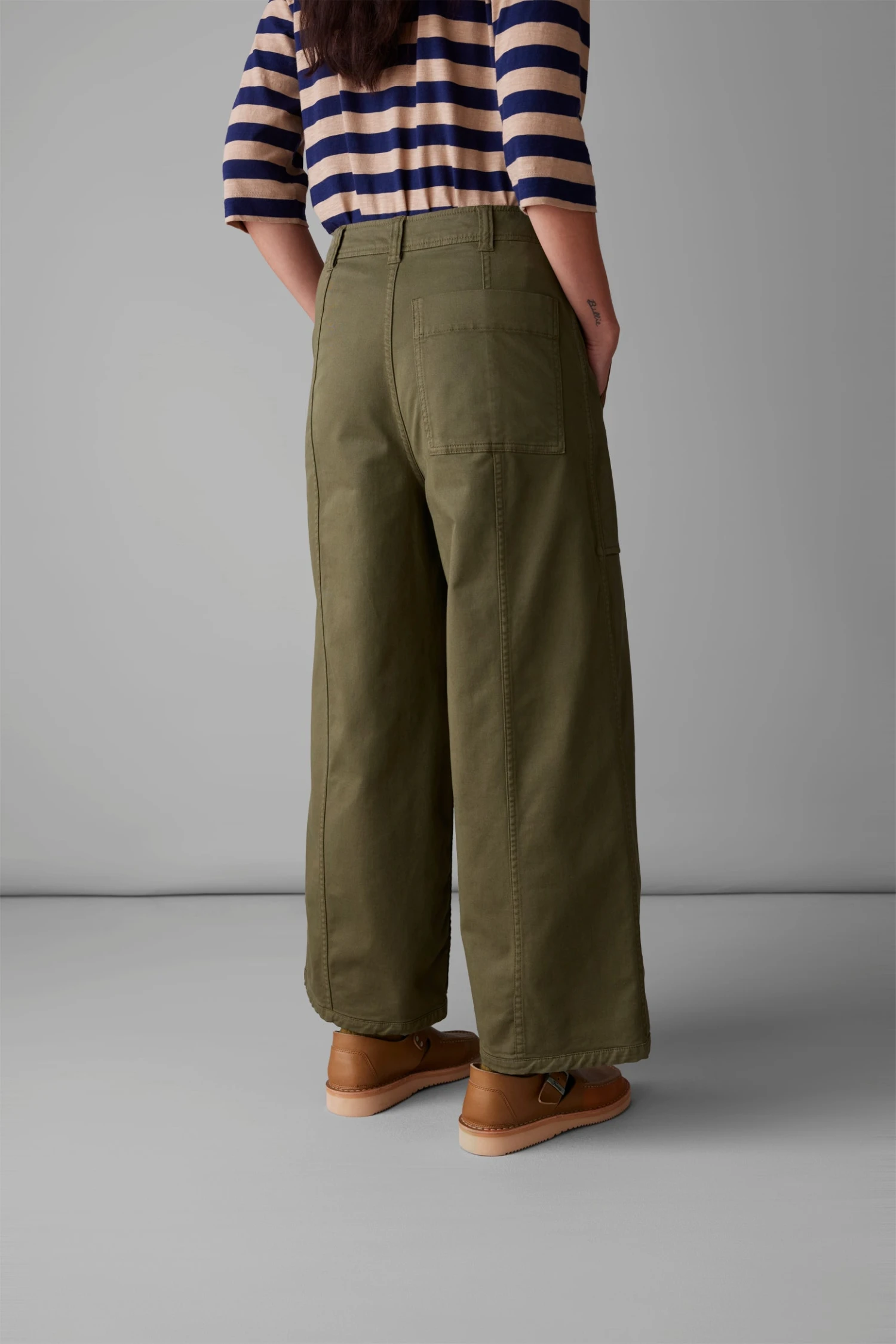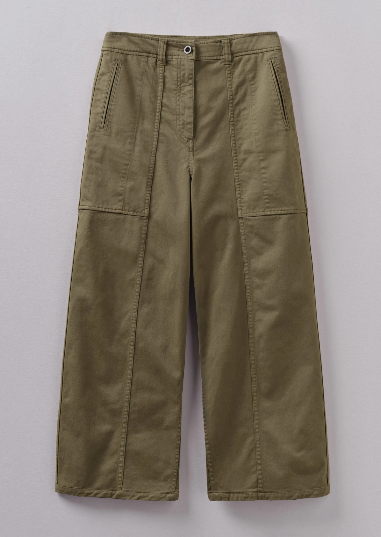 Cotton twill. Garment-dyed. Panelled construction. Belt loops. Side jet pockets. Back patch pocket. Wide legs. Ankle-skimming cuffs. Zip and corozo button.
