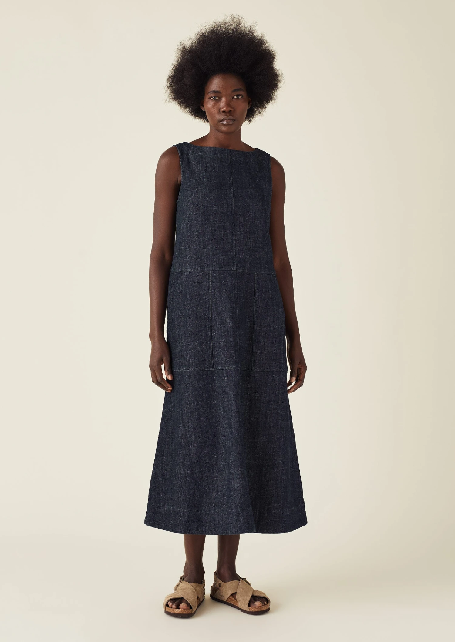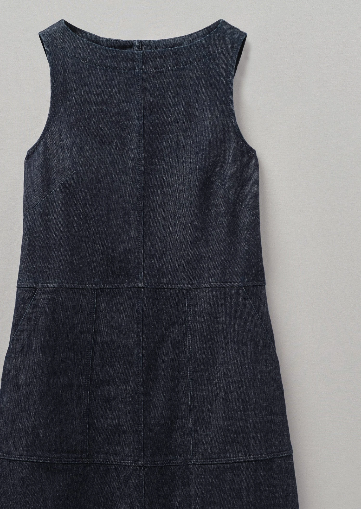 Our pinafore dress is crafted from denim woven from organic cotton, which is dyed with a technique that uses up to 70% less water than regular processes. With a panelled construction and large patch pockets, including one on the back.