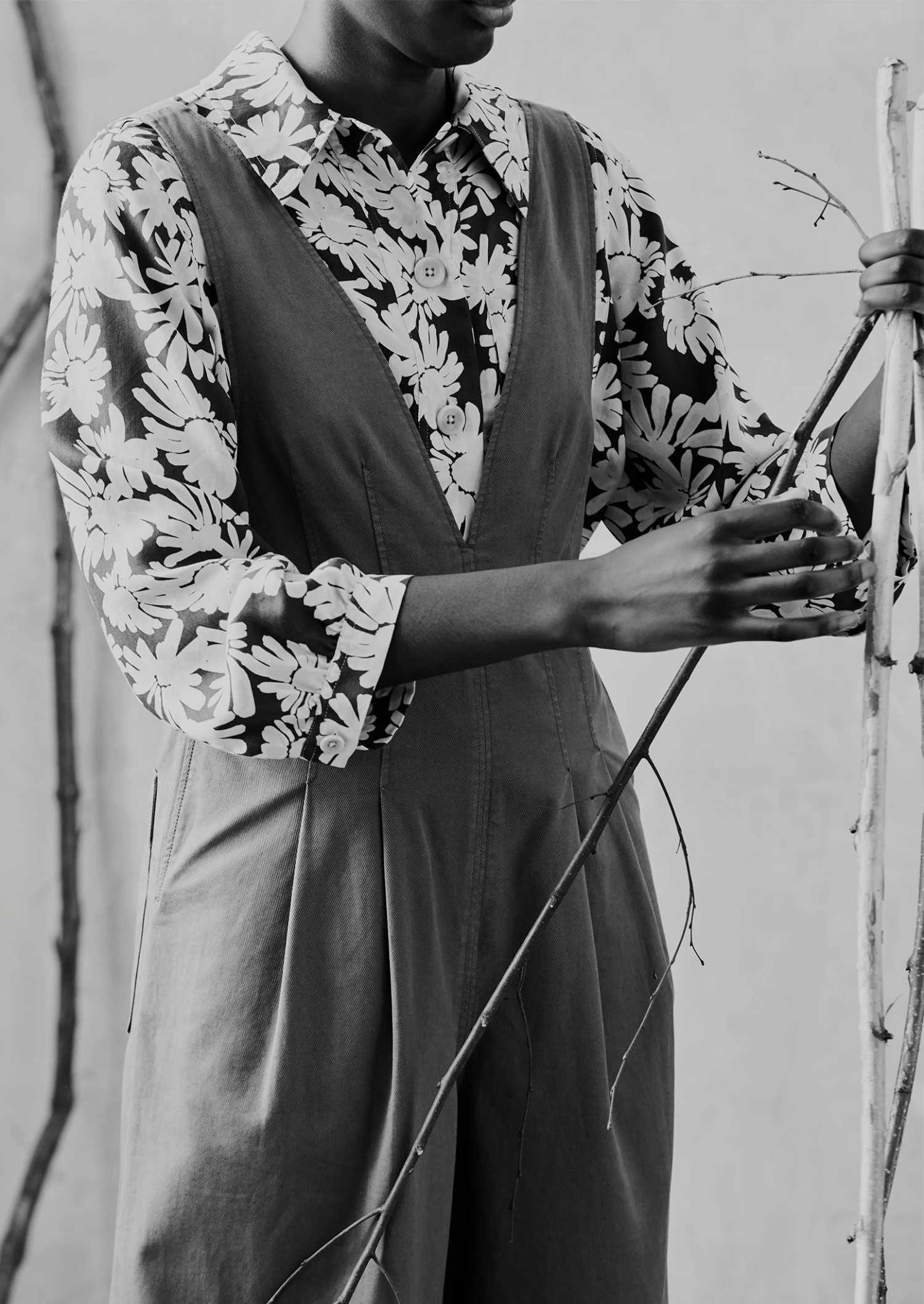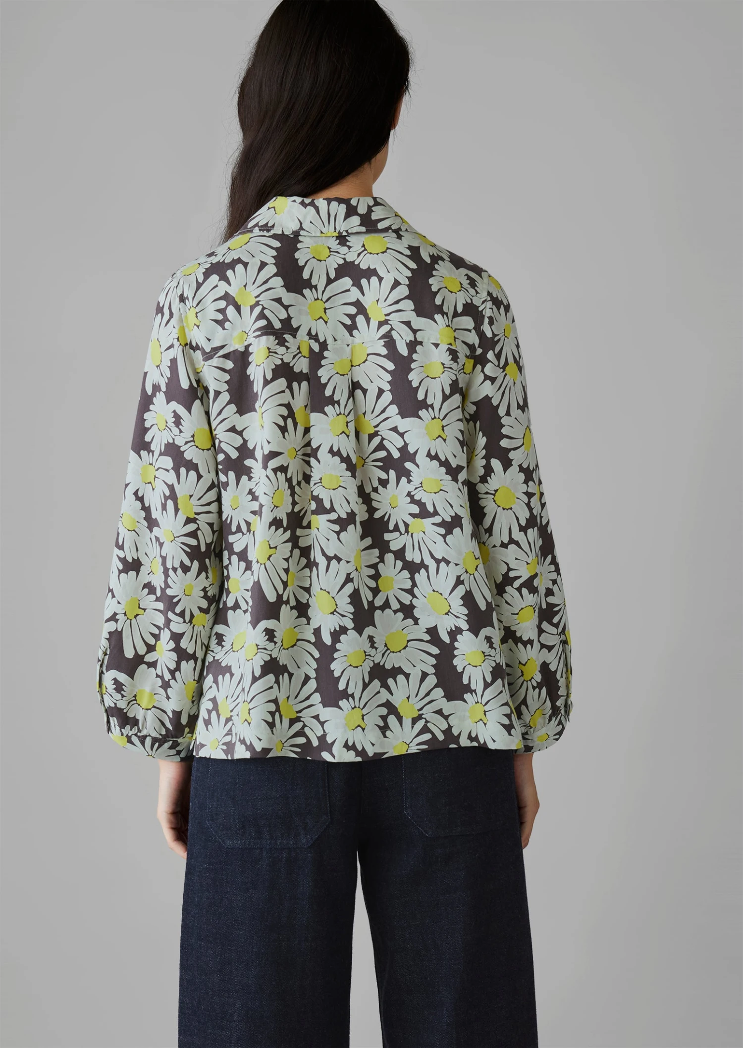 Crepe derived from wood pulp. Daisy print. Exaggerated collar. Chest patch pocket. Back yoke panel. Back box pleat. Side hem slits. Corozo buttons.