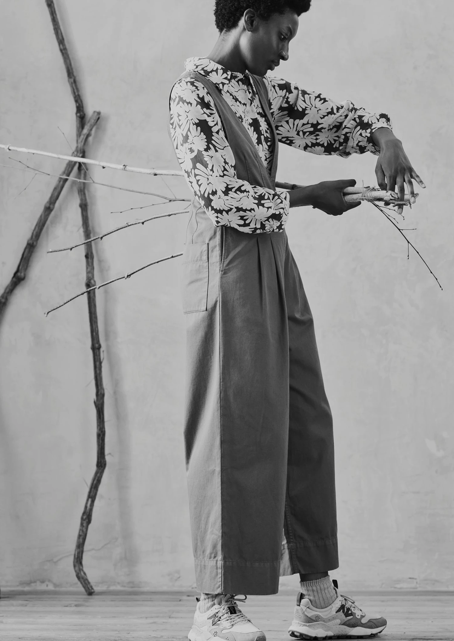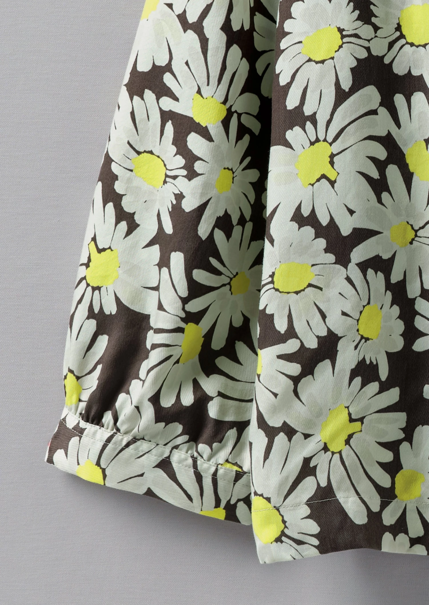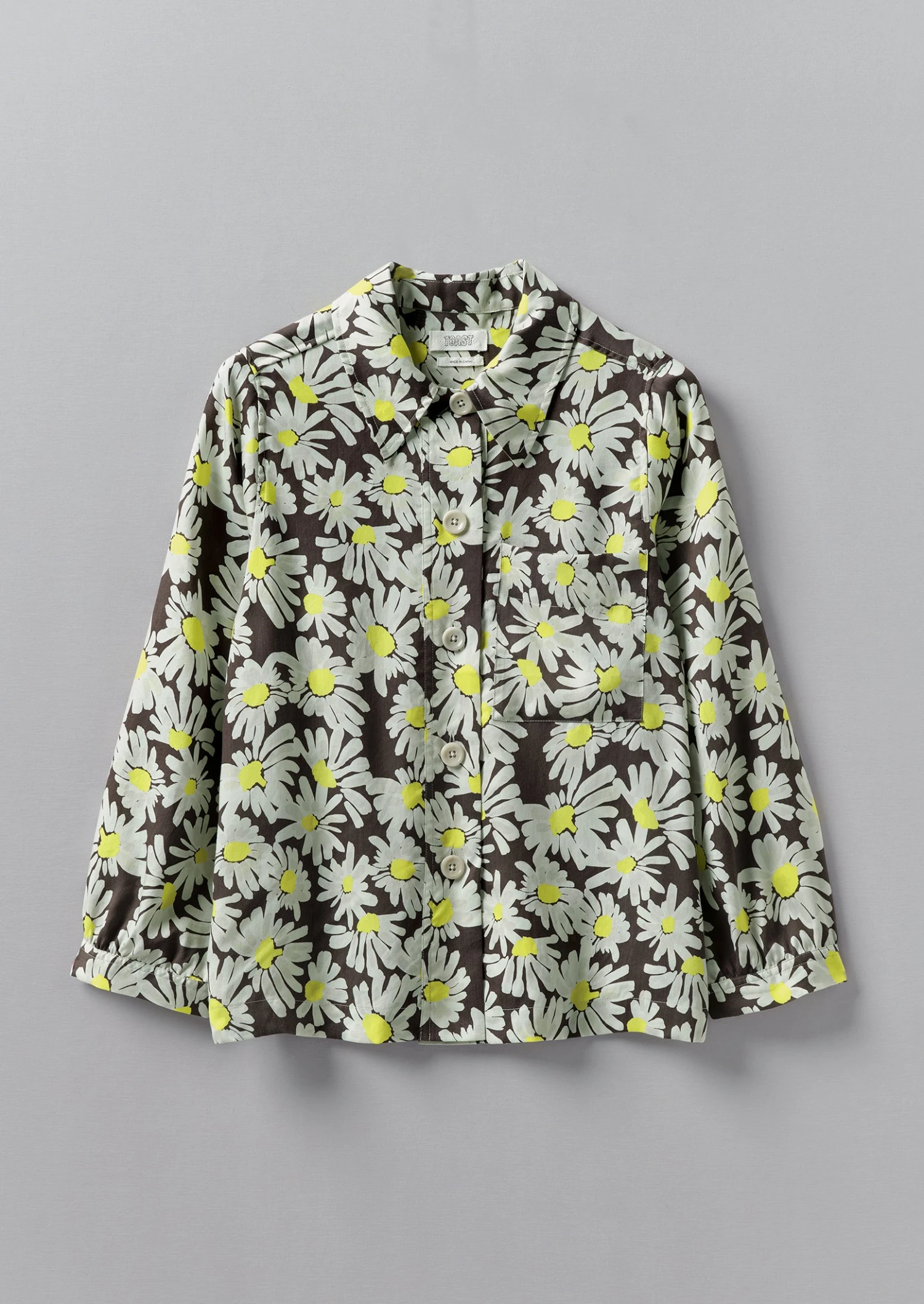 Our carefree daisy-print shirt has a large patch pocket which balances the exaggerated collar. Crafted from crepe derived from wood pulp to a boxy shape, then accented by corozo buttons.