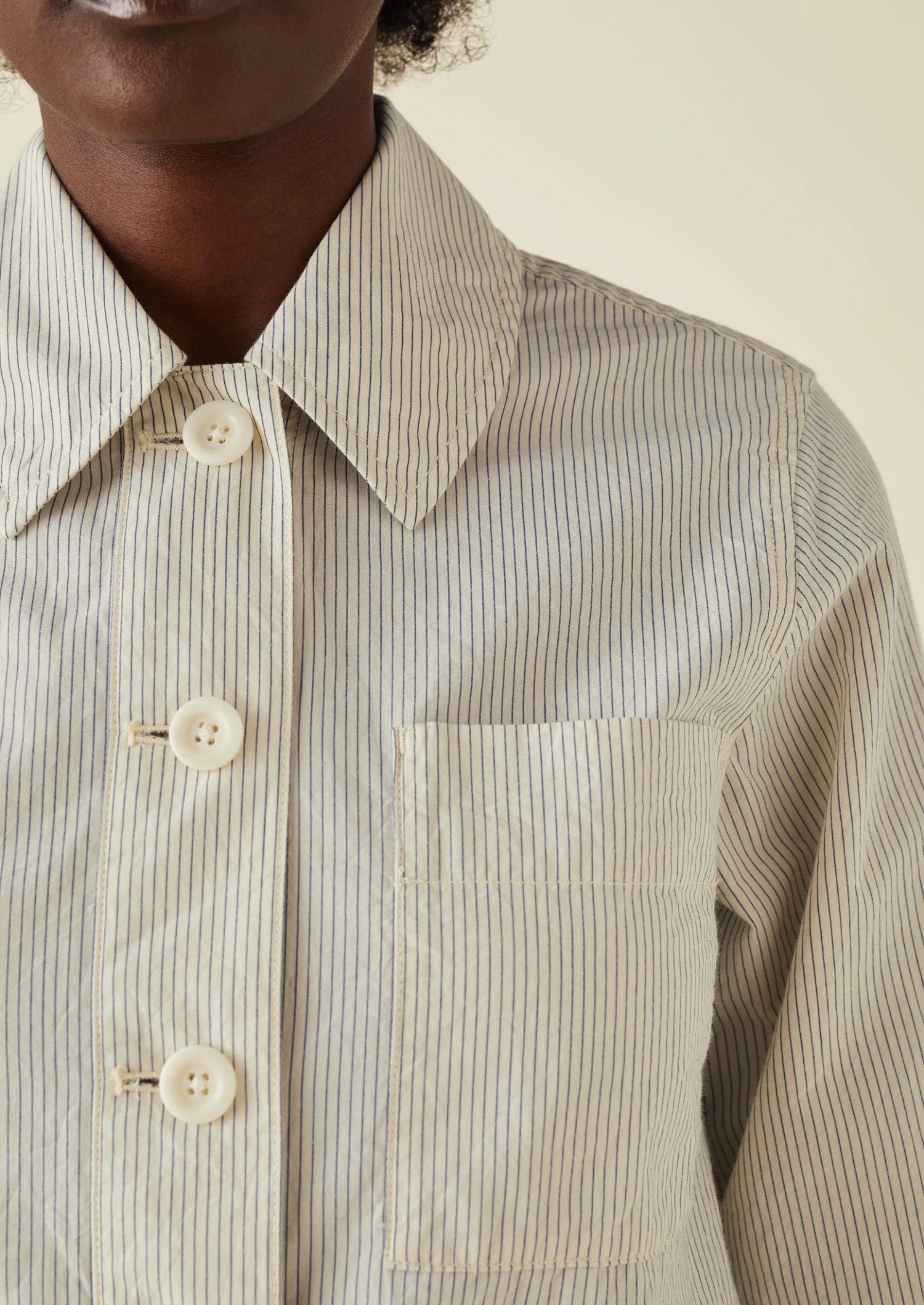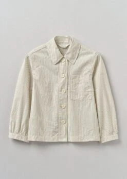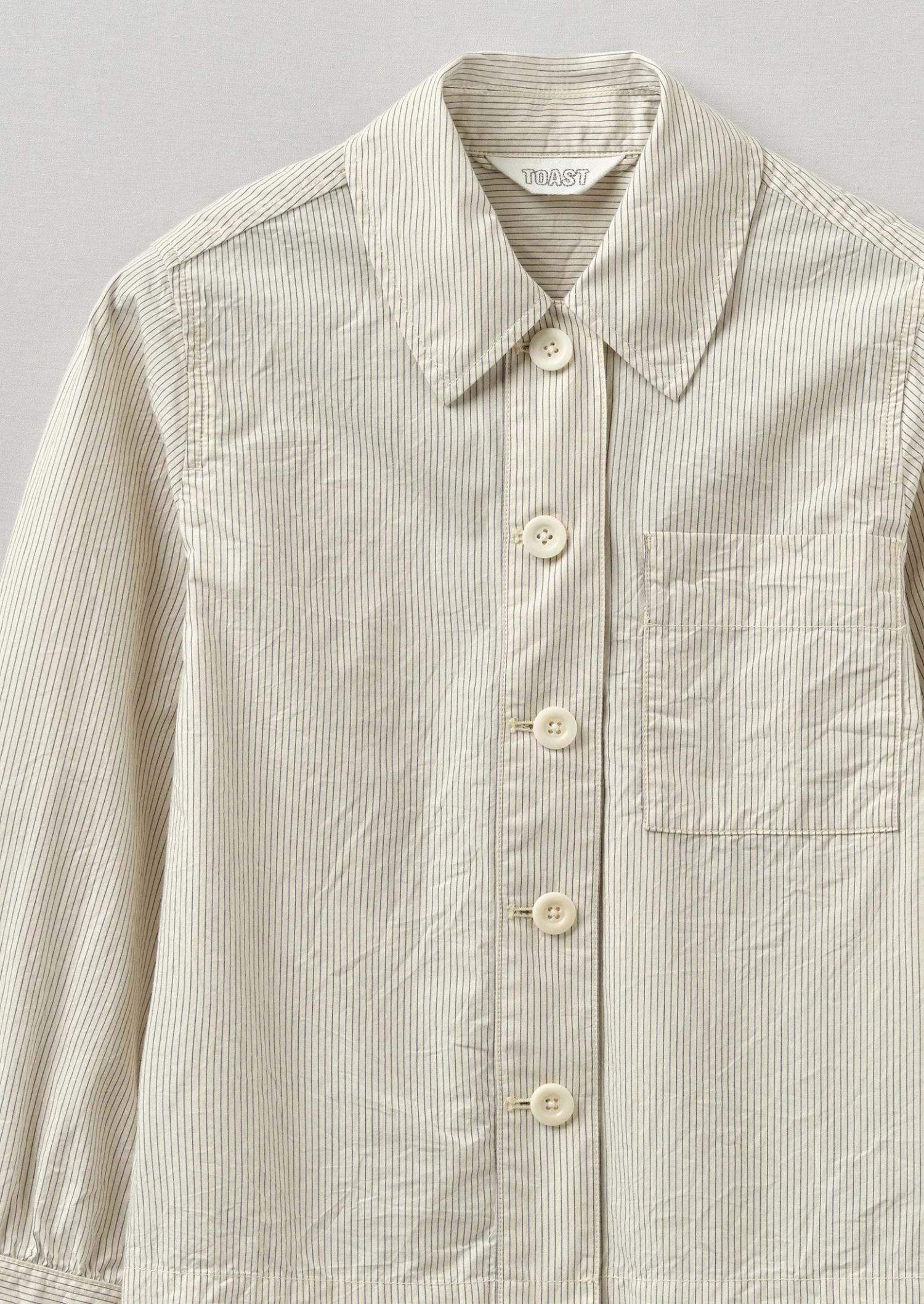 Striped organic cotton poplin. Exaggerated collar. Chest patch pocket. Back yoke panel. Back box pleat. Side hem slits. Corozo buttons.