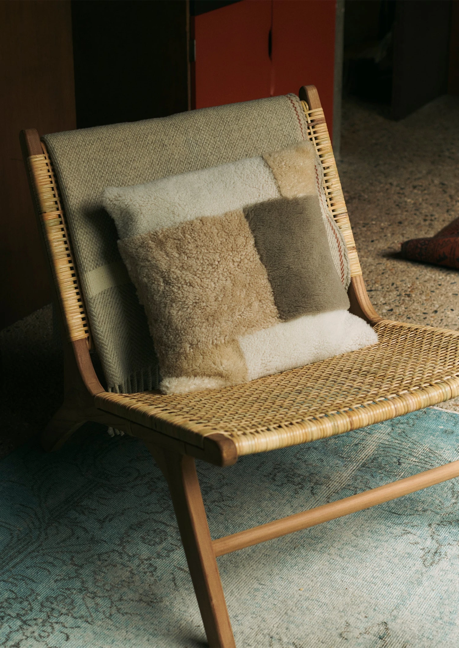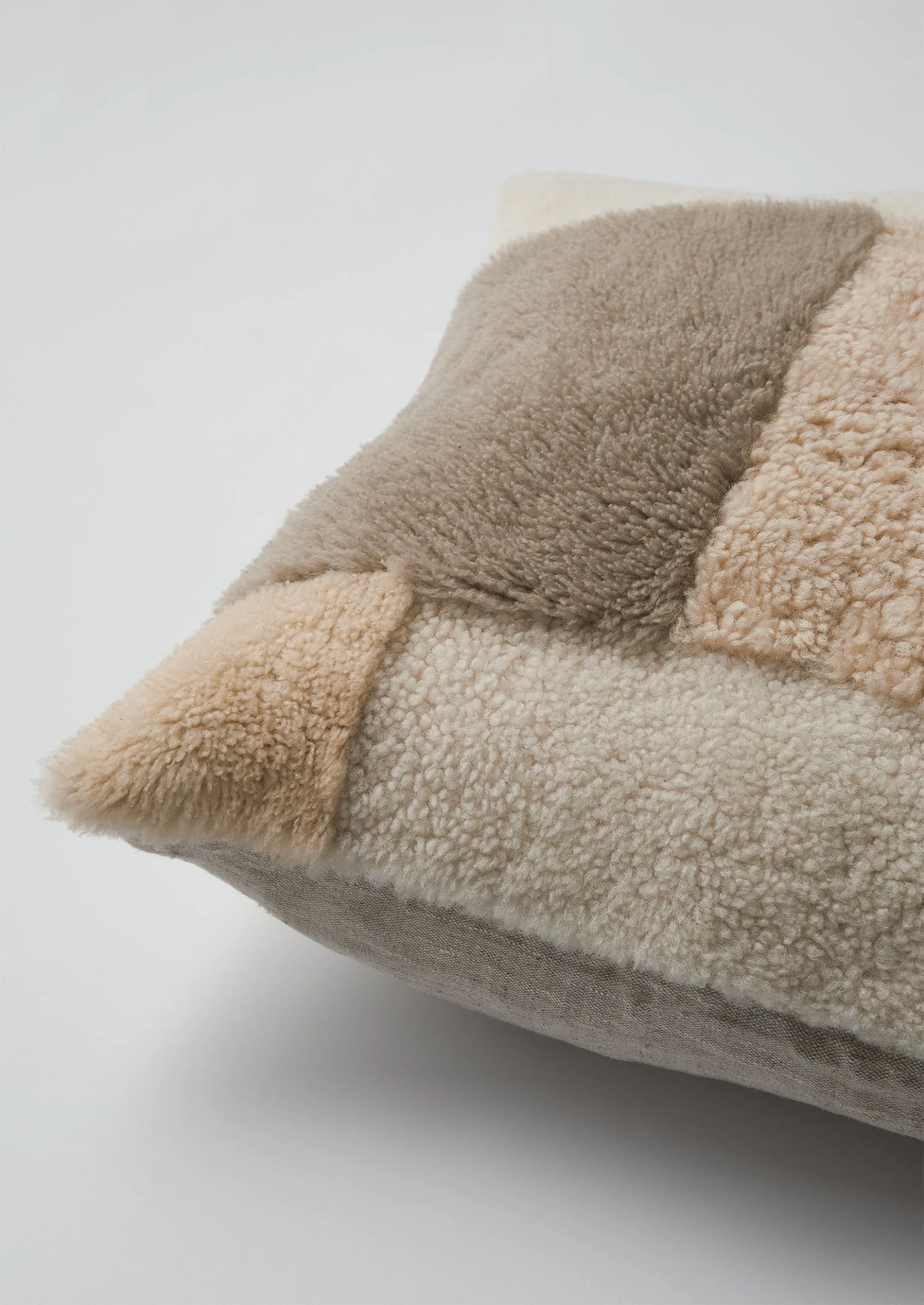 Cushion cover constructed from a patchwork of sheepskin panels, with different colours and curl lengths for a tactile impression. Each sheepskin is specially sorted and selected, and cut by hand in Somerset. Finished with a slubby linen back and envelope closure. To fit a size 46 x 46cm Wool Cushion Pad.