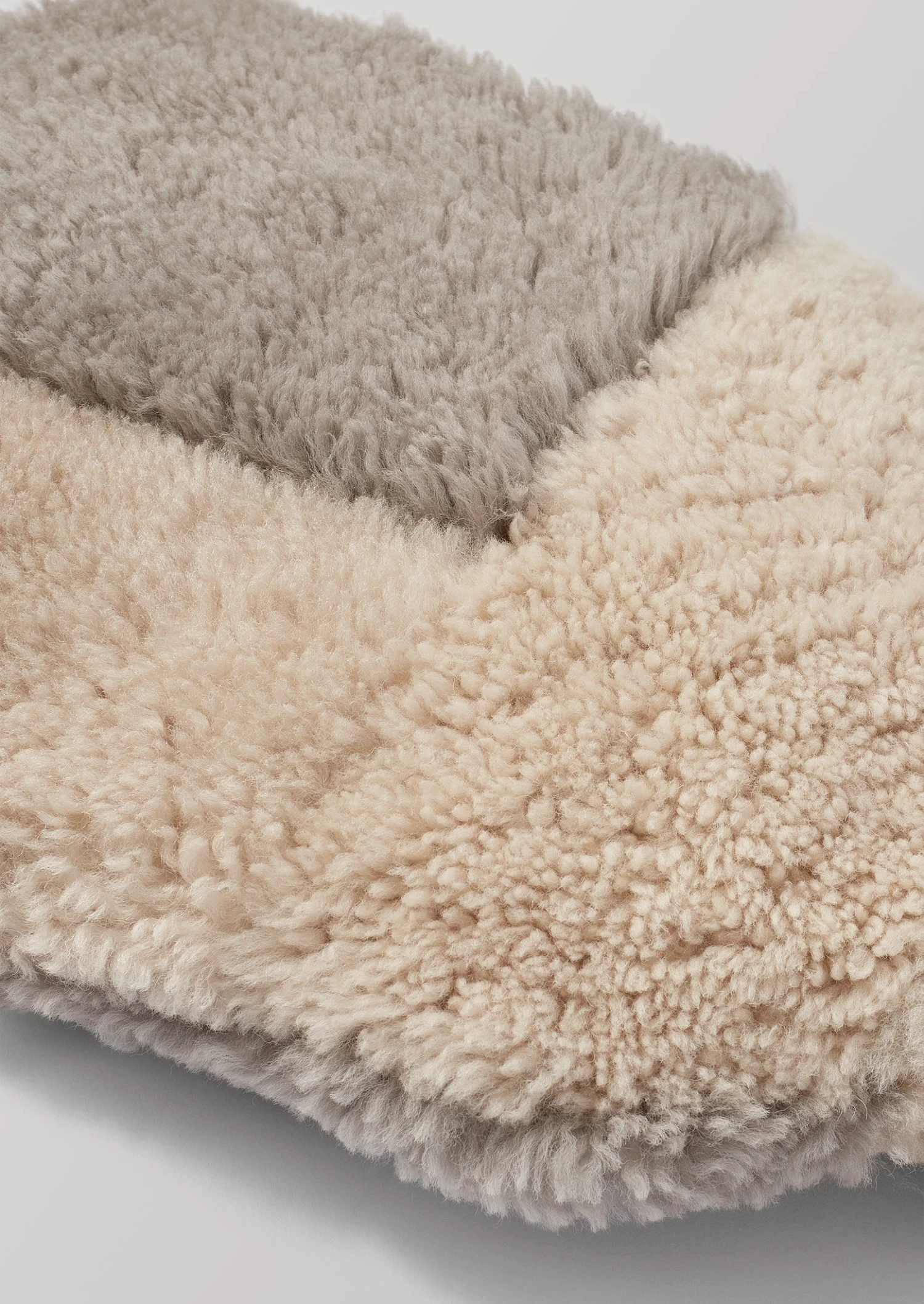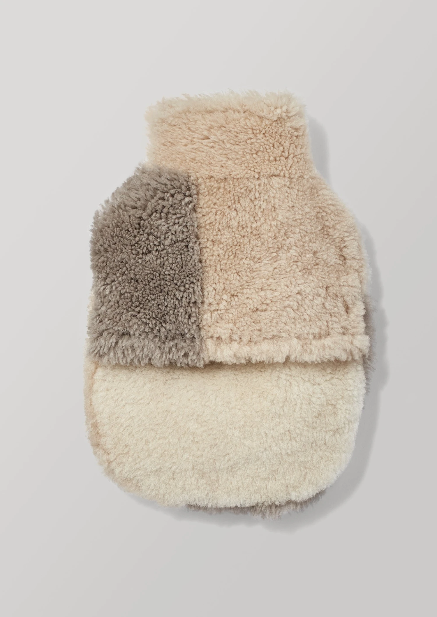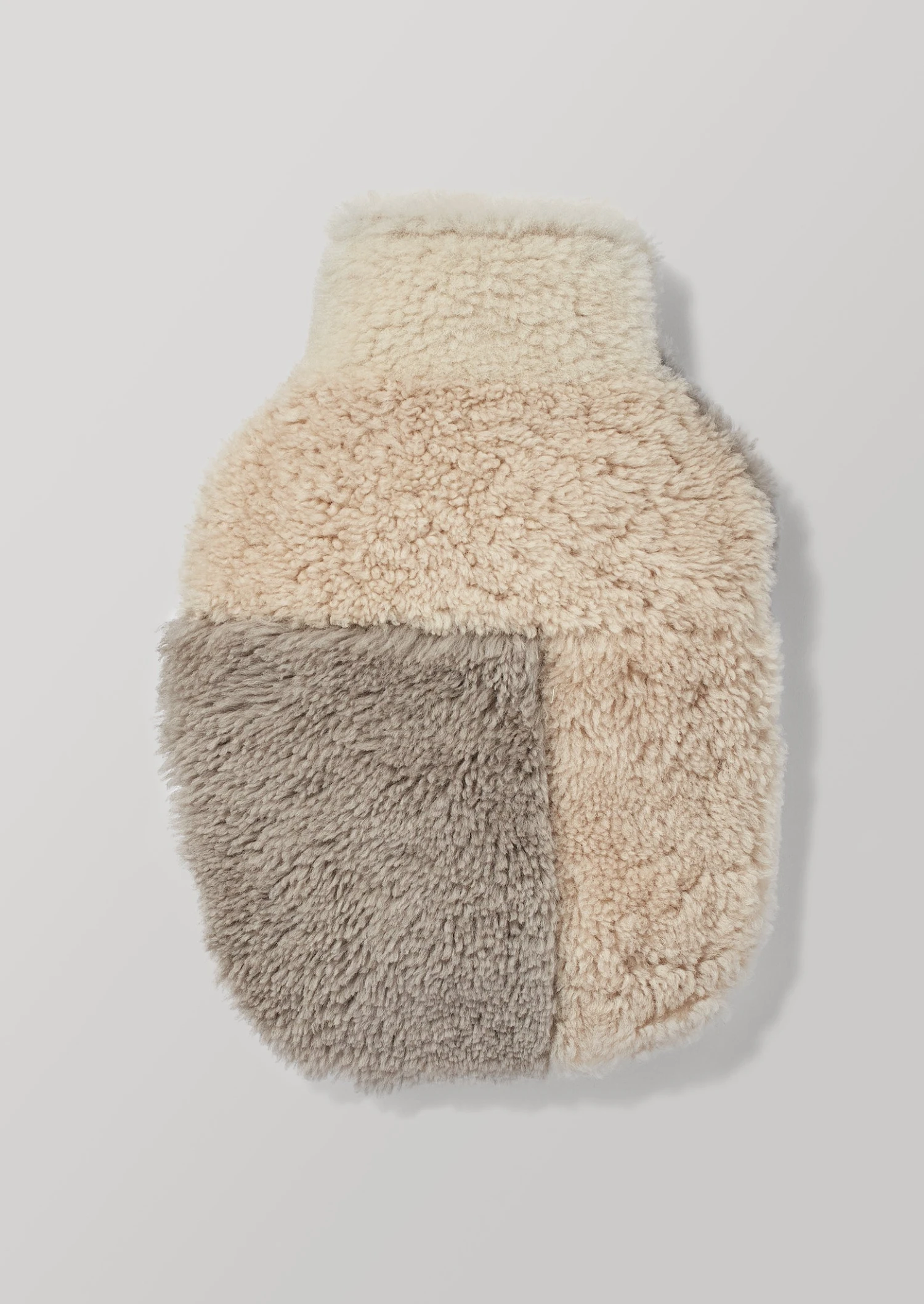 Hot water bottle cover constructed from a patchwork of sheepskin panels, with different colours and curl lengths for a tactile impression. Each sheepskin is specially sorted and selected, and cut by hand in Somerset. The open top design allows for easy filling. To fit a standard sized hot water bottle, which is approximately 33cm x 20cm and often 1.7L capacity.