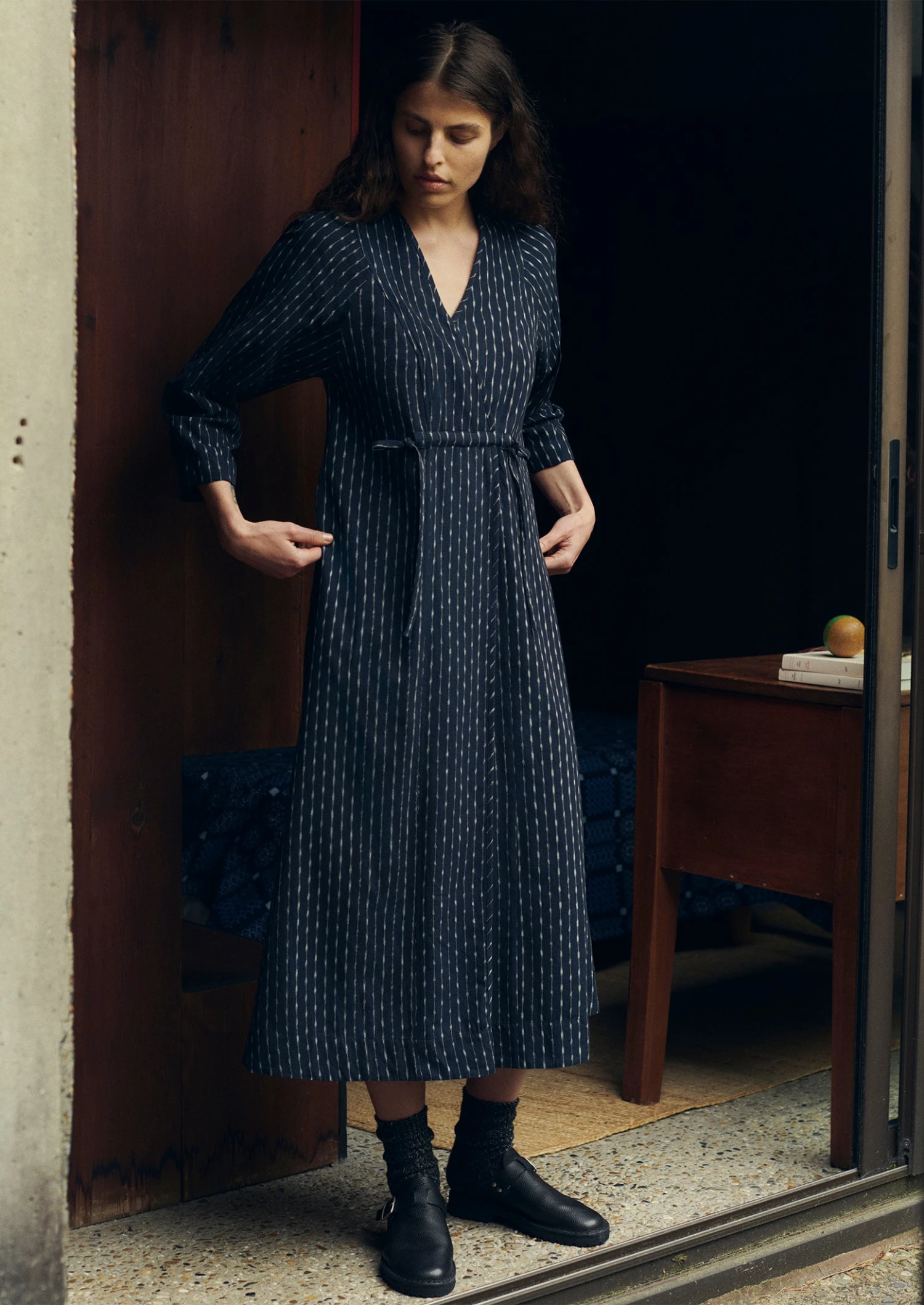 The polka-dot and stripe pattern running across our dress is artfully created using a complex ikat technique. Shaped with a crossover neckline and accented by slender ties at the front and back of the waist, allowing you to cinch in the silhouette.