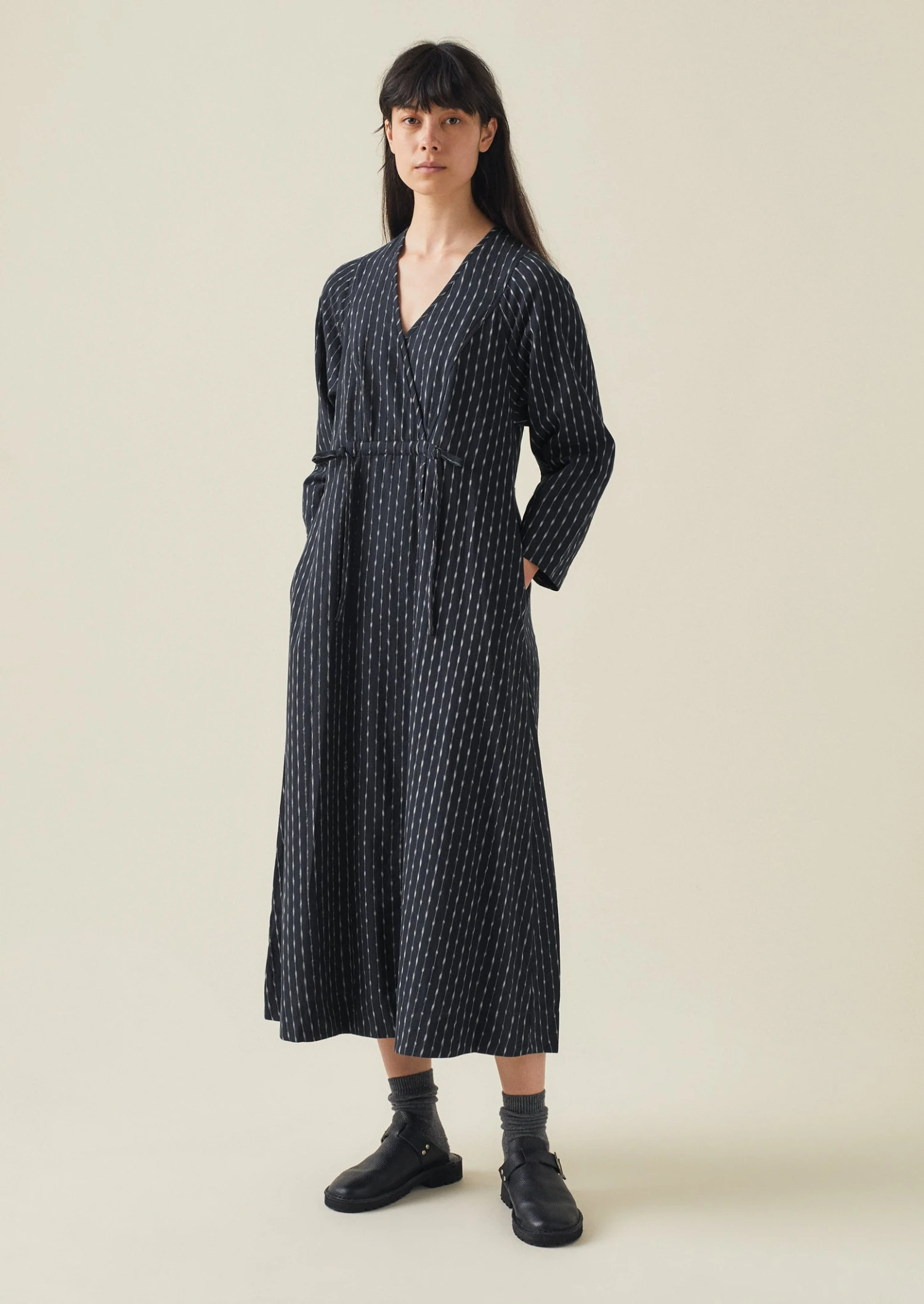 Polka-dot and stripe cotton ikat. Hand-dyed. Handwoven. Crossover neckline. Slender front and back waist ties. Side seam pockets. Internal hanging loop.