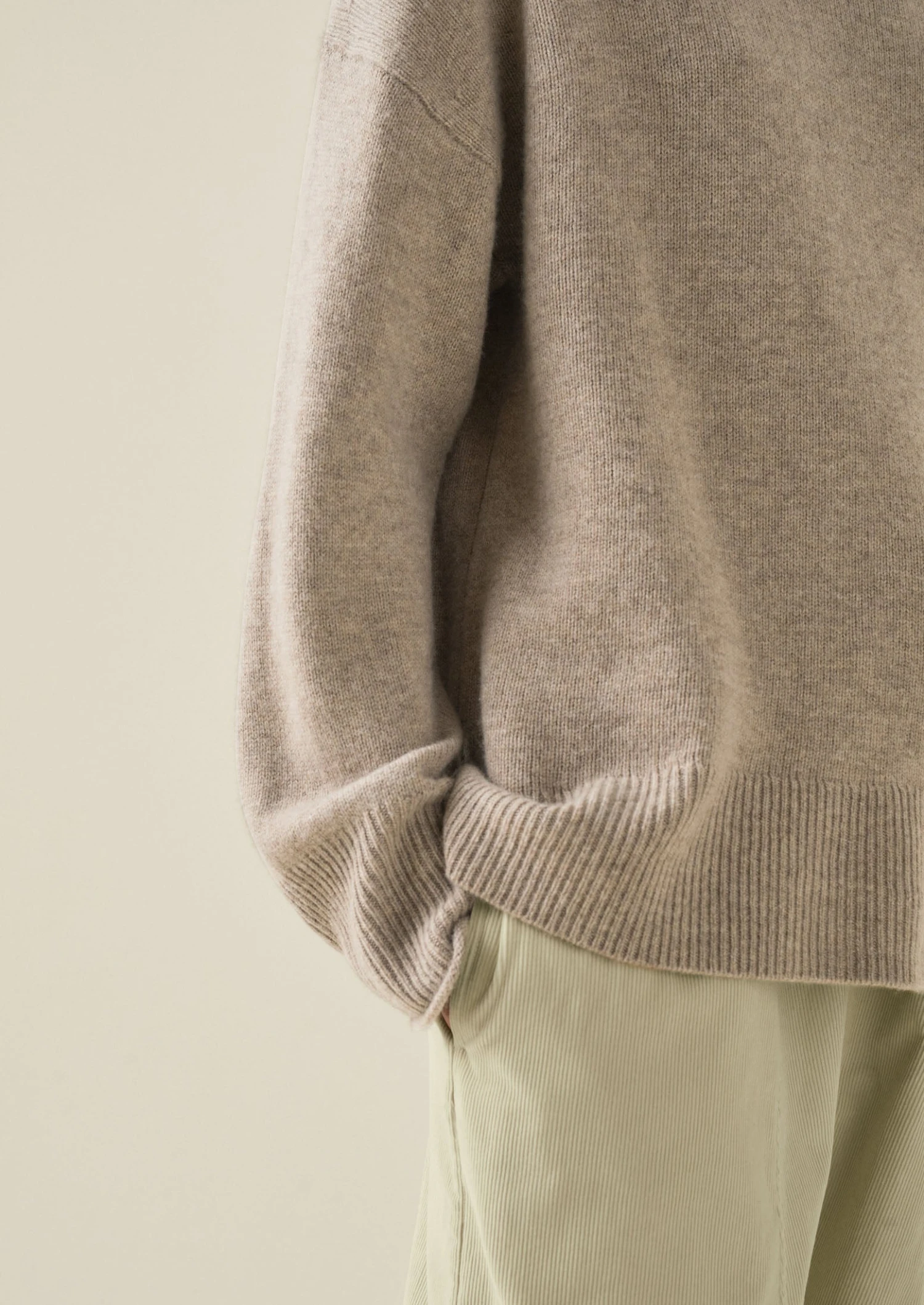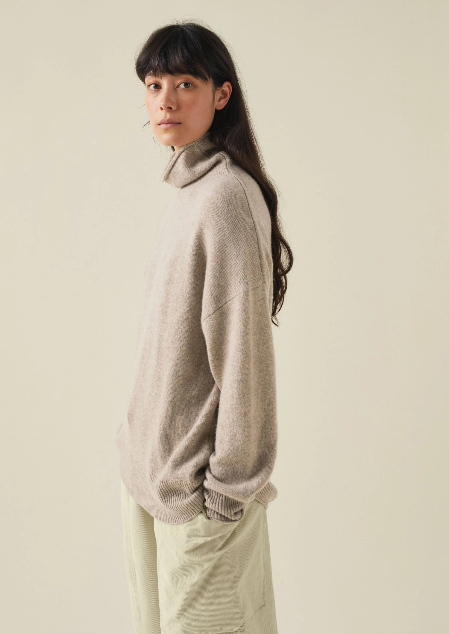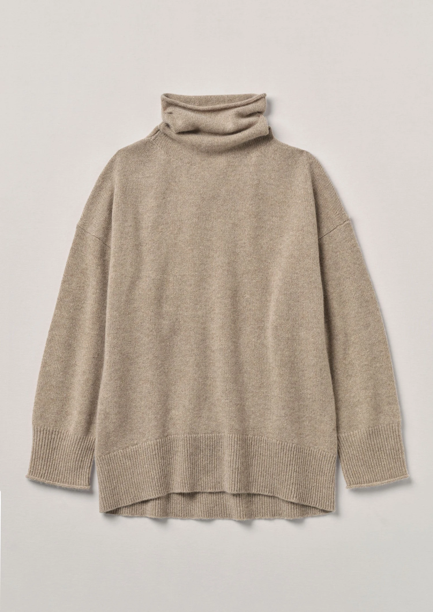 Wool and recycled cashmere blend. Roll neck. Roll-edged neck and cuffs. Dropped sleeves. Ribbed cuffs and hem.