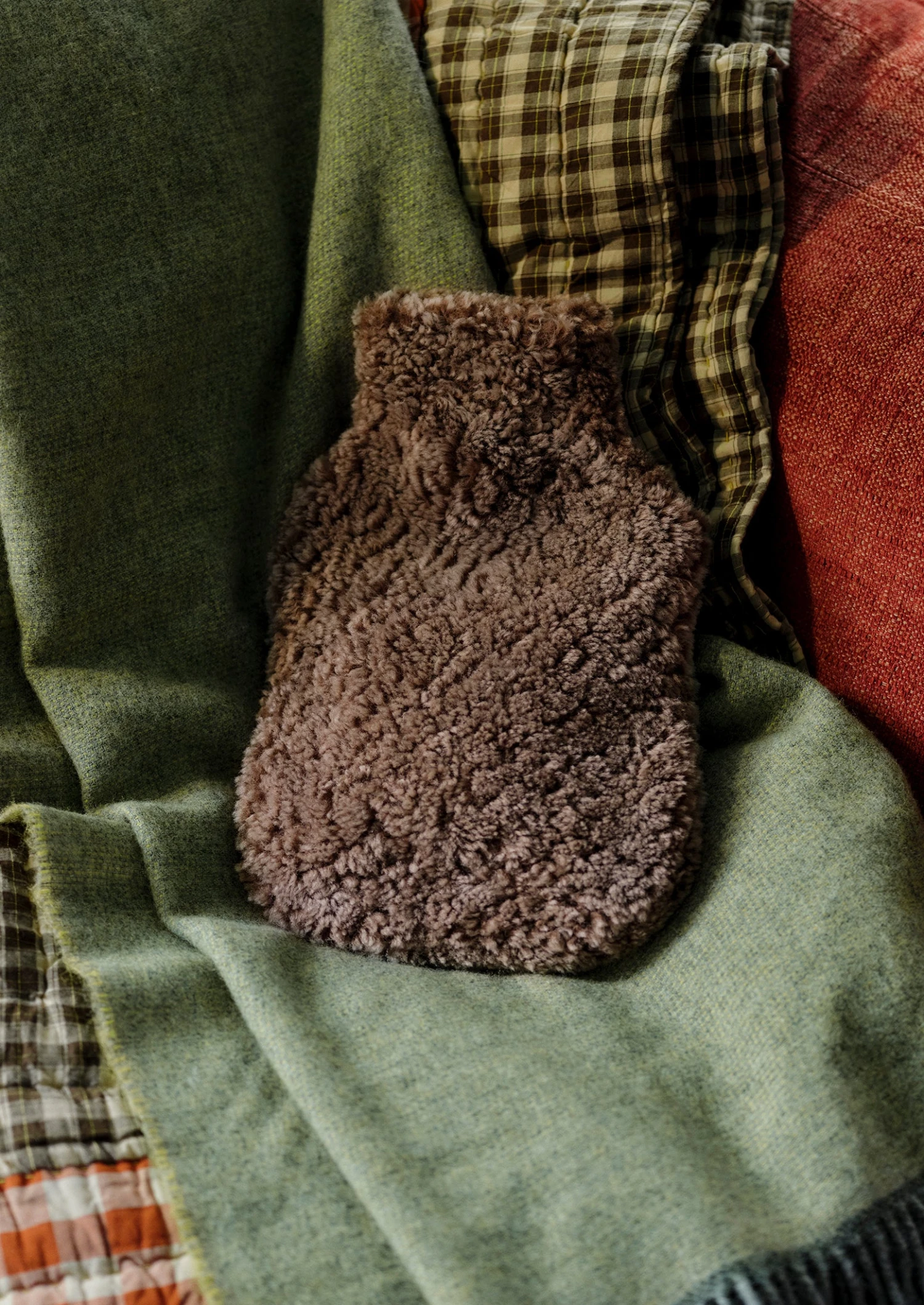 Sheepskin hot water bottle cover, incredibly soft with a tight curl. Each sheepskin is specially sorted and selected, then cut by hand in Somerset. The open top design allows for easy filling. To fit a standard sized hot water bottle, which is approximately 33cm x 20cm and often 1.7L capacity.