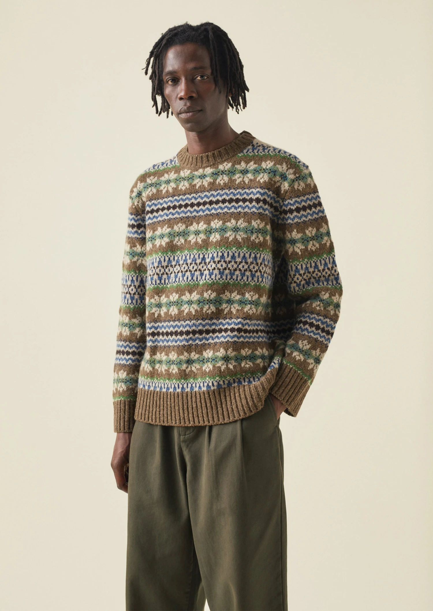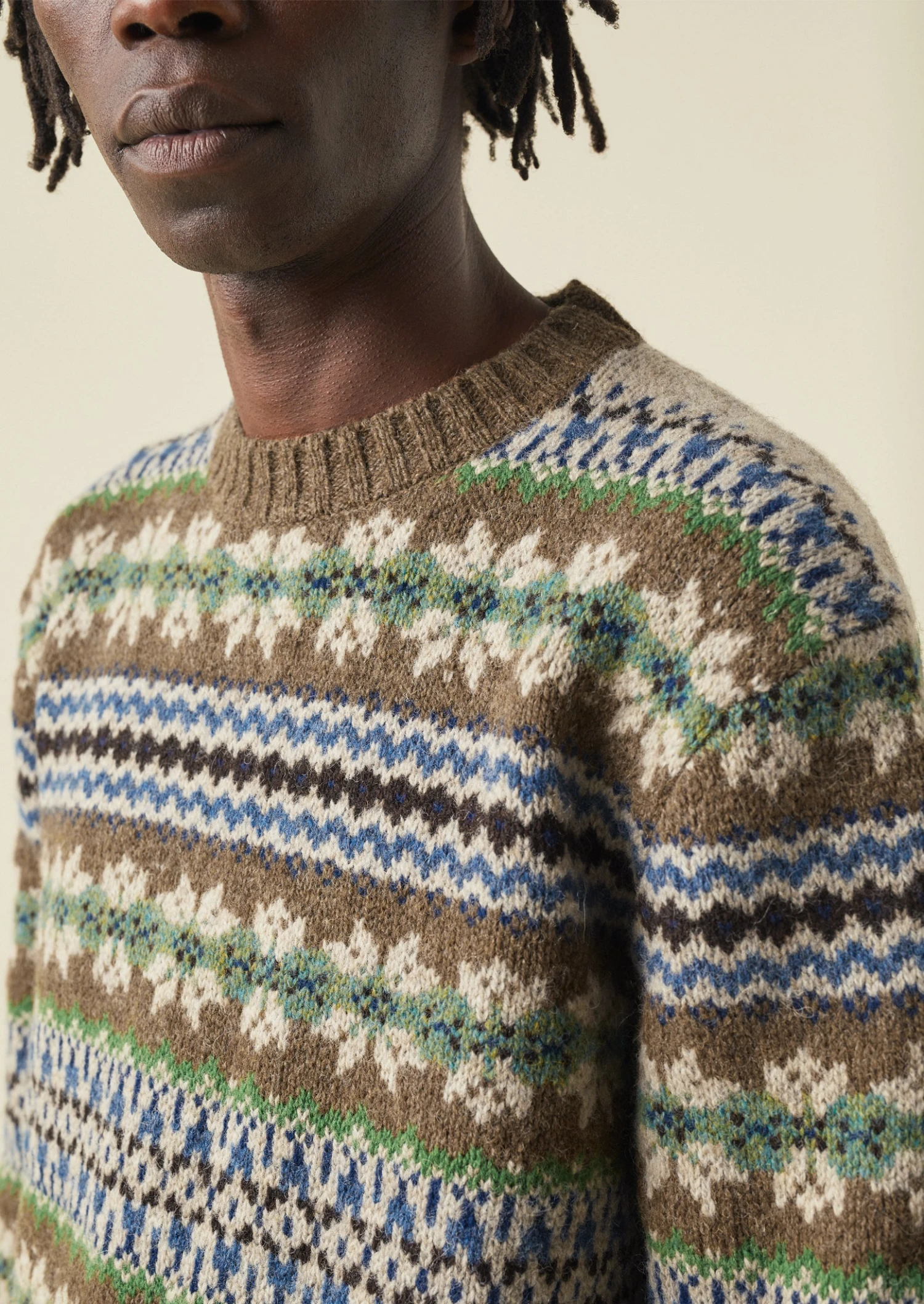 Our sweater is knitted with a geometric jacquard pattern for a contemporary take on Fair Isle styles. Crafted from Shetland wool, which is warm and durable, to a simple shape with dropped sleeves and ribbed edges. The yarn is from family-owned company Jamieson & Smith, which was founded by Robert Jamieson in 1893 in Sandness, on the west coast of the Shetland Islands. Part of our Menswear collection.