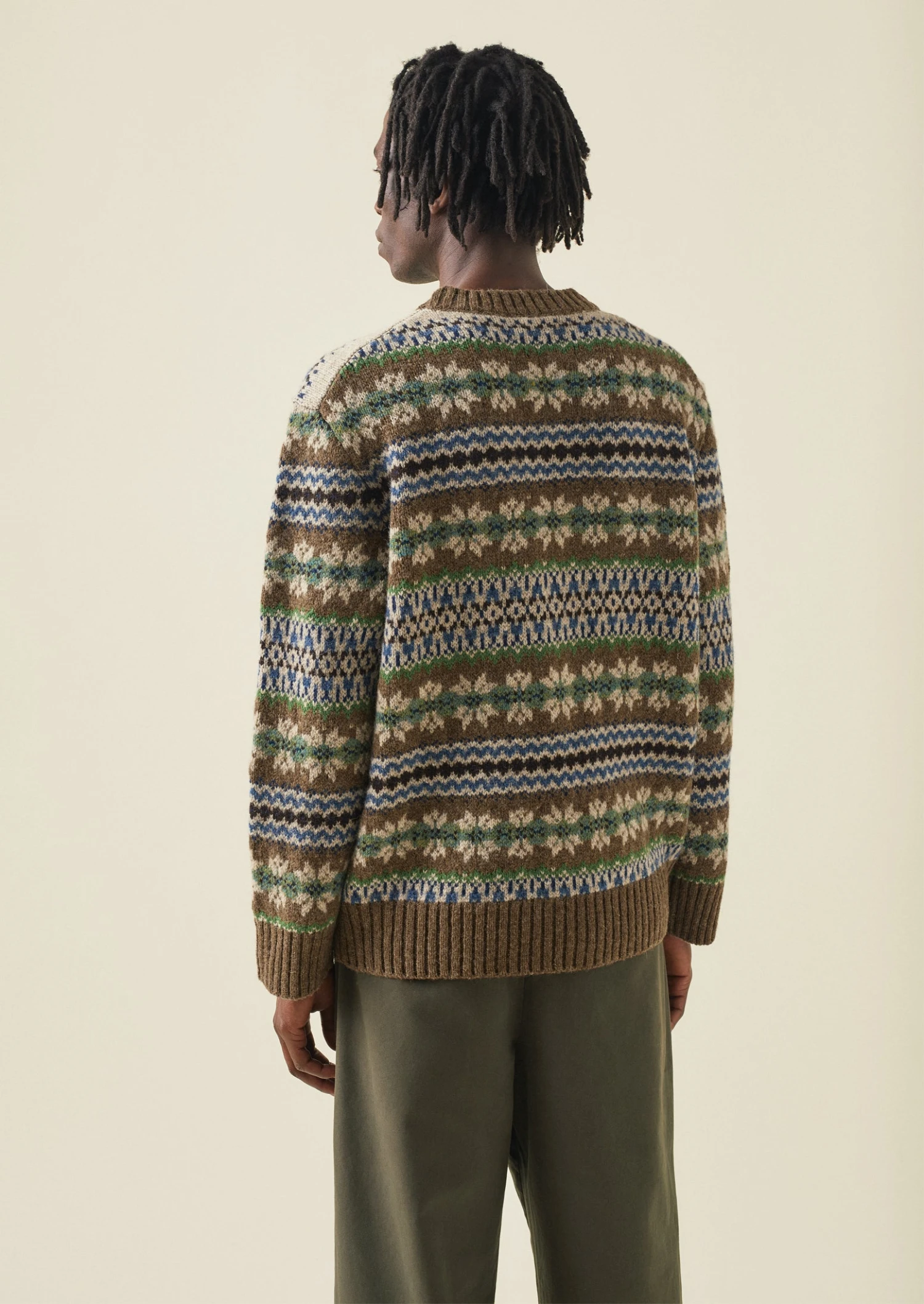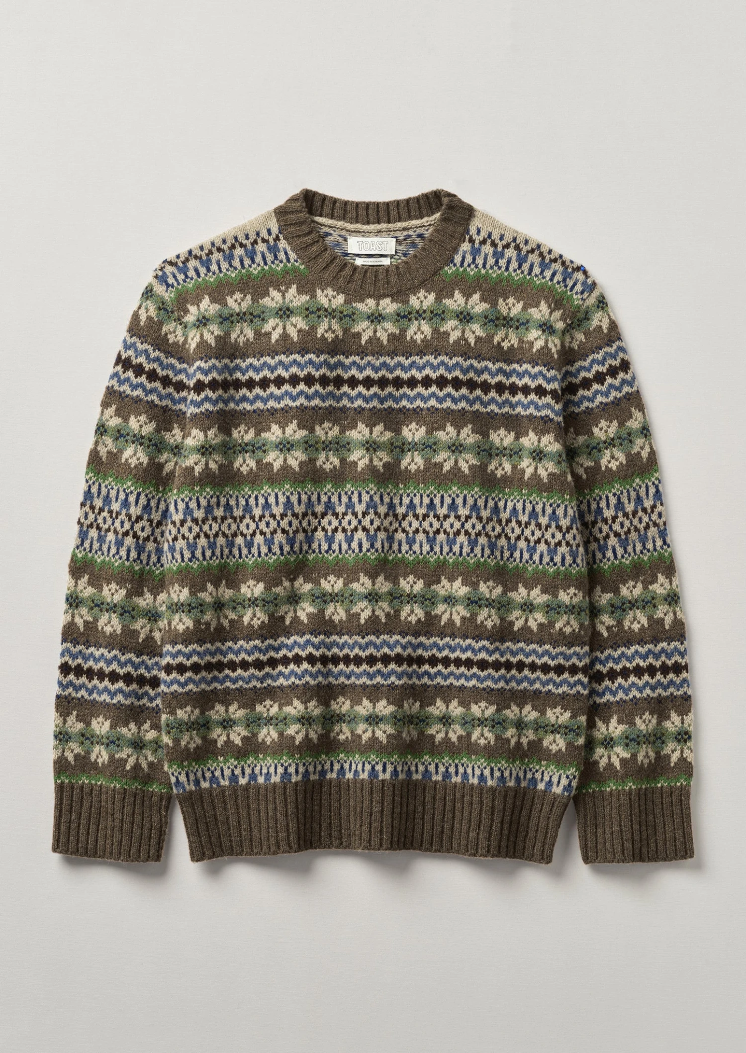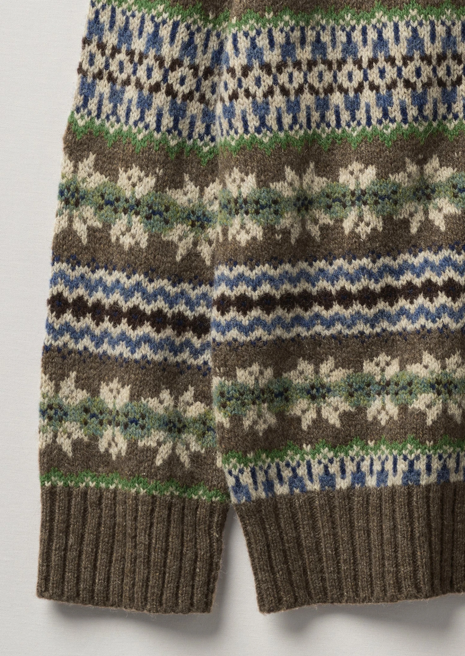Shetland wool. Fair Isle jacquard. Dropped sleeves. Ribbed edges.
