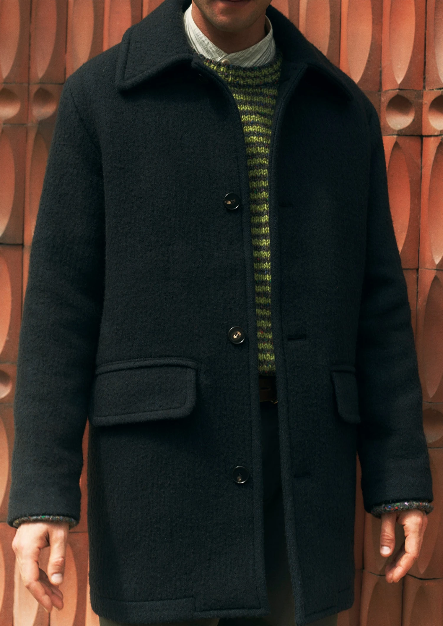 Our textured car coat is crafted in east London by London Tradition, which TOAST has worked with for over three years. Crafted from fabric containing wool and cotton which is woven in Italy. Lined with cotton twill for a neat drape, then finished with a vent at the base of the centre-back seam. Part of our Menswear collection.
