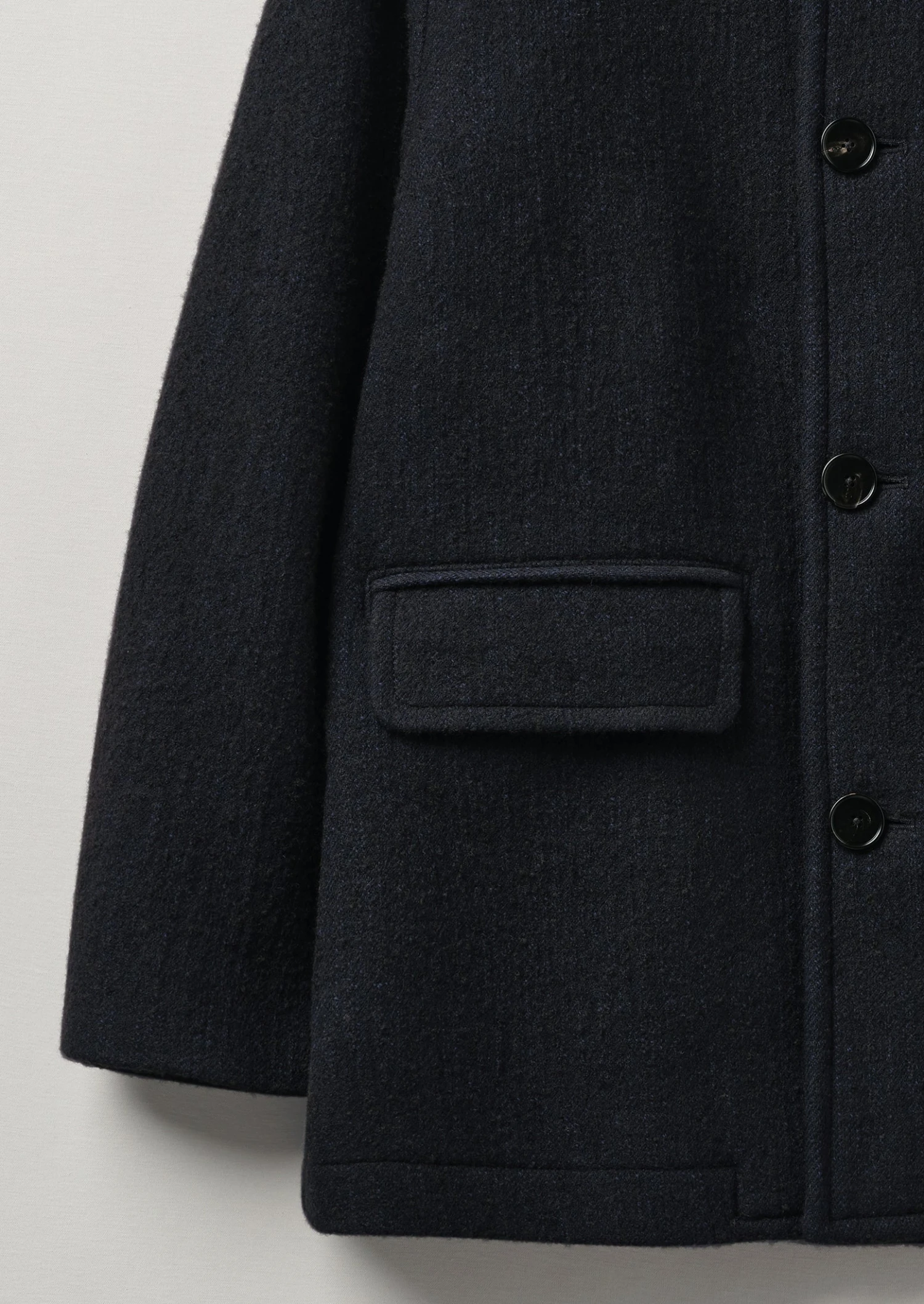 Textured weave containing wool and cotton. Wide collar. Side flap pockets. Centre-back seam. Back vent. Low-hip length. Internal hanging loop. Internal welt pocket. Cotton twill lining. Horn buttons.
