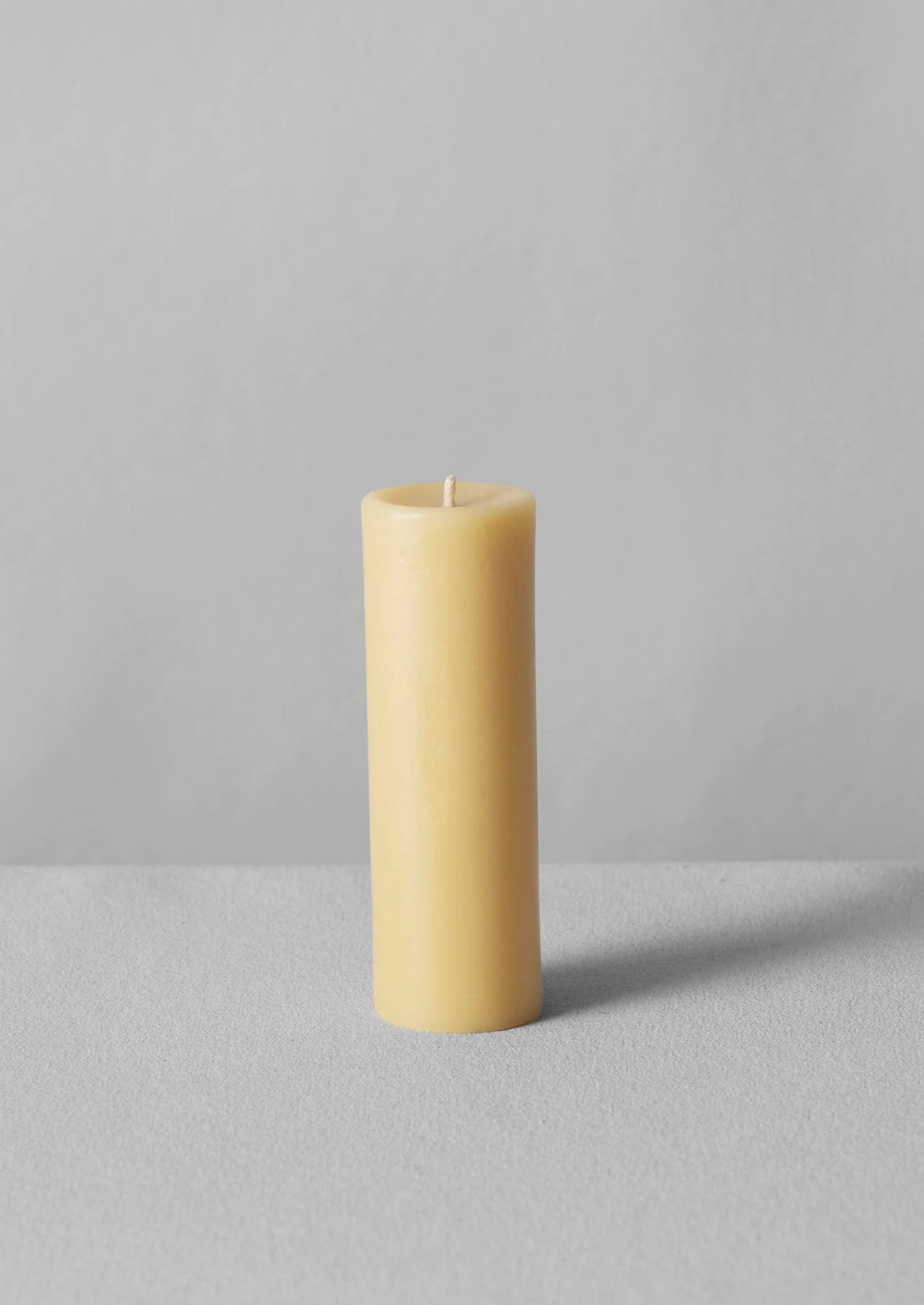 Pillar candle from Skar Organics, hand-poured in Leeds from organic beeswax with an unbleached organic cotton wick. There is a 3km road-free radius around the apiary site where the beeswax is created, ensuring the bees and pollen and nectar sources do not come into contact with pesticides. With natural variations in colour and a burn time of 30 hours.