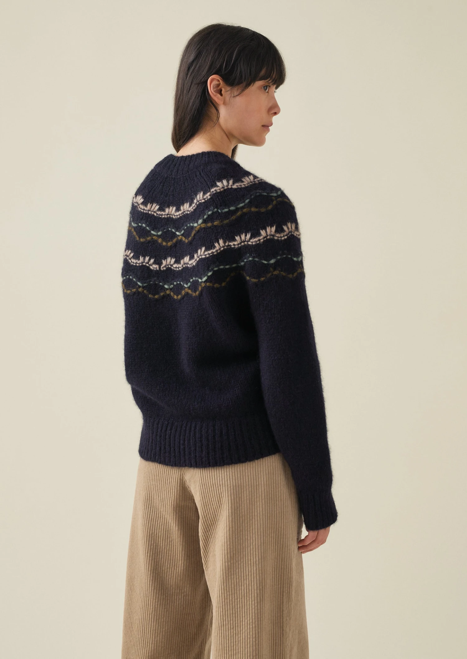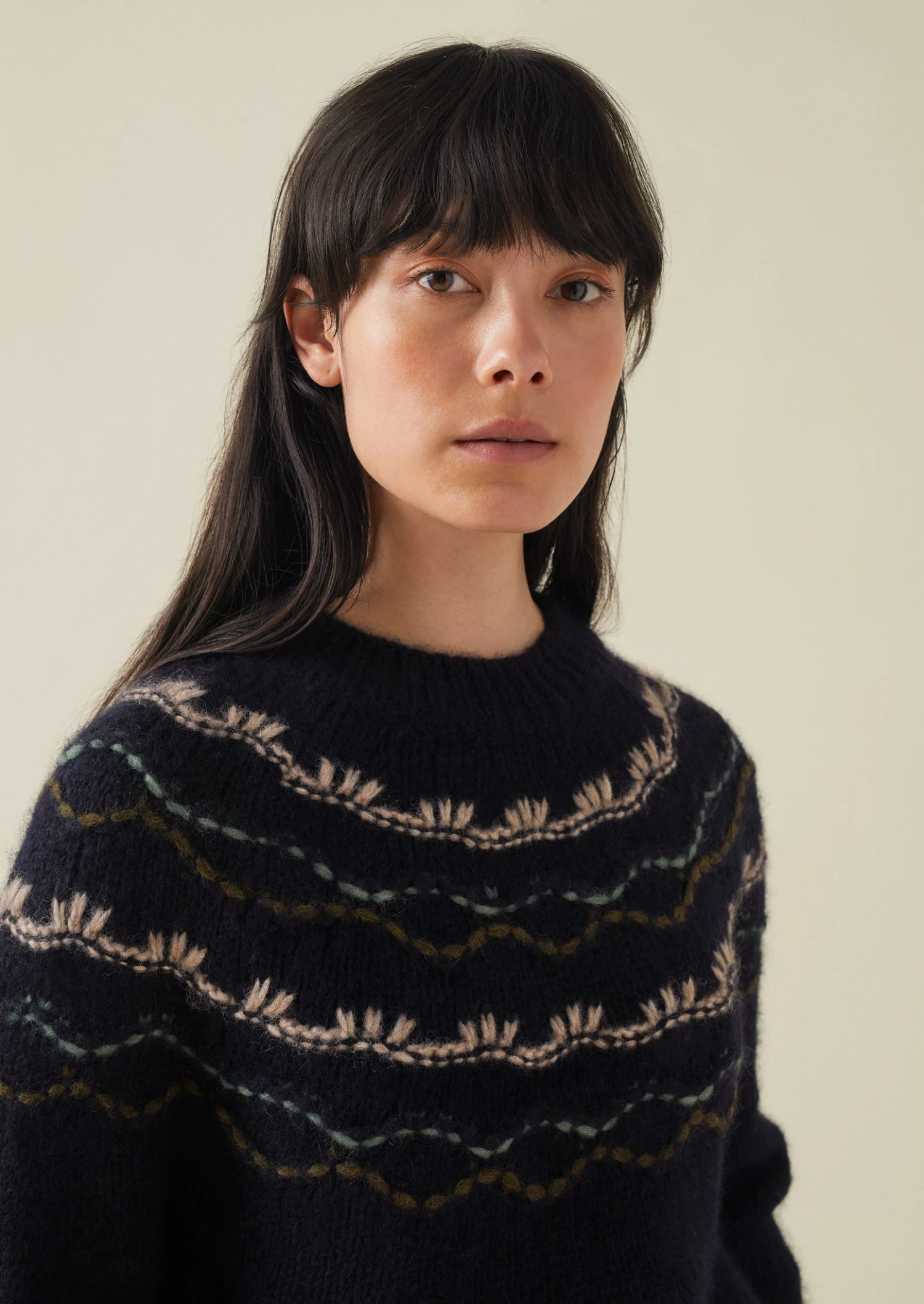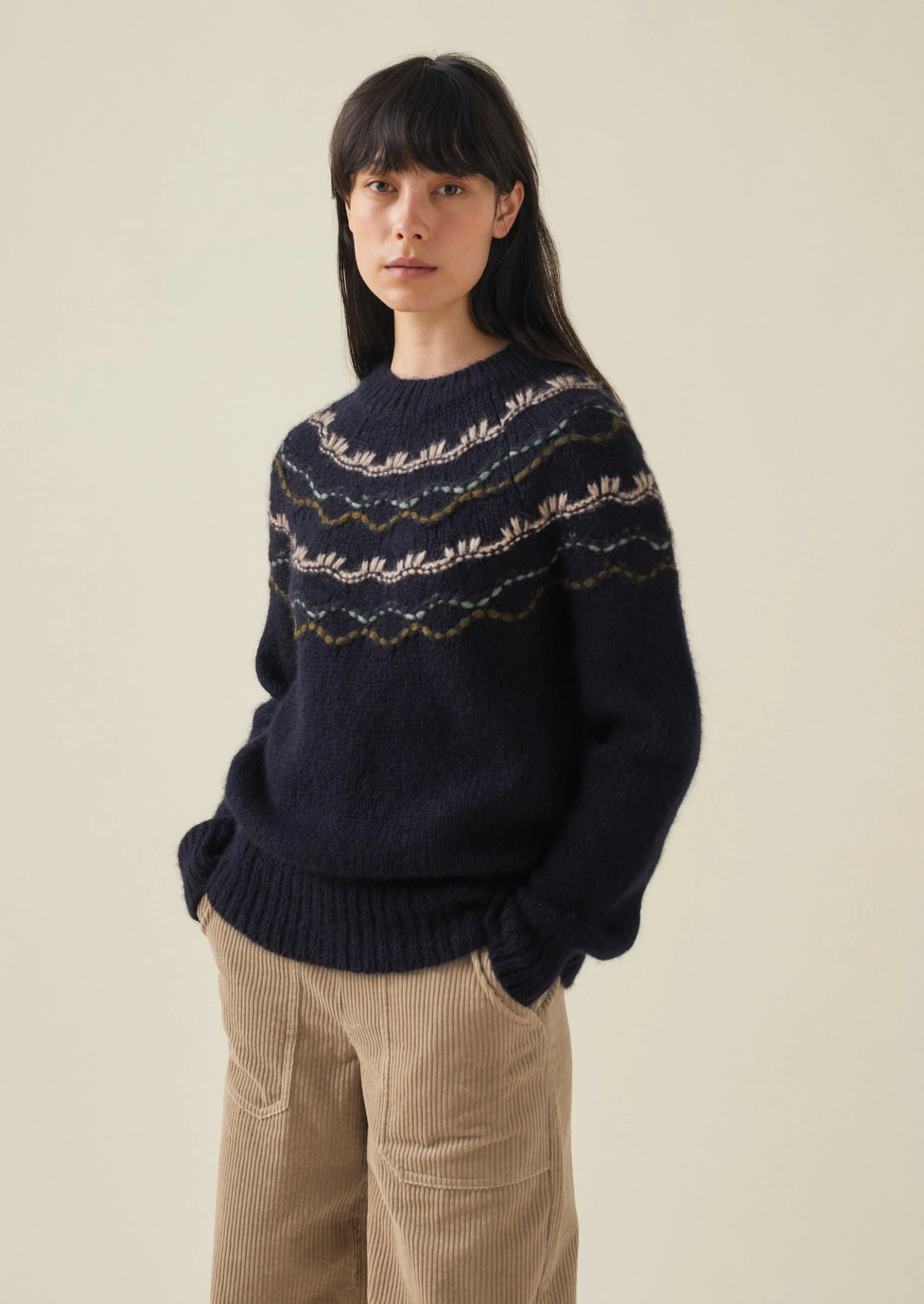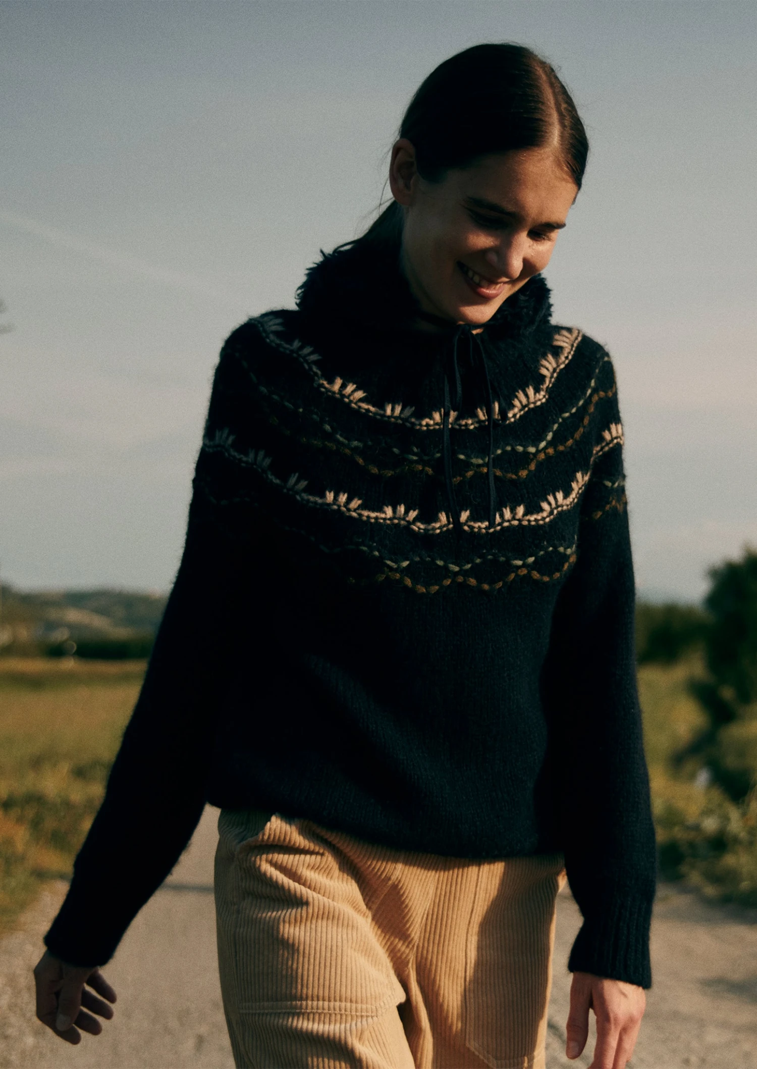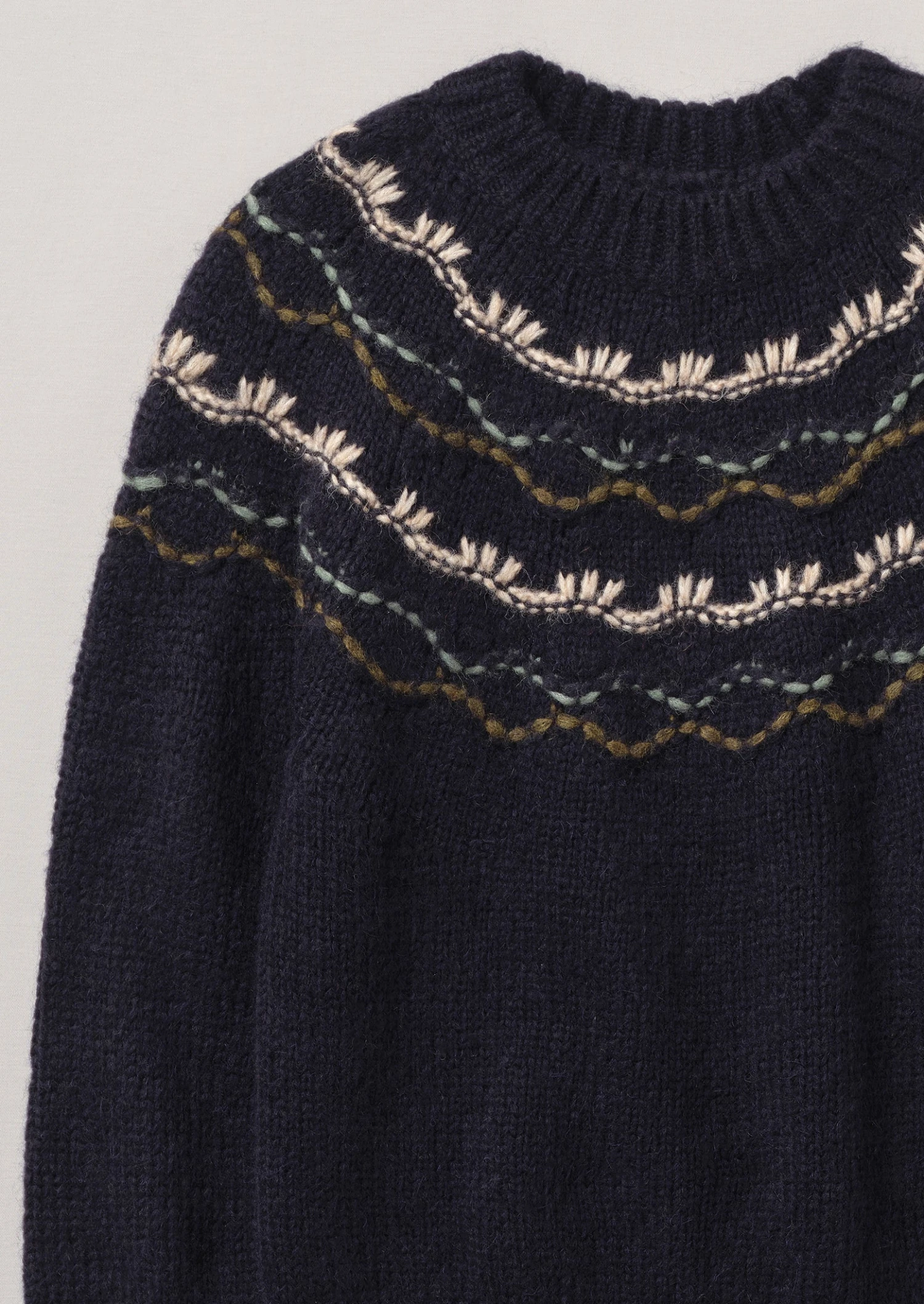 Intricate stitching runs in waves around the shaped yoke of our soft sweater for a tactile impression. Knitted from a warm, lofty blend of alpaca, merino and cotton fibres to an easy shape with a high neck, falling to a low-hip length.