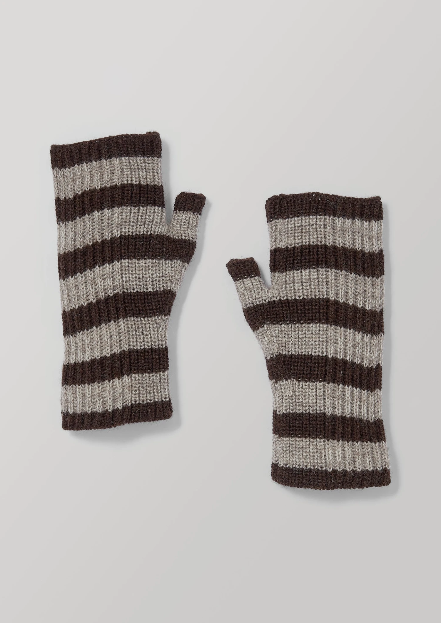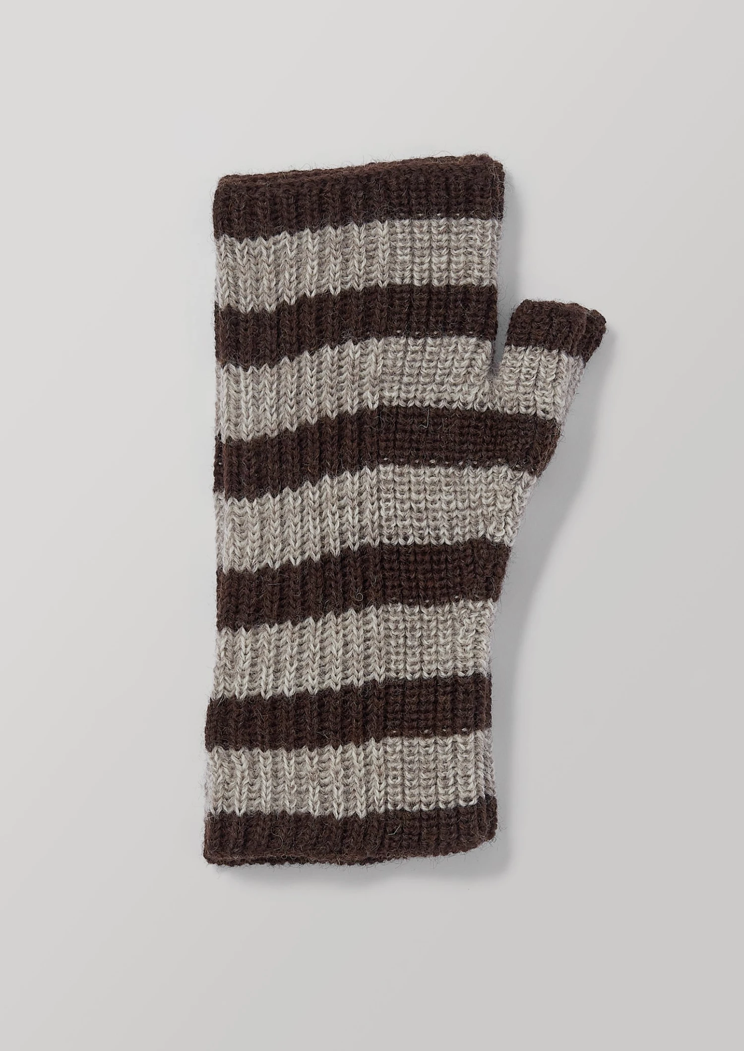 Our fisherman-ribbed fingerless gloves are knitted in Romania from undyed yarn, with the natural colours of the wool arranged in wide stripes.