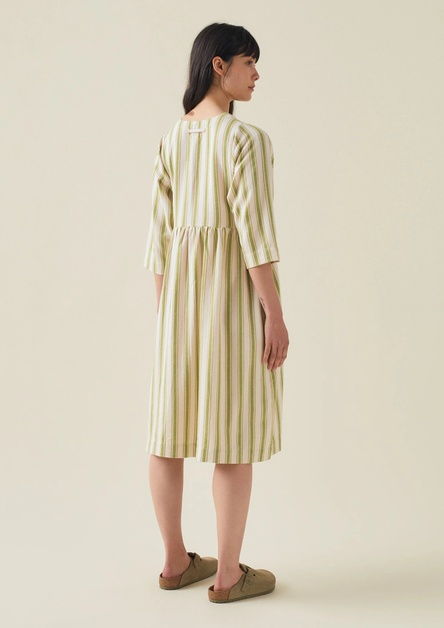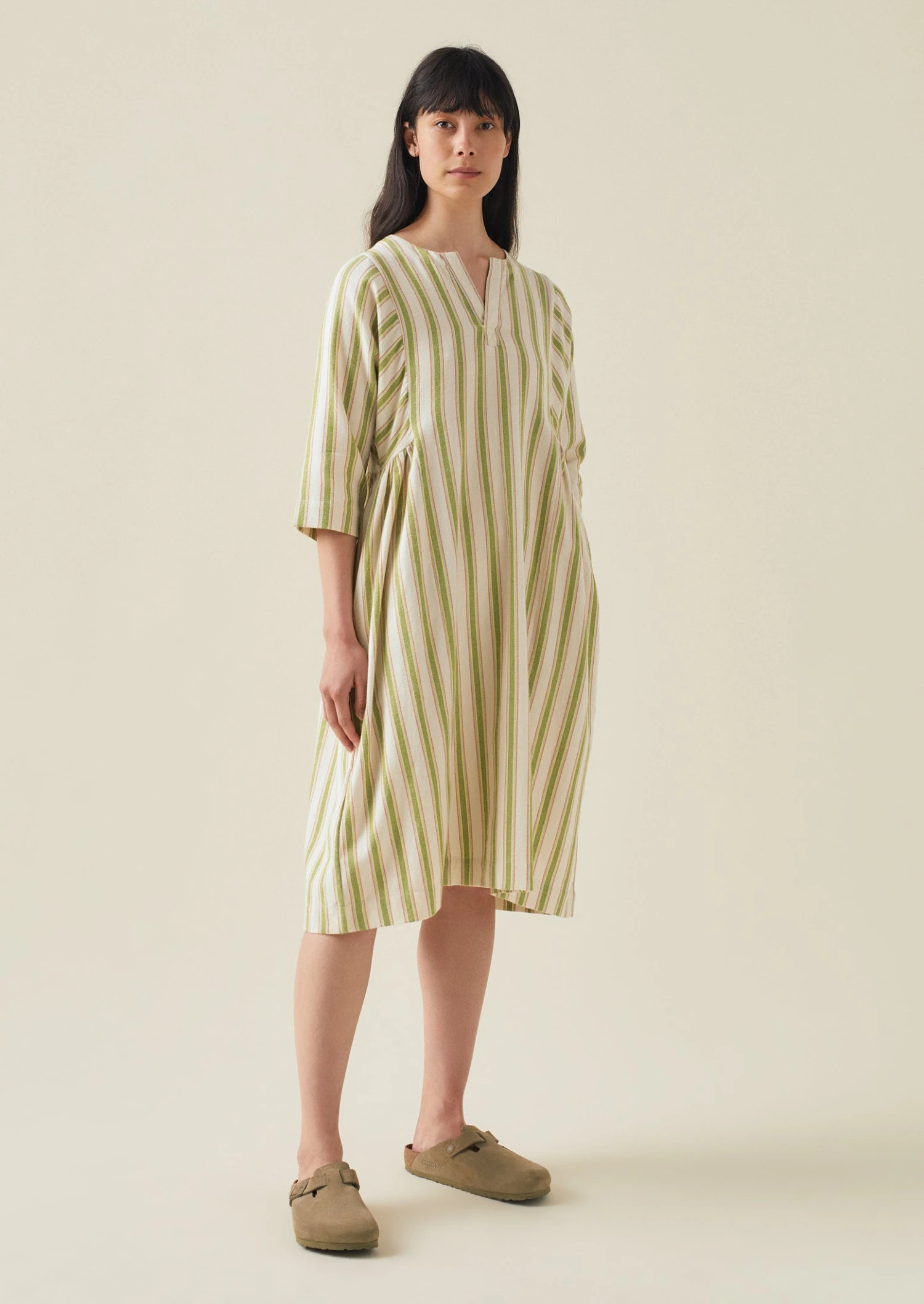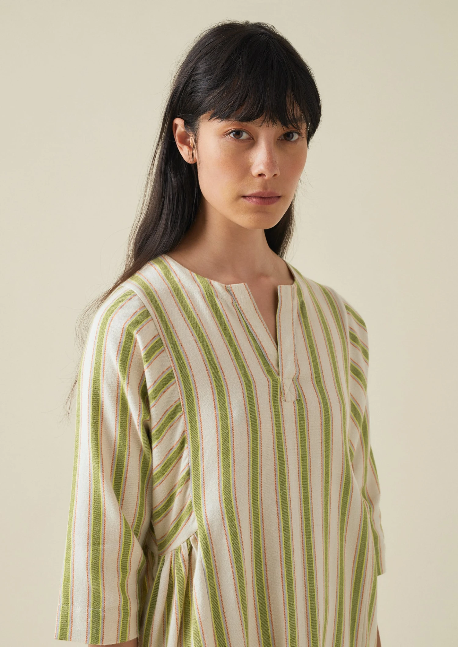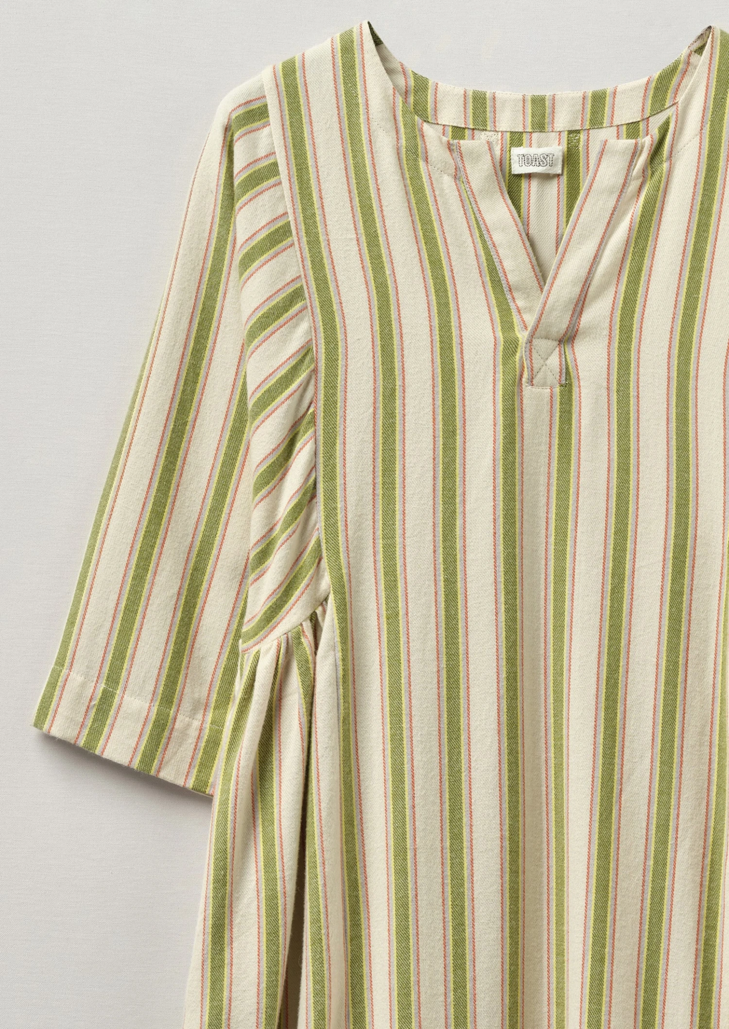 Striped organic cotton flannel. V opening. Gathered sides and back. Back hanging loop. Three quarter length dolman sleeves. Side seam pockets. Below-knee length.