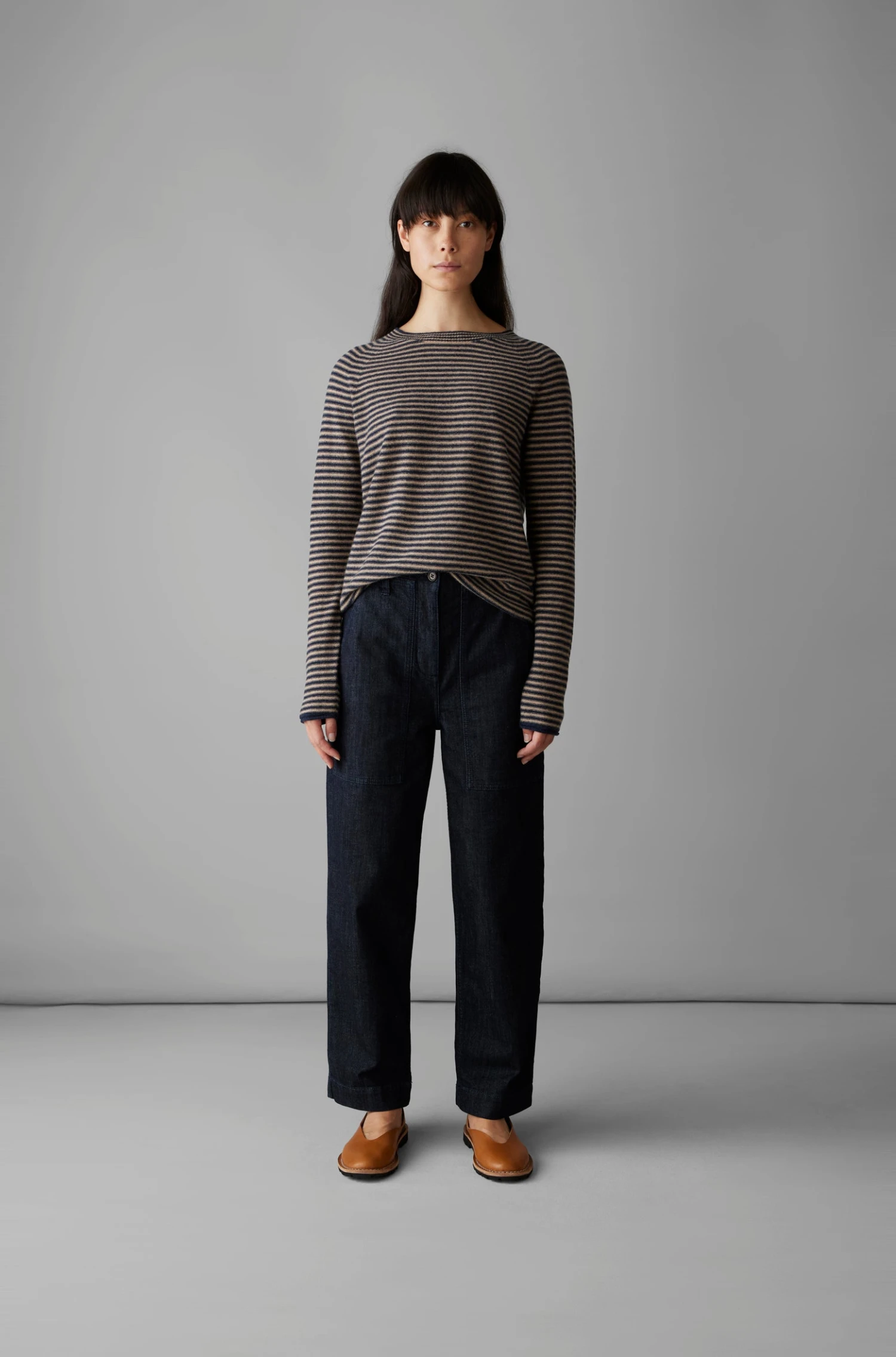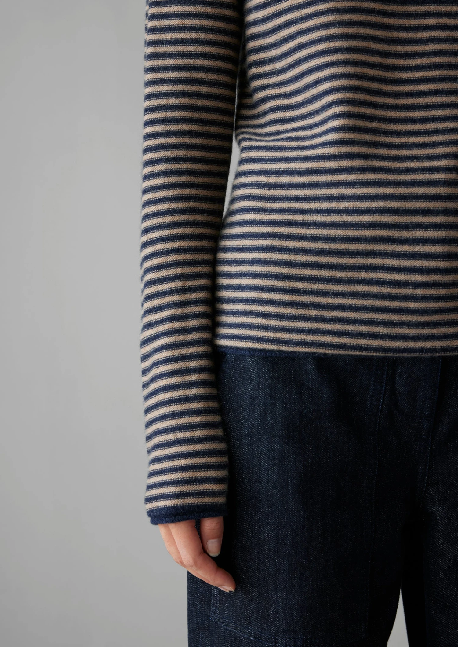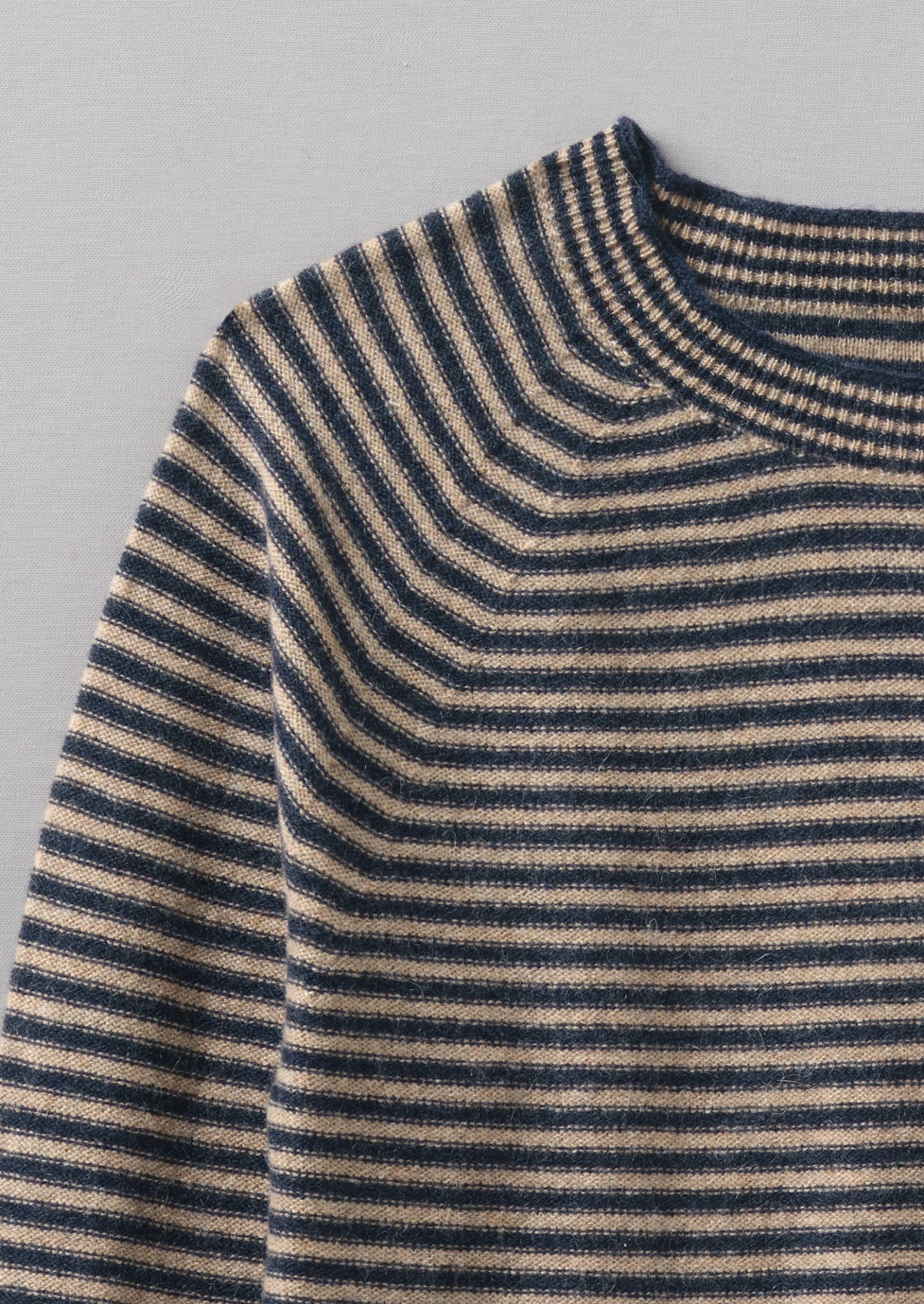 Wool and recycled cashmere blend. Intarsia stripes. Integral ribbed neck. Elongated sleeves. Rolled cuffs and hem. Mid-hip length.