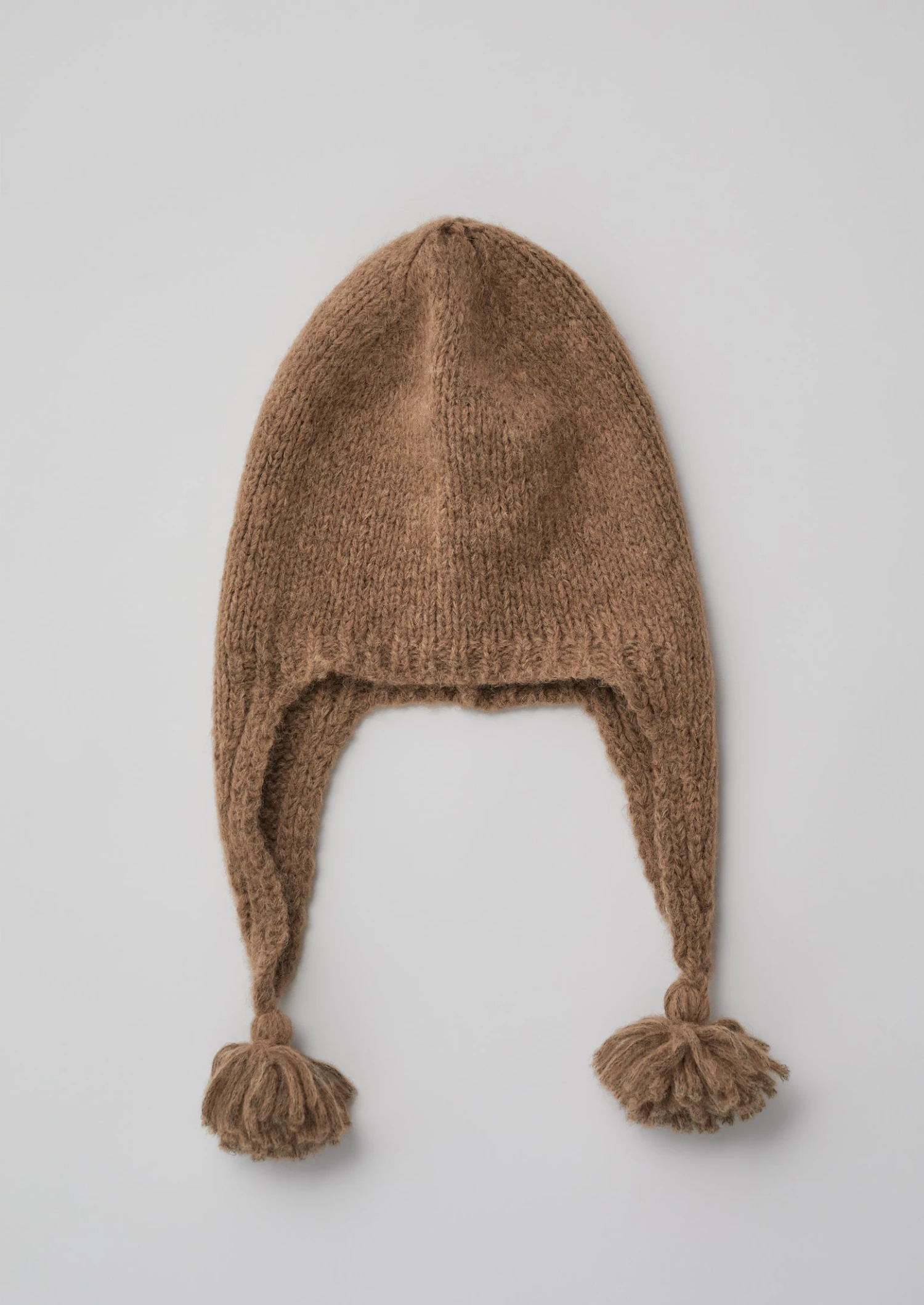 Our chunky hat is knitted from a warm, soft and lofty blend of alpaca, cotton and merino wool. Covering the ears for warmth and finished with tactile tassels at the tips.