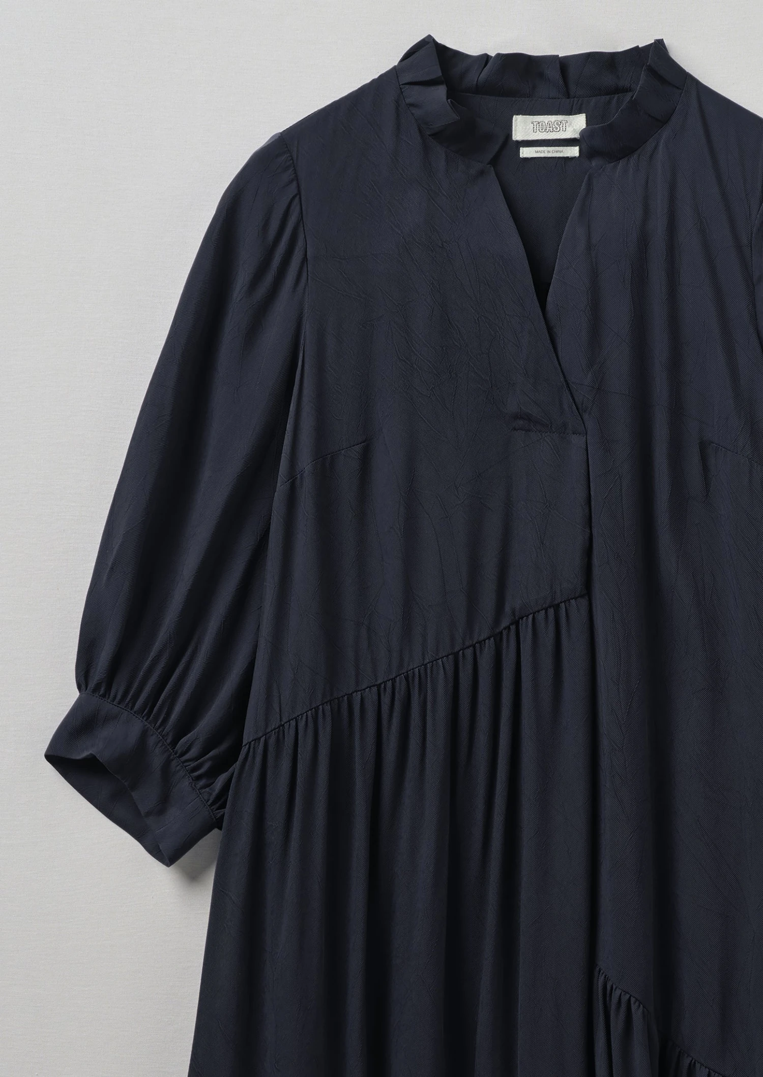 Crinkled twill. Asymmetric gathered panels. Dip hem. Lower-calf length.