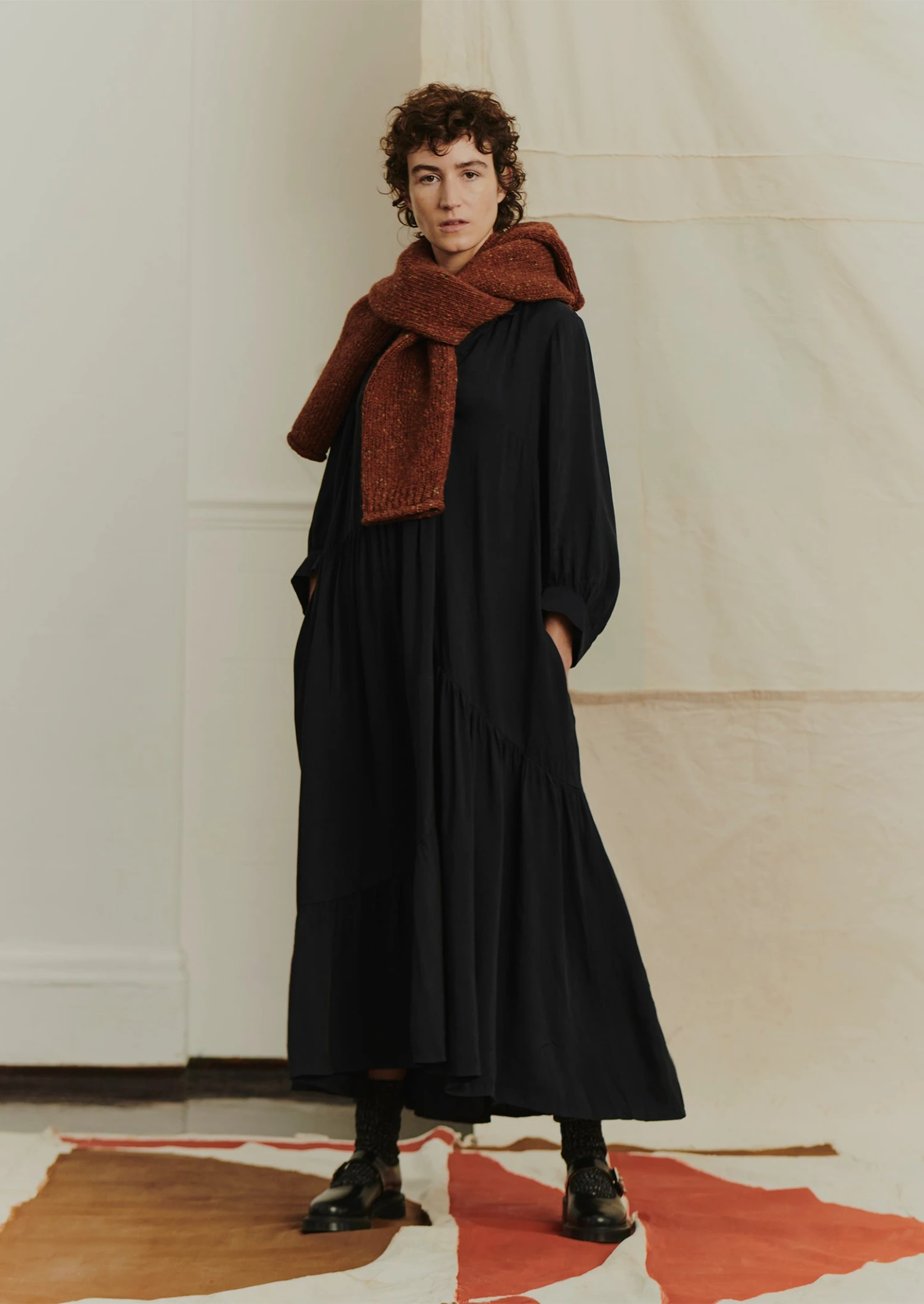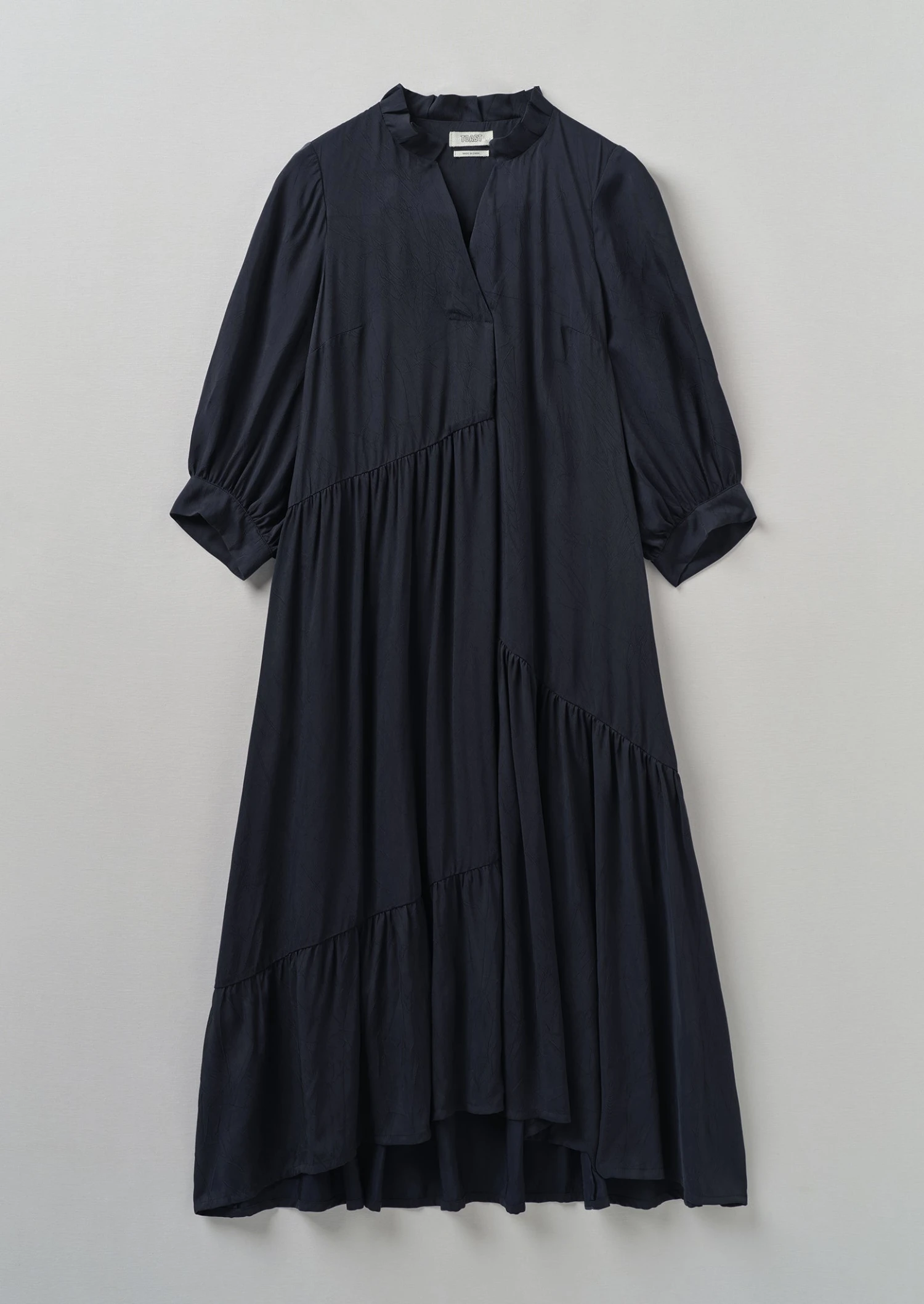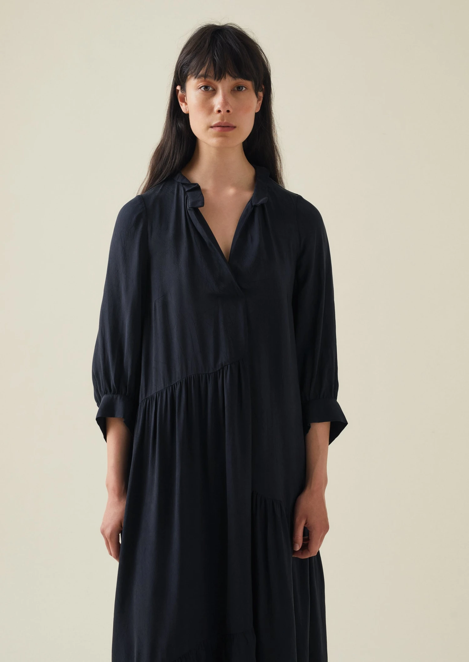 Our dress is crafted from twill which is heat-pressed with creases before it is dyed for a worn-in look. Cut to a loose, free shape with asymmetric gathered panels for added movement, falling to a lower-calf length dip hem.