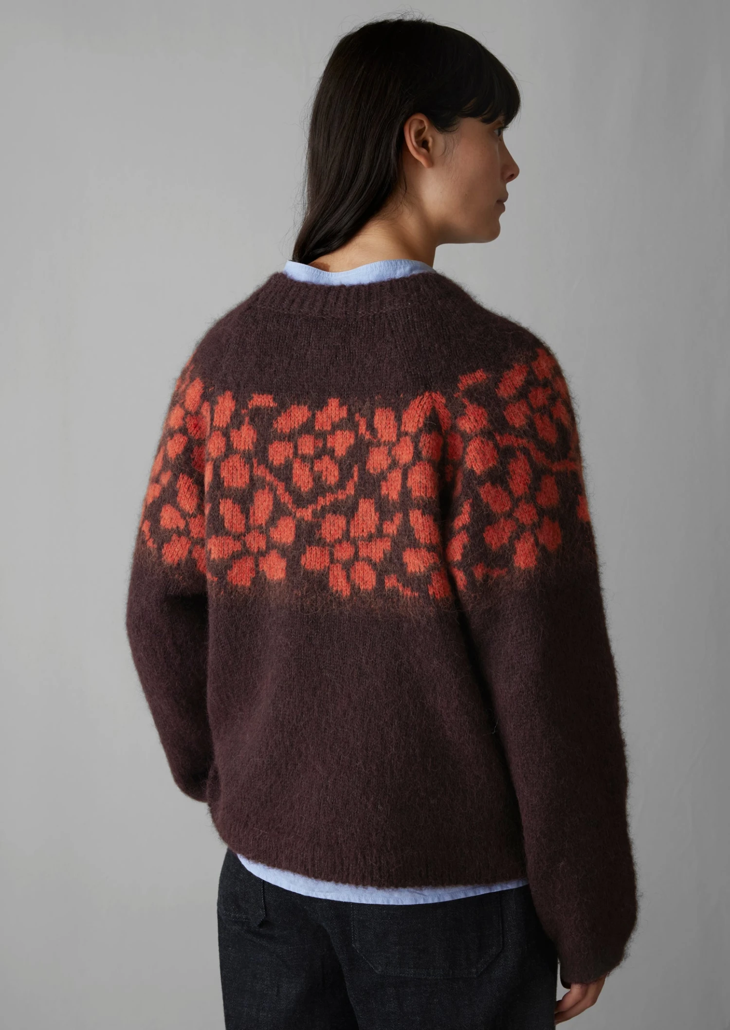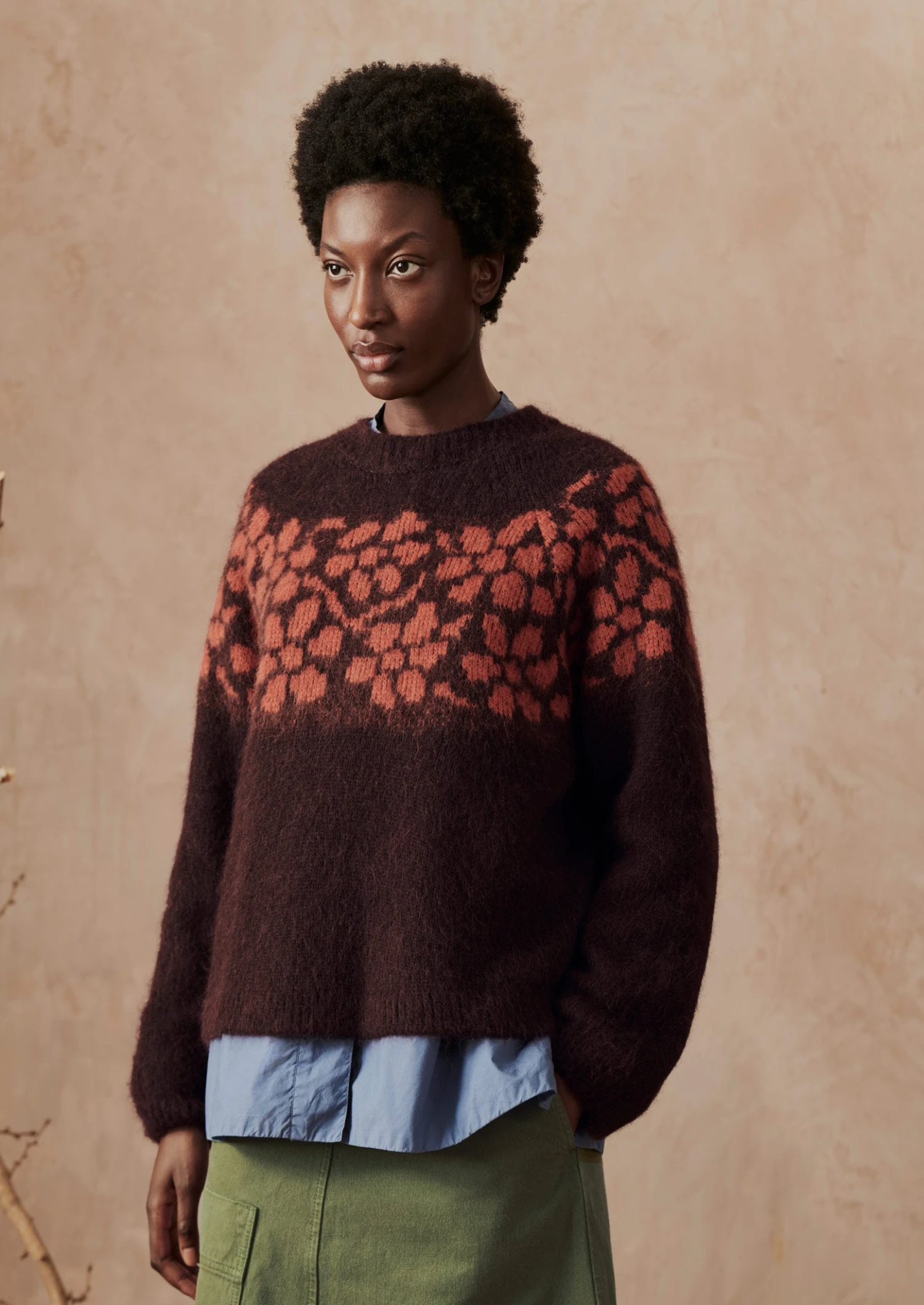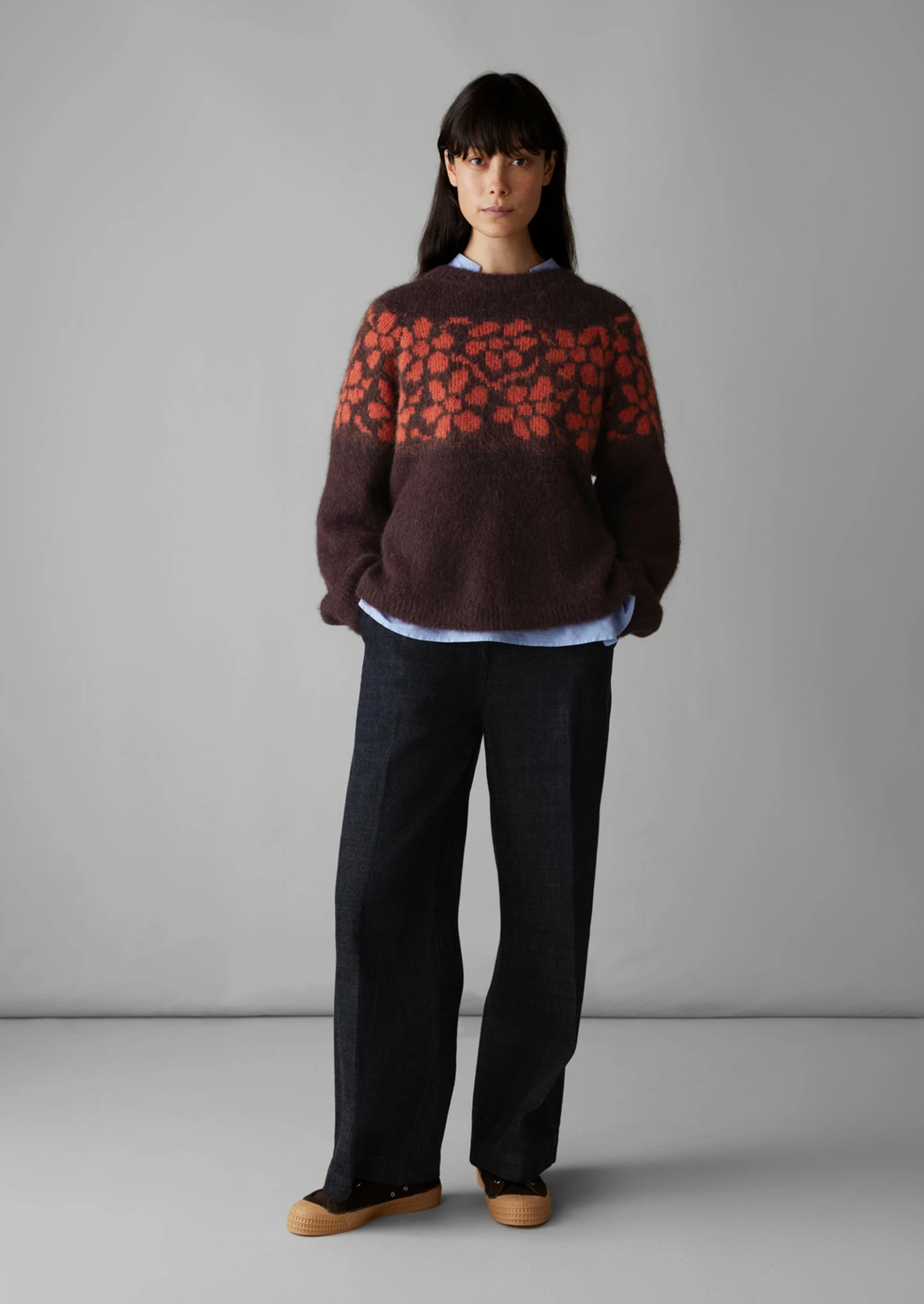 A trailing floral jacquard pattern runs across the yoke of our sweater, inspired by the tradition of floral folk art. Knitted from a lofty blend of alpaca, cotton and wool to an easy silhouette with a shaped yoke.