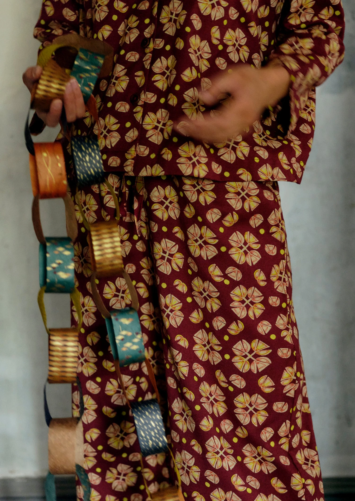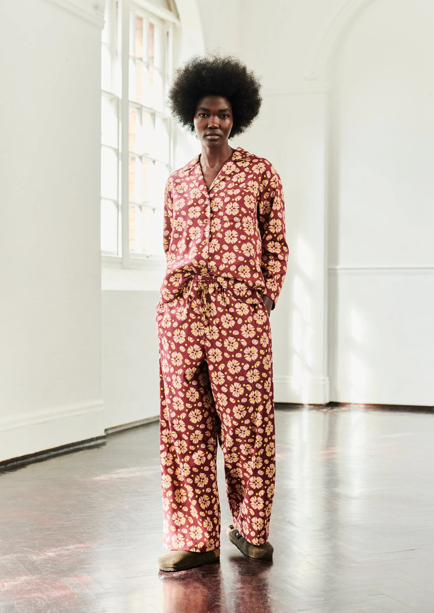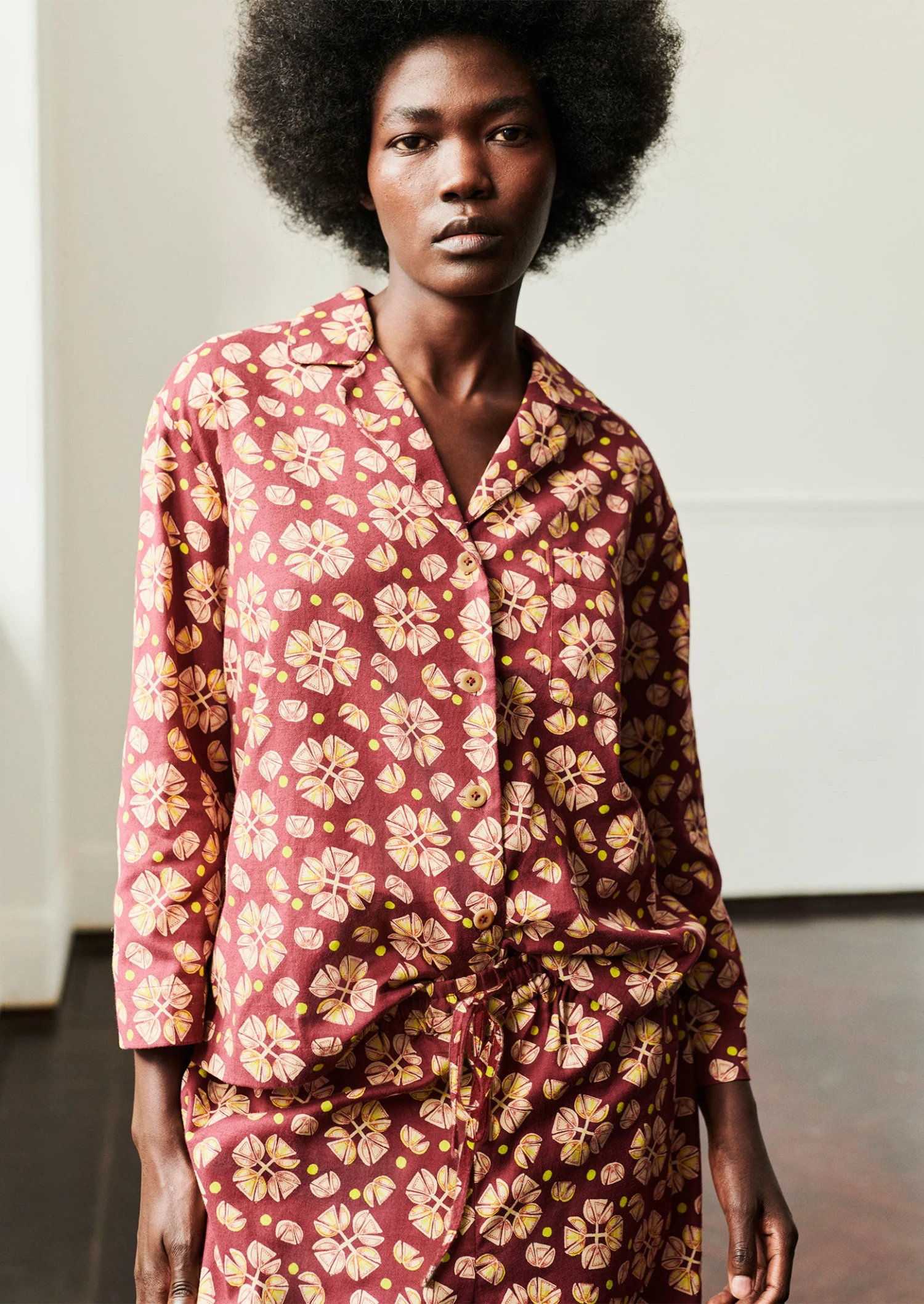 Tulip-print cotton flannel. Top: Rounded collar. Back cotton herringbone hanging loop. Gathered back. Chest patch pocket. Bracelet-length sleeves. Corozo buttons. Trousers: Elasticated waist. Cotton herringbone drawstrings. Side pockets. Cropped legs.