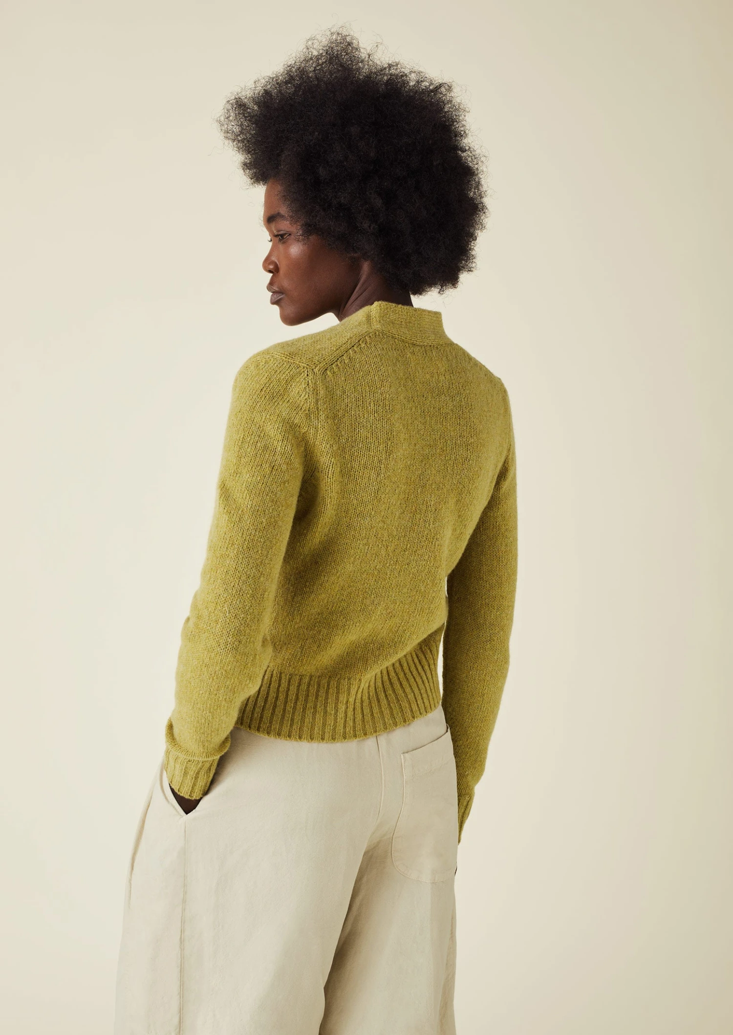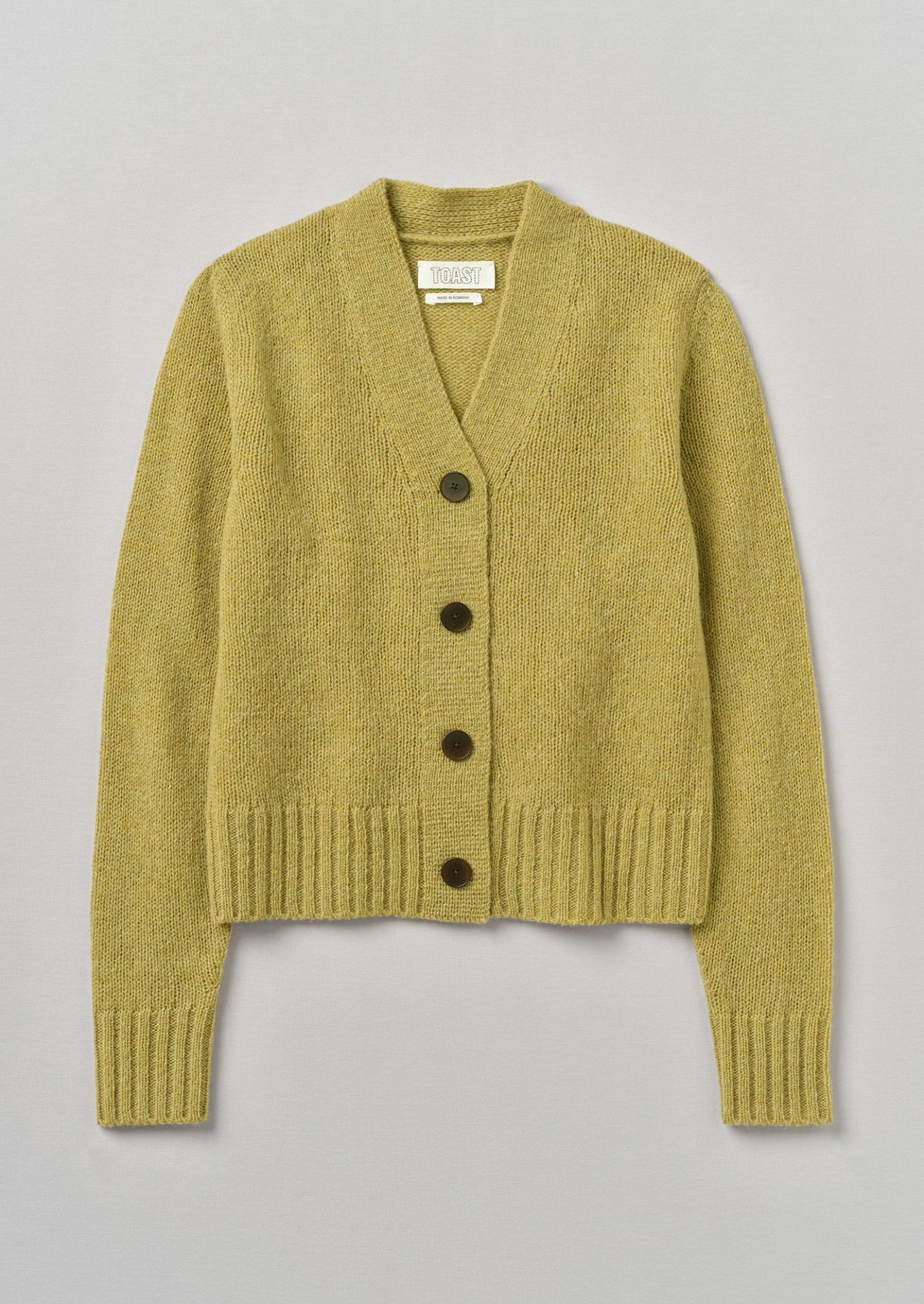 Heathered wool. Neat shape. High V-neck. Set-back shoulders. Top-hip length. Ribbed cuffs and hem. Wide integral placket. Corozo buttons.
