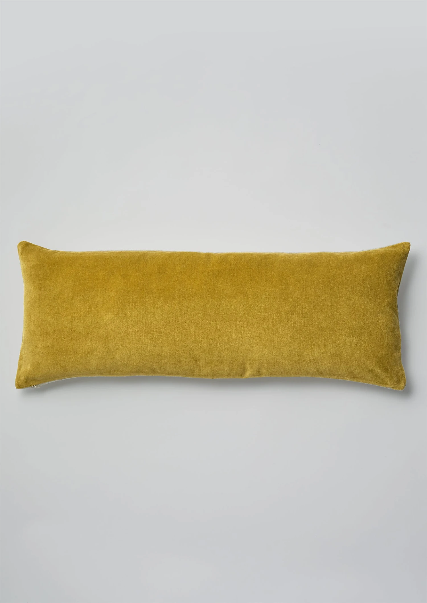 Soft, simple bolster cushion crafted from lustrous hand-dyed cotton velvet with a plain, slubby linen reverse. Finished with a concealed side-seam zip that opens to the included soft British wool cushion pad.