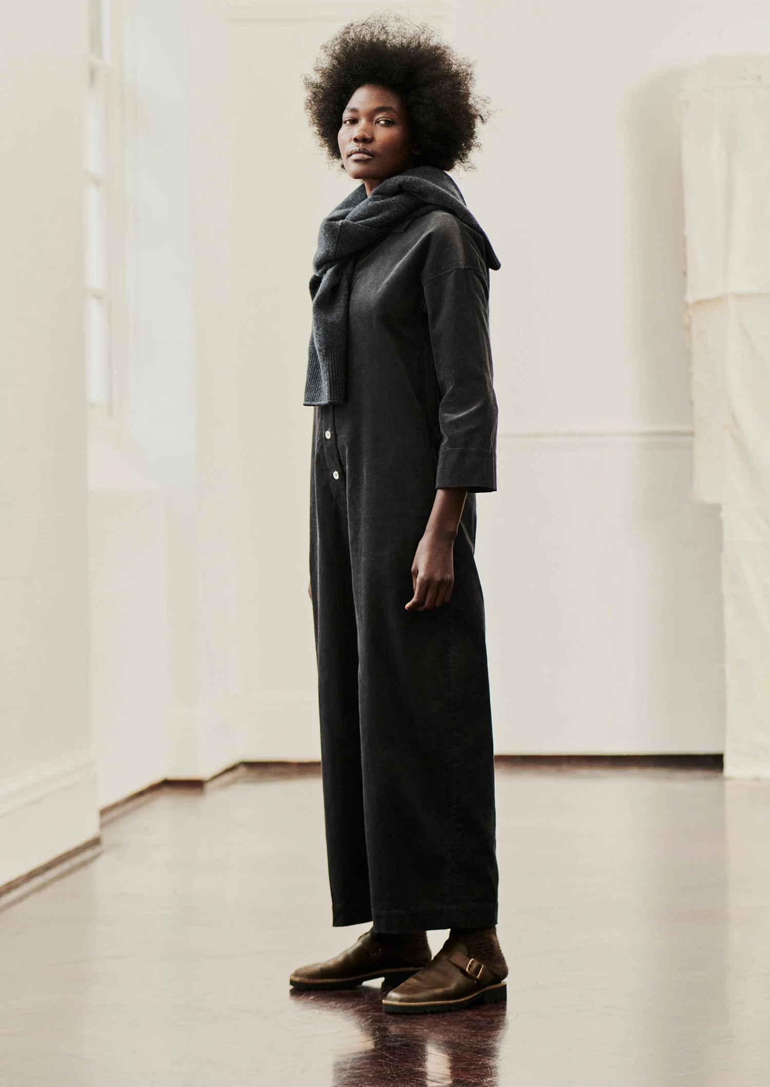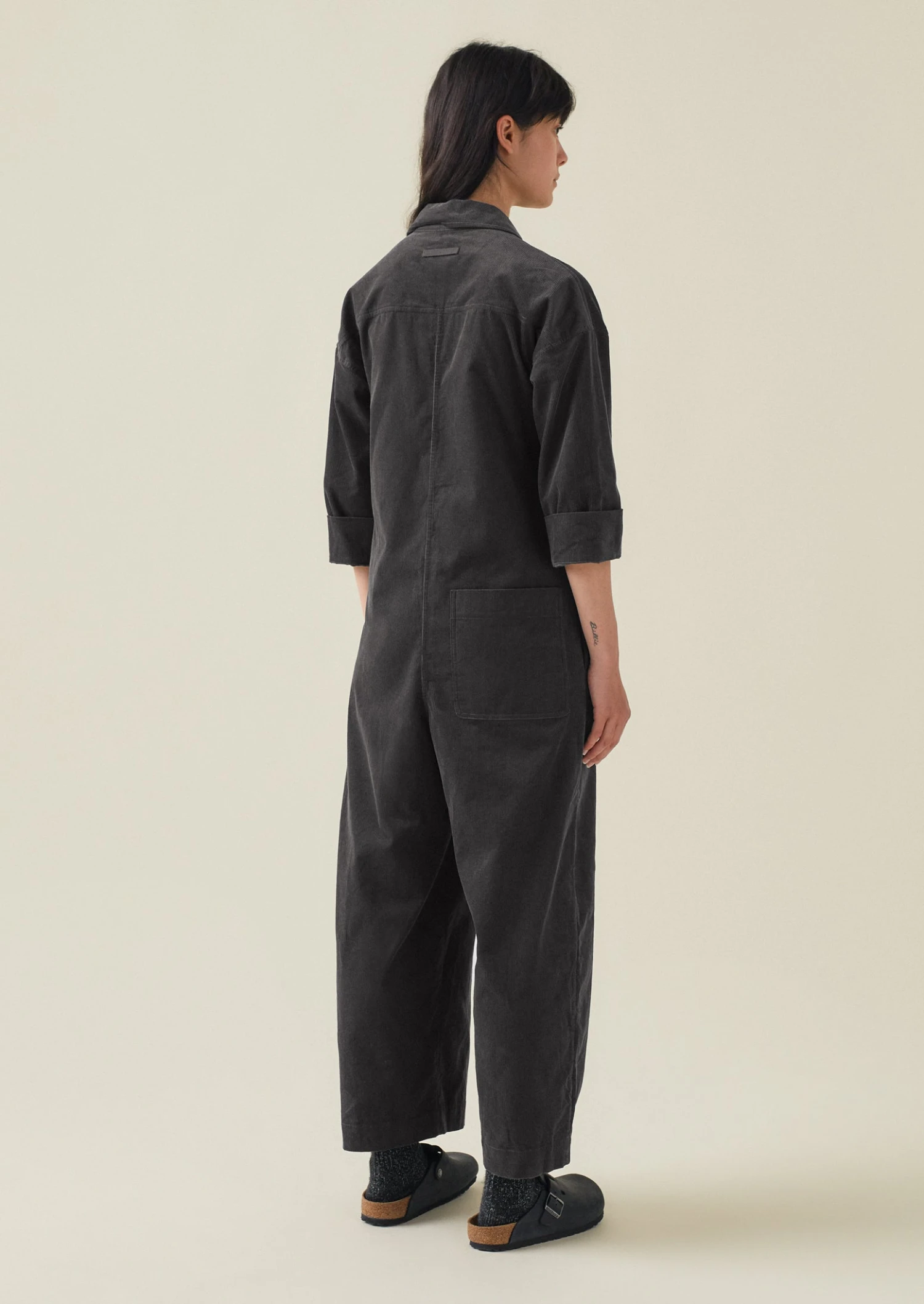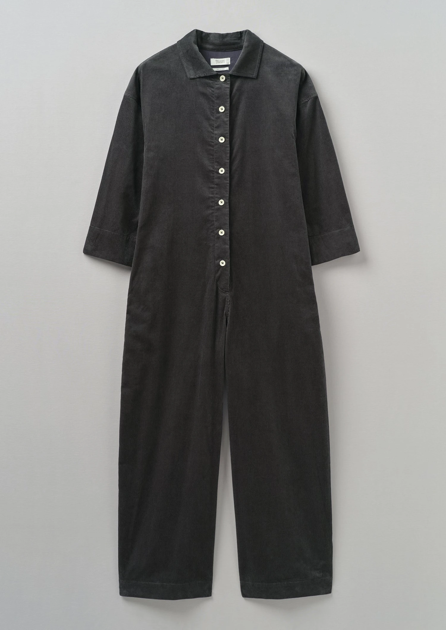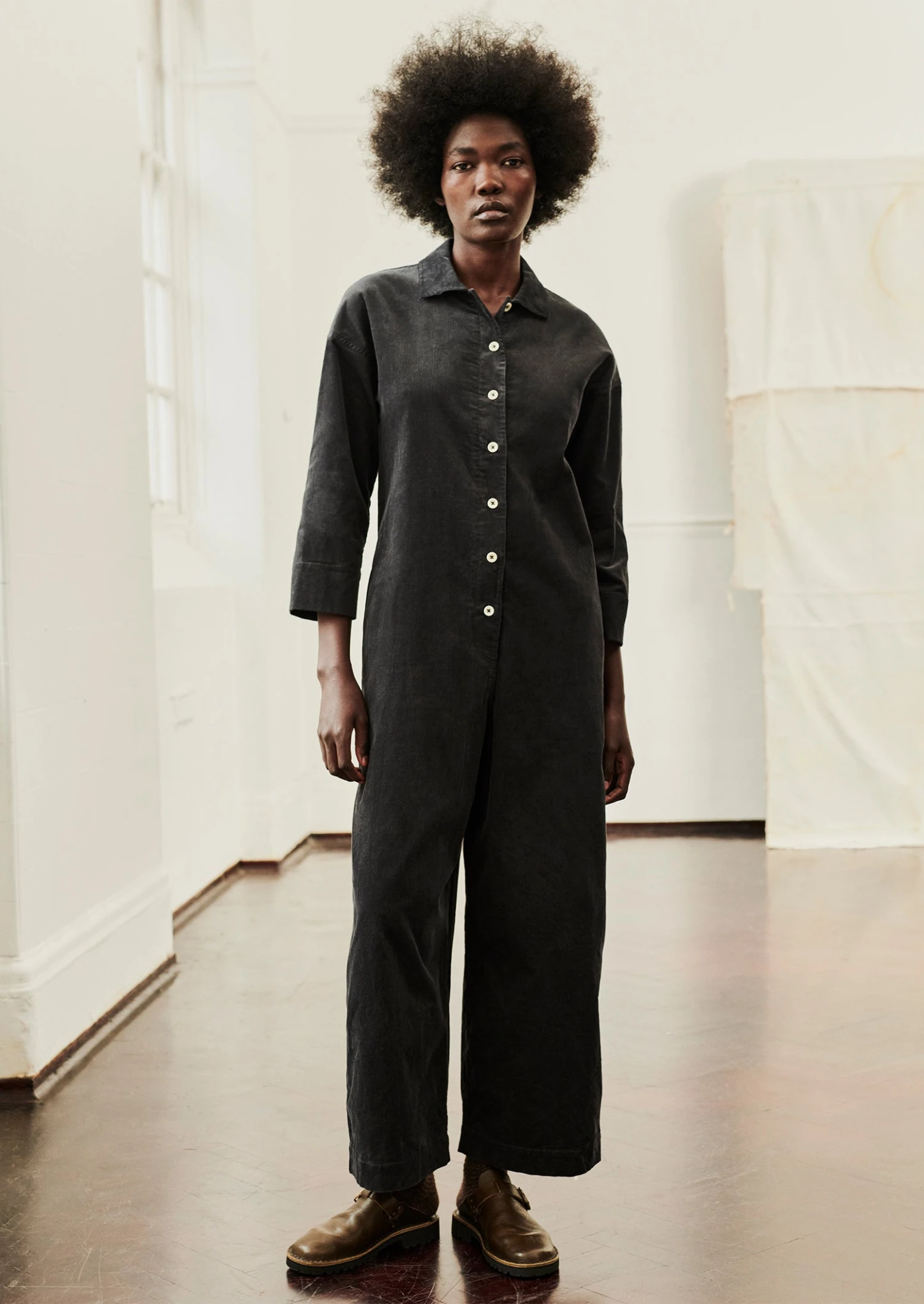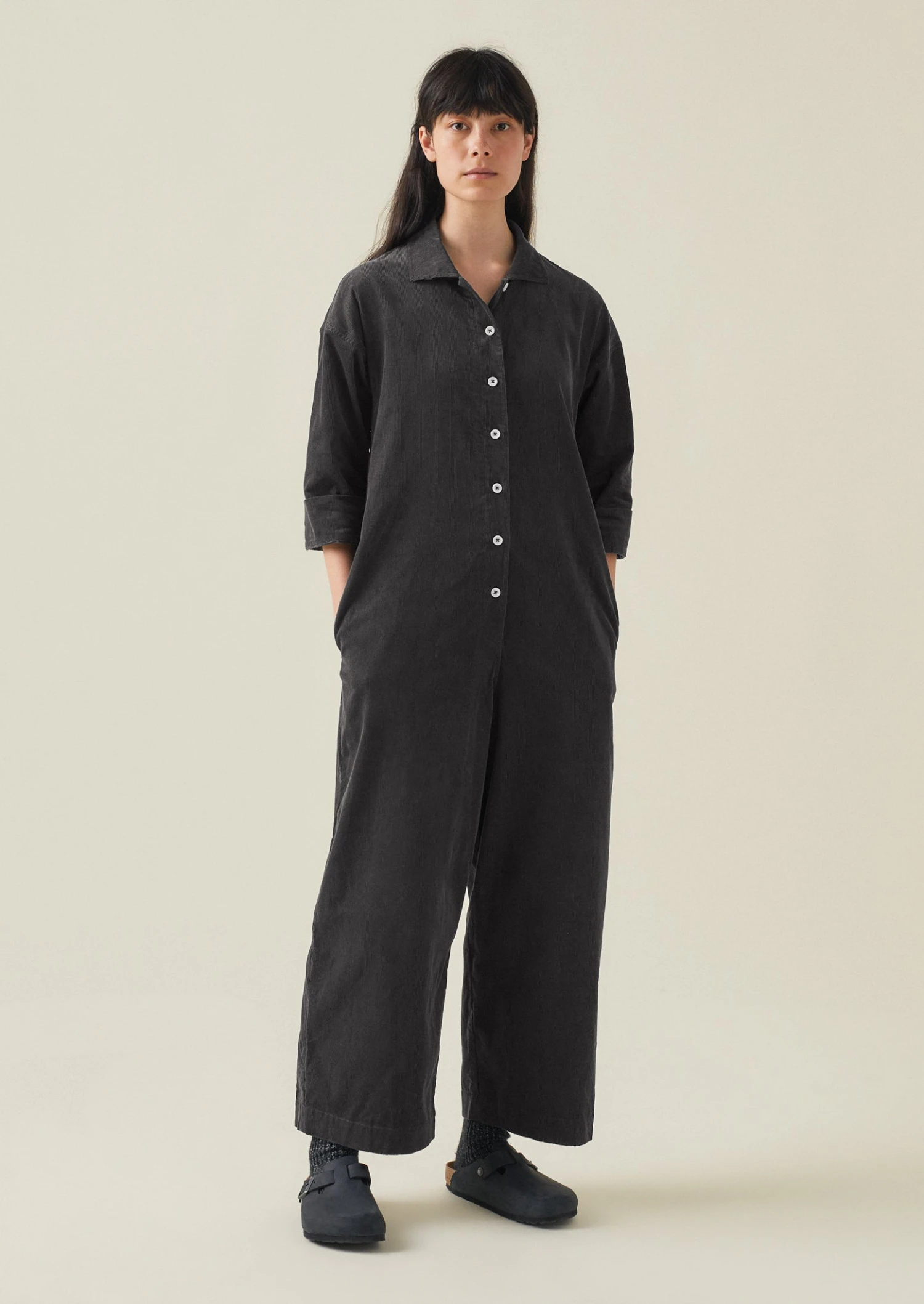 Dropped sleeves and wide legs underscore the relaxed nature of our jumpsuit. Crafted from soft and supple organic cotton cord with dropped sleeves, turning to reveal a nape hanging loop and a single patch pocket.