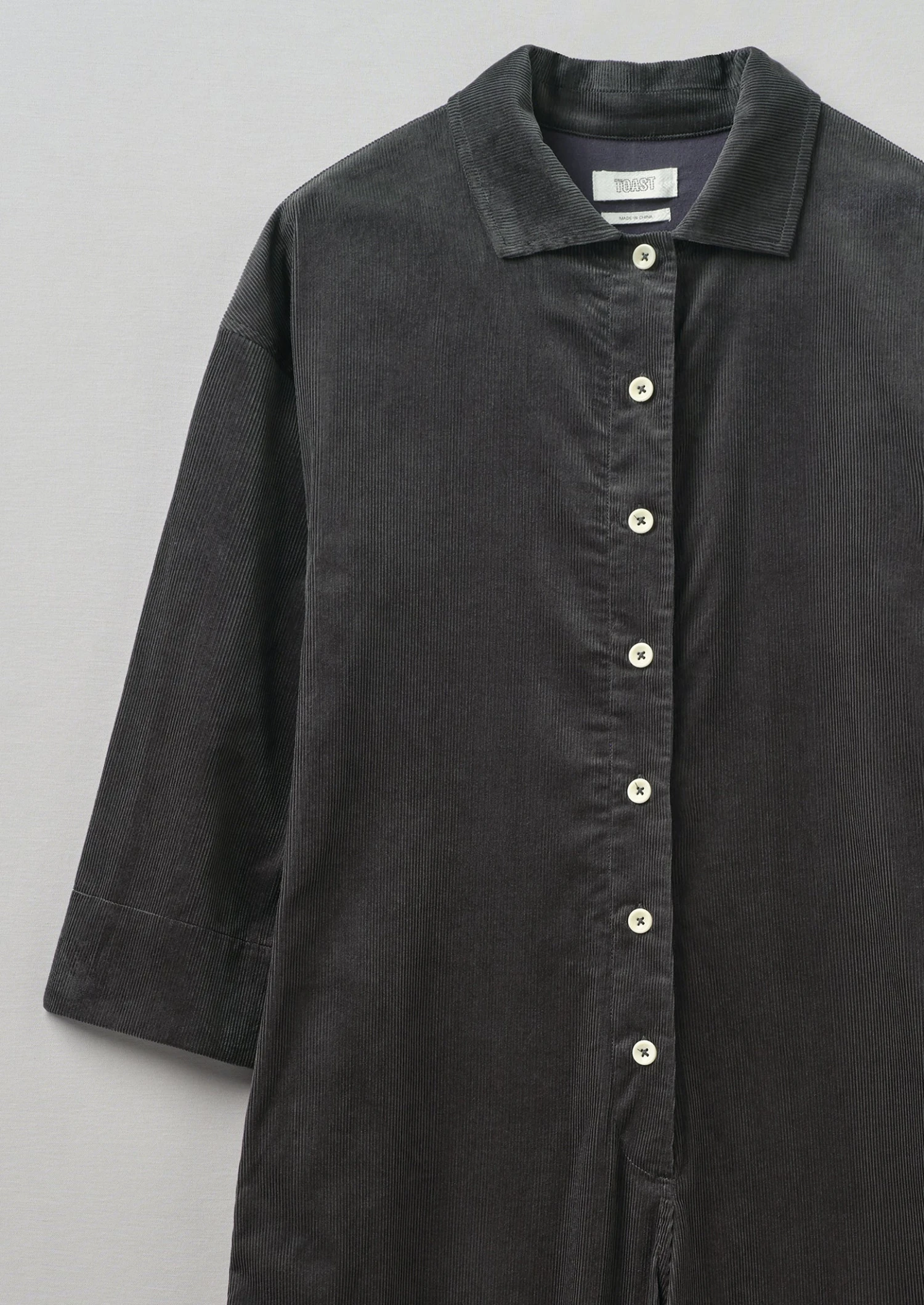 Organic cotton cord. Easy shape. Back cotton herringbone hanging loop. Wristbone-length dropped sleeves. Side seam pockets. Centre-back seam. Back patch pocket. Ankle-skimming wide legs. Corozo buttons.