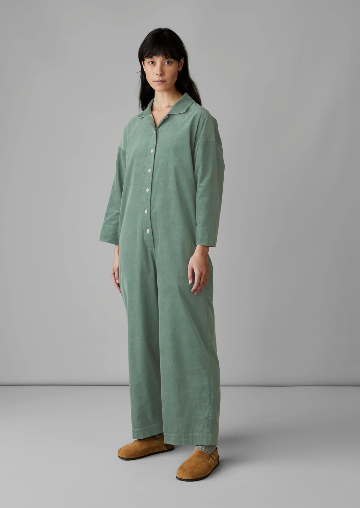 Organic cotton cord. Easy shape. Back cotton herringbone hanging loop. Wristbone-length dropped sleeves. Side seam pockets. Centre-back seam. Back patch pocket. Ankle-skimming wide legs. Corozo buttons.