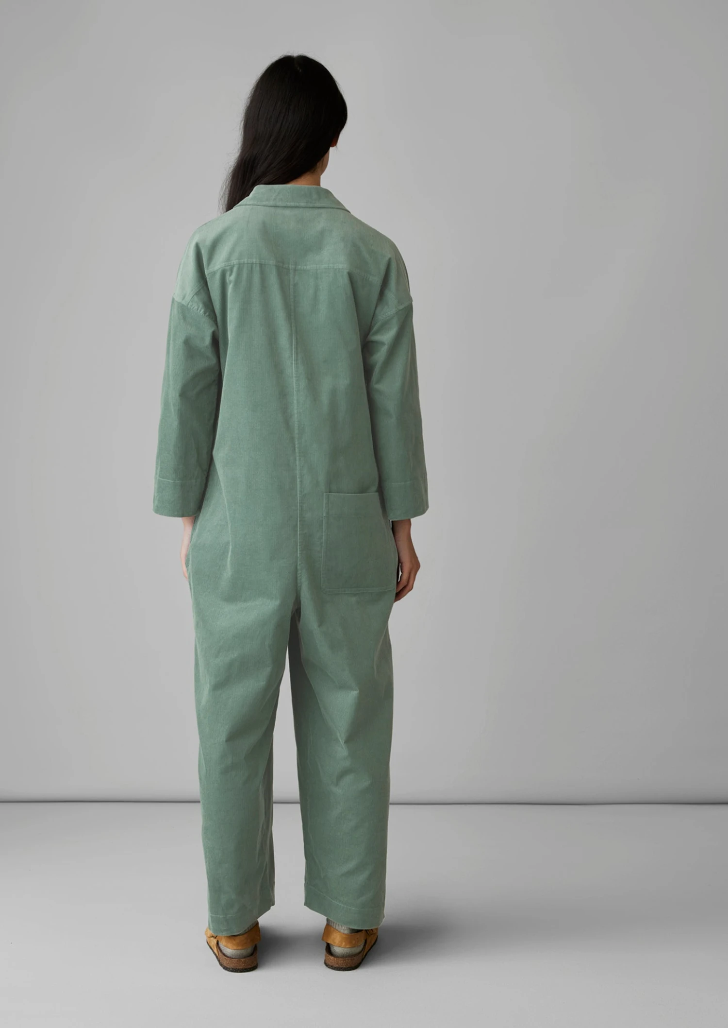 Dropped sleeves and wide legs underscore the relaxed nature of our jumpsuit. Crafted from soft and supple organic cotton cord with dropped sleeves, turning to reveal a nape hanging loop and a single patch pocket.