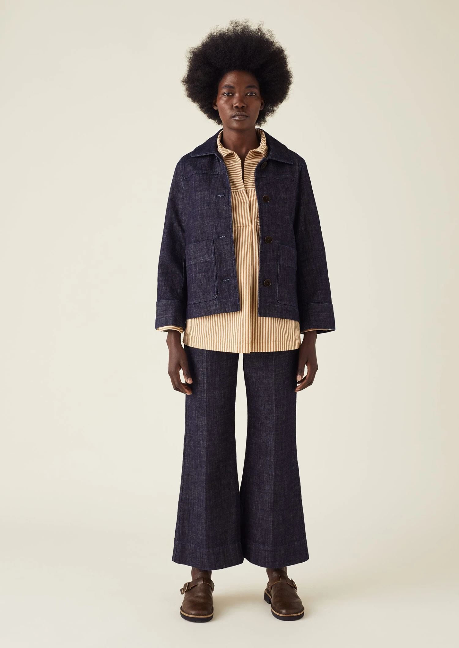 Organic cotton denim. Easy shape. Yoke panel. Wide sleeves. Side patch pockets. Internal hanging loop. Low-hip length. Corozo buttons.