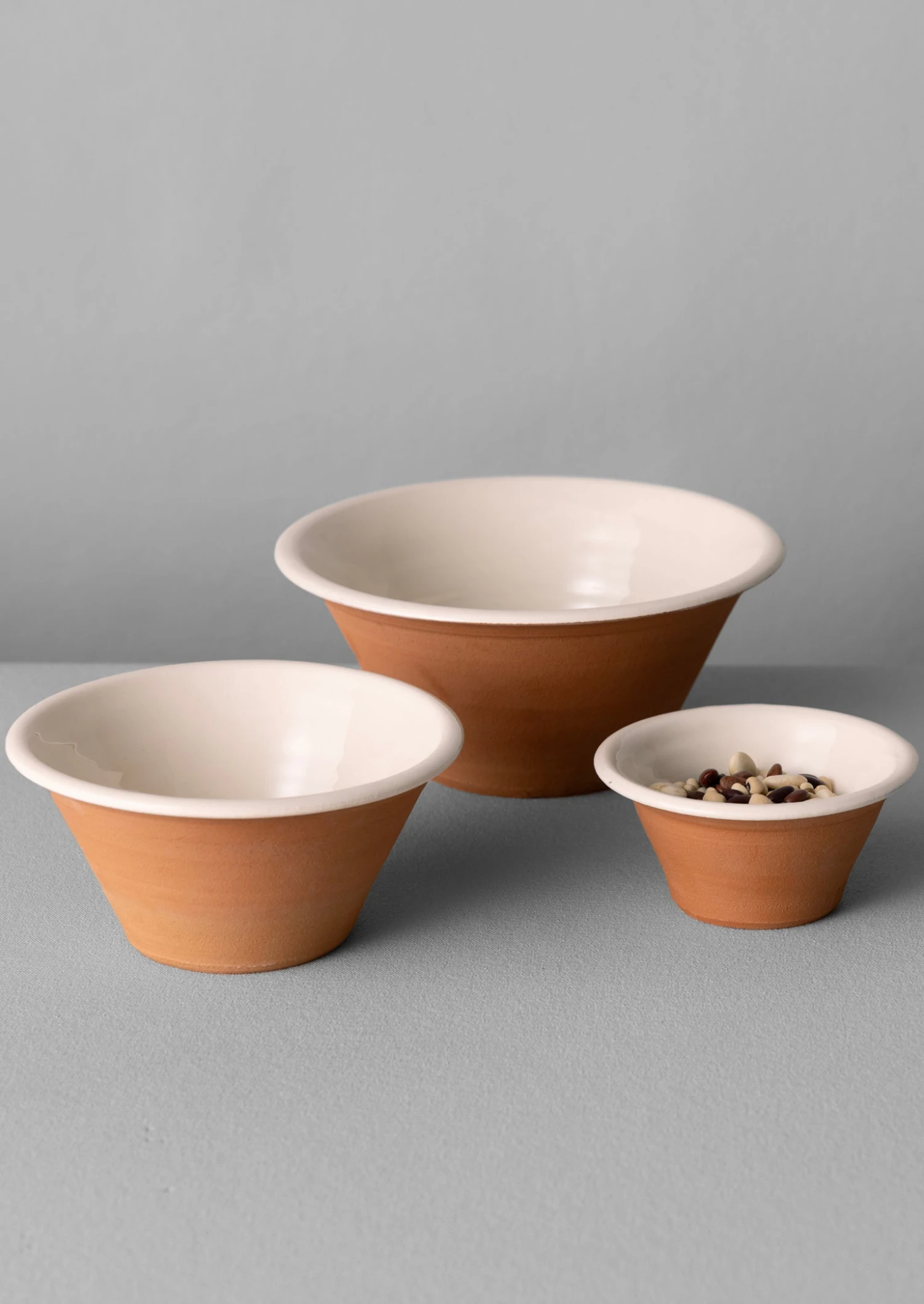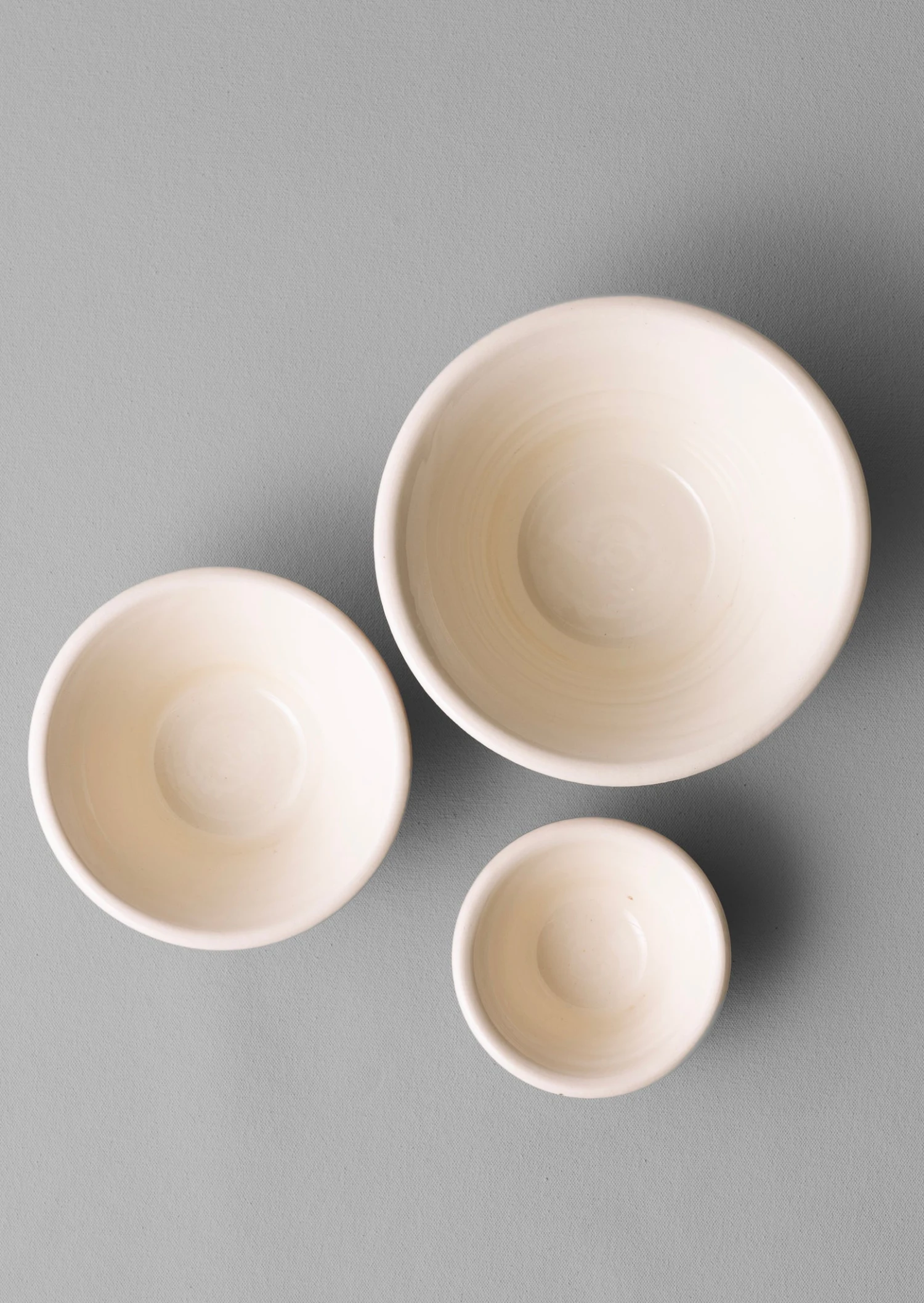 Set of three nesting bowls by the small team at Willow Pottery, founded over 25 years ago and based just outside Bath. Hand-thrown exclusively for TOAST to a tapered shape with a chunky rim. The raw unglazed outer is juxtaposed by the smooth glazed interior. Each varies slightly in shape and glaze tone.
