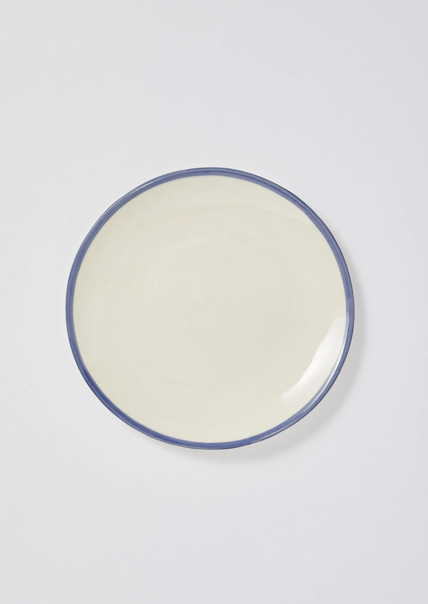 Small side plate made from hand-pressed stoneware, with a hand-painted slip border and transparent glaze. Each strong yet light piece is made from locally dug clay that has been worked into shape by hand. It is left to dry in the sun for five days, naturally hardening before firing. Based in the city of George in South Africa, Wonki Ware has worked with over 100 local South Africans, and provided them with skilled training in pottery whilst uplifting the community.