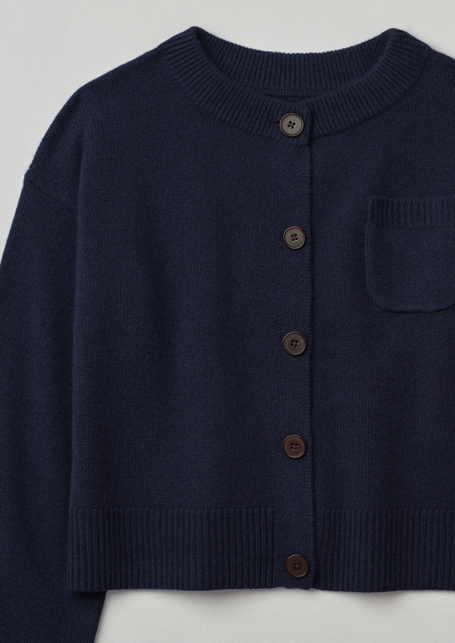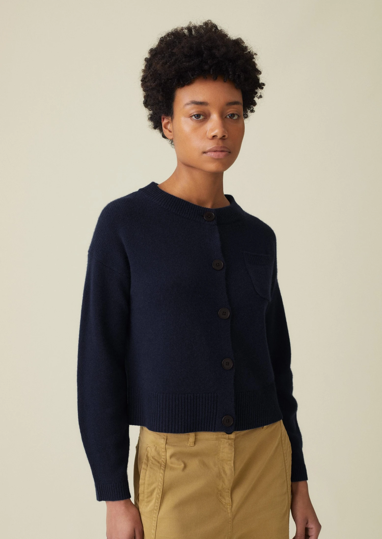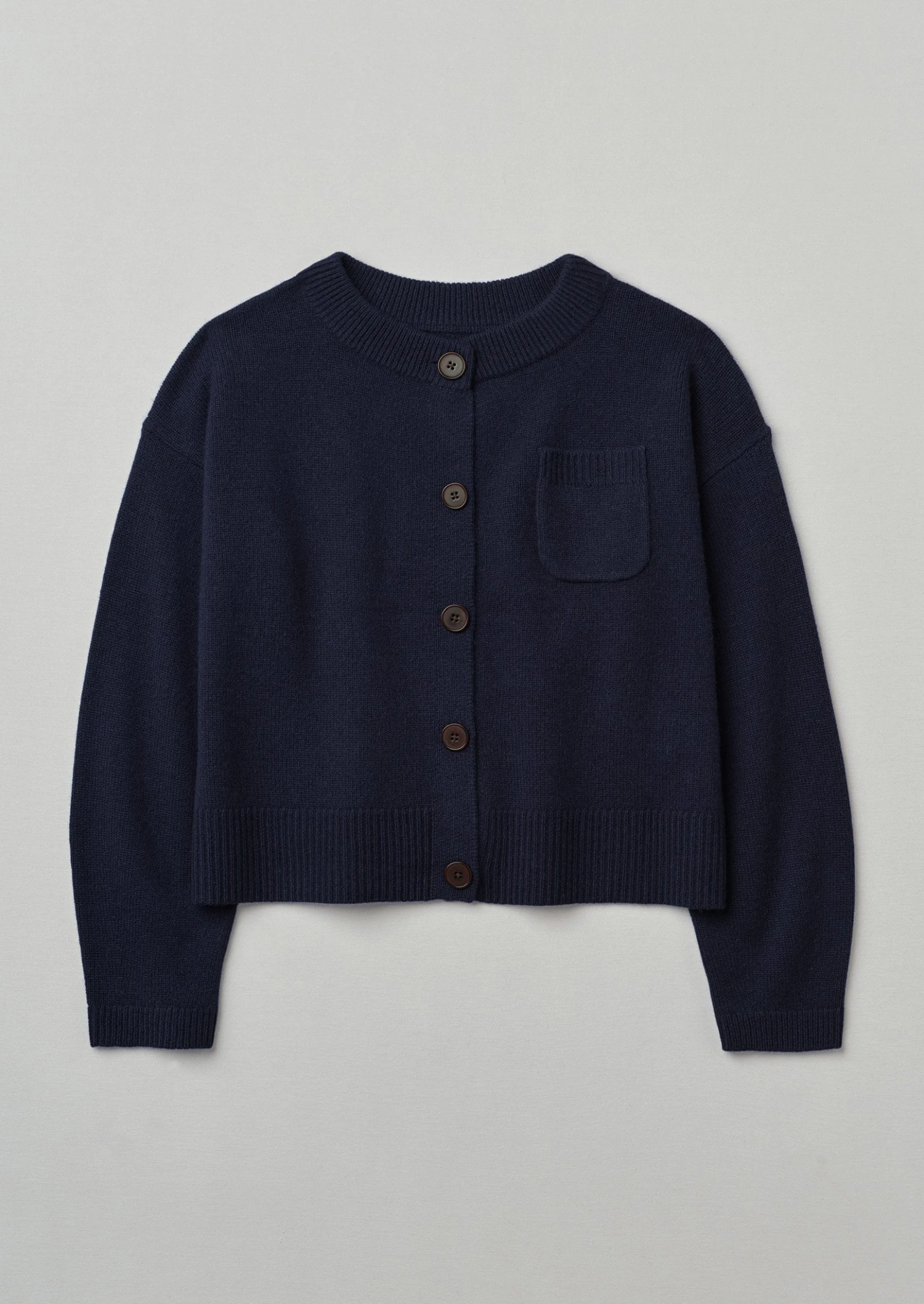 Our cardigan is knitted from a soft wool blended with cashmere. Shaped to a boxy shape with a slightly cropped length and dropped sleeves which are softly rounded above the cuffs, then accented by a rounded chest patch pocket.
